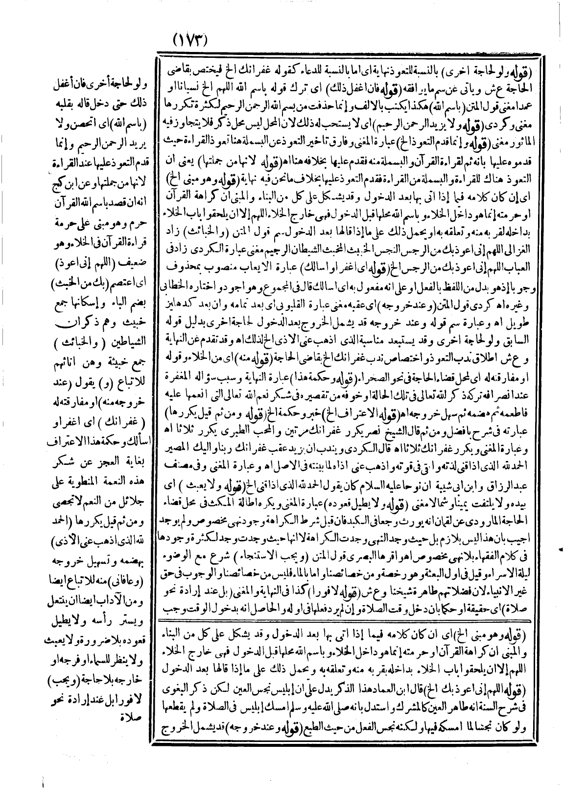 وَلَوْ لِحَاجَةٍ أُخْرَى، فَإِنْ أَغْفَلَ ذَلِكَ حَتَّى دَخَلَ قَالَهُ بِقَلْبِهِ (بِاسْمِ اللَّهِ) أَيْ أَتَحَصَّنُ وَلَا يَزِيدُ " الرَّحْمَنِ الرَّحِيمِ "، وَإِنَّمَا قُدِّمَ التَّعَوُّذُ عَلَيْهَا عِنْدَ الْقِرَاءَةِ؛ لِأَنَّهَا مِنْ جُمْلَتِهَا وَعَنْ ابْنِ كَجٍّ أَنَّهُ إنْ قَصَدَ بِاسْمِ اللَّهِ الْقُرْآنَ حَرُمَ، وَهُوَ مَبْنِيٌّ عَلَى حُرْمَةِ قِرَاءَةِ الْقُرْآنِ فِي الْخَلَاءِ، وَهُوَ ضَعِيفٌ (اللَّهُمَّ إنِّي أَعُوذُ) أَيْ أَعْتَصِمُ (بِك مِنْ الْخُبُثِ) بِضَمِّ الْبَاءِ وَإِسْكَانِهَا جَمْعُ خَبِيثٍ وَهُمْ ذُكْرَانُ الشَّيَاطِينِ (وَالْخَبَائِثِ) جَمْعُ خَبِيثَةٍ وَهُنَّ إنَاثُهُمْ لِلِاتِّبَاعِ (وَ) يَقُولُ (عِنْدَ خُرُوجِهِ مِنْهُ) أَوْ مُفَارَقَتِهِ لَهُ (غُفْرَانَك) أَيْ اغْفِرْ أَوْ أَسْأَلُك وَحِكْمَةُ هَذَا، الِاعْتِرَافُ بِغَايَةِ الْعَجْزِ عَنْ شُكْرِ هَذِهِ النِّعْمَةِ الْمُنْطَوِيَةِ عَلَى جَلَائِلَ مِنْ النِّعَمِ لَا تُحْصَى وَمِنْ ثَمَّ قِيلَ يُكَرِّرُهَا (الْحَمْدُ لِلَّهِ الَّذِي أَذْهَب عَنِّي الْأَذَى) بِهَضْمِهِ وَتَسْهِيلِ خُرُوجِهِ (وَعَافَانِي) مِنْهُ لِلِاتِّبَاعِ أَيْضًا وَمِنْ الْآدَابِ أَيْضًا أَنْ يَنْتَعِلَ، وَيَسْتُرَ رَأْسَهُ وَلَا يُطِيلُ قُعُودَهُ بِلَا ضَرُورَةٍ وَلَا يَعْبَثُ وَلَا يَنْظُرُ لِلسَّمَاءِ أَوْ فَرْجِهِ أَوْ خَارِجَهُ بِلَا حَاجَةٍ