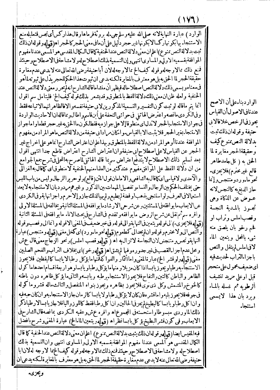 (قَوْلُهُ: وَقَوْلُهُ إنَّ ذَلِكَ ثَبَتَ بِدَلَالَةِ النَّصِّ مَمْنُوعٌ) اعْلَمْ أَنَّ مَعْنَى دَلَالَةِ النَّصِّ عِنْدَ الْحَنَفِيَّةِ كَمَا قَالَ الْكَمَالُ الْمَقْدِسِيَّ هُوَ الْمُسَمَّى عِنْدَنَا مَفْهُومُ الْمُوَافَقَةِ بِقِسْمَيْهِ الْأَوْلَى وَالْمُسَاوِي انْتَهَى، وَأَنَّ التَّسْمِيَةَ بِذَلِكَ اصْطِلَاحٌ لَهُ وَلَا مُشَاحَّةَ فِي الِاصْطِلَاحِ وَحِينَئِذٍ فَمَنْعُ ذَلِكَ مِمَّا لَا وَجْهَ لَهُ وَقَوْلُهُ كَيْفَ إلَخْ مِمَّا لَا وَجْهَ لَهُ؛ لِأَنَّ أَبَا حَنِيفَةَ - رَضِيَ اللَّهُ تَعَالَى عَنْهُ - لَا يَدَّعِي عَدَمَ مُغَايَرَةِ حَقِيقَةِ الْحَجَرِ لِمَا أُلْحِقَ بِهِ بَلْ هُوَ مُعْتَرِفٌ بِالْمُغَايَرَةِ لَكِنَّهُ يَدَّعِي أَنَّ ثُبُوتَ هَذَا الْحُكْمِ لِلْحَجَرِ يَدُلُّ عَلَى ثُبُوتِهِ لِمَا هُوَ فِي مَعْنَاهُ وَيُسَمَّى ذَلِكَ دَلَالَةُ النَّصِّ اصْطِلَاحًا لَهُ فَيَظْهَرُ أَنَّ مَنْشَأَ مَا قَالَهُ الشَّارِحُ أَنَّهُ لَمْ يُحَرَّرْ مَعْنَى دَلَالَةِ النَّصِّ عِنْدَ الْحَنَفِيَّةِ وَلَعَلَّهُ ظَنَّ أَنَّ مَعْنَى ذَلِكَ دَلَالَةُ اللَّفْظِ بِالْمَنْطُوقِ وَقَدْ يُشْعِرُ بِذَلِكَ قَوْلُهُ: كَيْفَ إلَخْ فَلْيُتَأَمَّلْ سم أَقُولُ إنَّمَا يَتِمُّ مَا قَالَهُ لَوْ ثَبَتَ كَوْنُ التَّفْسِيرِ وَالتَّسْمِيَةِ الْمَذْكُورَيْنِ لِأَبِي حَنِيفَةَ نَفْسِهِ وَإِلَّا فَالظَّاهِرُ أَنَّهُمَا لِأَتْبَاعِهِ فَقَطْ وَفِي الْكُرْدِيِّ مَا نَصُّهُ وَاعْتَرَضَ الْهَاتِفِيُّ فِي حَوَاشِي التُّحْفَةِ عَلَى ابْنِ قَاسِمٍ وَأَطَالَ وَمِمَّا قَالَهُ إنَّ الْأَحَادِيثَ الْوَارِدَةَ فِي جَوَازِ الِاسْتِنْجَاءِ بِالْحَجَرِ لَا تَدُلُّ أَيْ مَنْطُوقًا إلَّا عَلَى جَوَازِهِ بِهِ فَقَطْ لِكَوْنِ مَا أُلْحِقَ بِهِ غَيْرُ حَجَرٍ قَطْعًا وَأَمَّا جَوَازُ الِاسْتِنْجَاءِ بِغَيْرِ الْحَجَرِ فَلَا يَثْبُتُ إلَّا بِالْقِيَاسِ سَوَاءٌ كَانَ مُرَادُ أَبِي حَنِيفَةَ مِنْ دَلَالَةِ النَّصِّ مَا هُوَ الْمُرَادُ مِنْ مَفْهُومِ الْمُوَافَقَةِ عِنْدَنَا أَوْ هُوَ الْمُرَادُ مِنْ دَلَالَةِ اللَّفْظِ بِالْمَنْطُوقِ وَبِهَذَا عُلِمَ أَنَّ اعْتِرَاضَ الشَّارِحِ إنَّمَا هُوَ عَلَى إخْرَاجِ غَيْرِ الْحَجَرِ عَنْ الْقِيَاسِ لَا عَلَى اصْطِلَاحِ أَبِي حَنِيفَةَ وَأَنَّ اعْتِرَاضَ الشَّارِحِ اعْتِرَاضٌ قَاطِعٌ جِدًّا انْتَهَى اهـ.