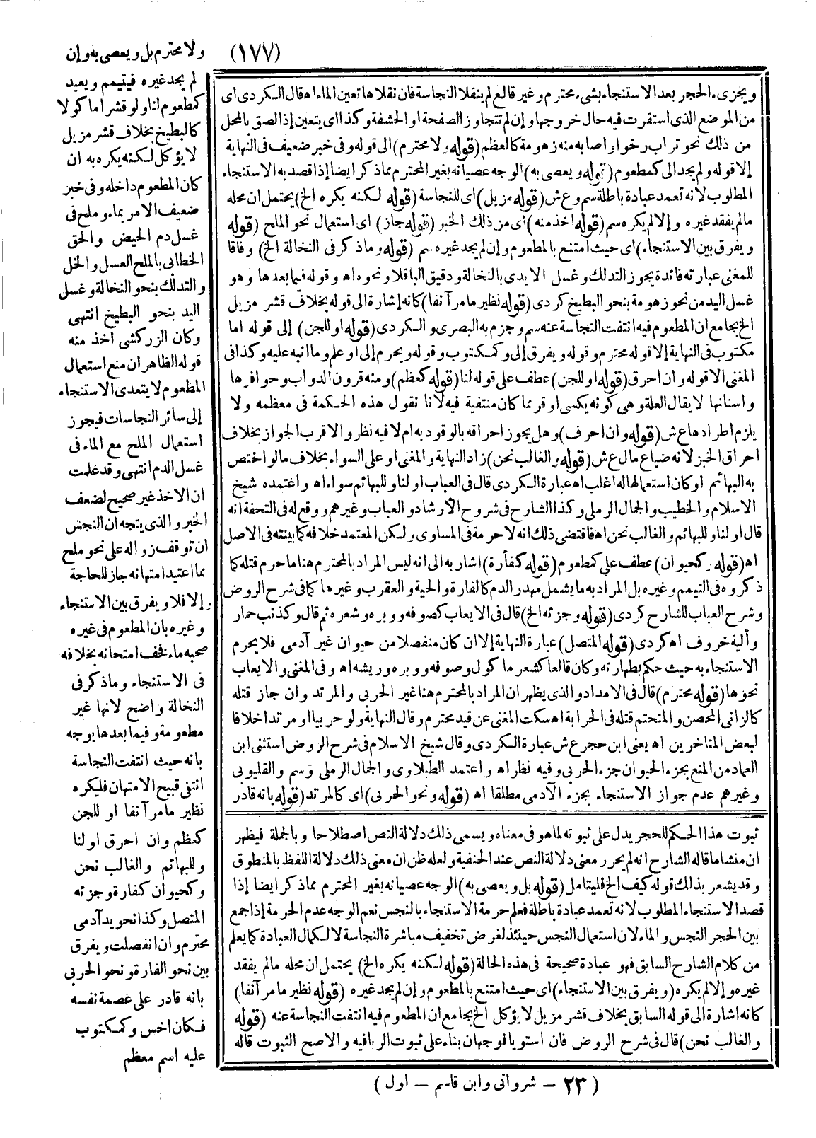 وَقَالَ شَيْخُ الْإِسْلَامِ فِي شَرْحِ الرَّوْضِ اسْتَثْنَى ابْنُ الْعِمَادِ مِنْ الْمَنْعِ بِجُزْءِ الْحَيَوَانِ جُزْءَ الْحَرْبِيِّ وَفِيهِ نَظَرٌ اهـ وَاعْتَمَدَ الطَّبَلَاوِيُّ وَالْجَمَالُ الرَّمْلِيُّ وَسَمِّ وَالْقَلْيُوبِيُّ وَغَيْرُهُمْ عَدَمَ جَوَازِ الِاسْتِنْجَاءِ بِجُزْءِ الْآدَمِيِّ مُطْلَقًا اهـ (قَوْلُهُ: وَنَحْوِ الْحَرْبِيِّ) أَيْ كَالْمُرْتَدِّ (قَوْلُهُ بِأَنَّهُ قَادِرٌ