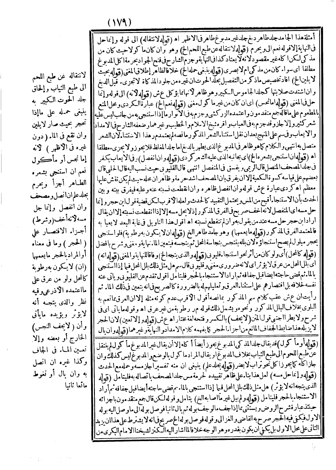 لِانْتِقَالِهِ عَنْ طَبْعِ اللَّحْمِ إلَى طَبْعِ الثِّيَابِ وَإِلْحَاقُ جِلْدِ الْحُوتِ الْكَبِيرِ بِهِ يَنْبَغِي حَمْلُهُ عَلَى مَا إذَا تَحَجَّرَ بِحَيْثُ صَارَ لَا يَلِينُ، وَإِنْ نُقِعَ فِي الْمَاءِ (دُونَ غَيْرِهِ فِي الْأَظْهَرِ) ؛ لِأَنَّهُ إمَّا نَجِسٌ أَوْ مَأْكُولٌ نَعَمْ إنْ اسْتَنْجَى بِشَعْرِهِ الطَّاهِرِ أَجْزَأَ، وَيَحْرُمُ بِجِلْدِ عِلْمٍ إنْ اتَّصَلَ وَمُصْحَفٍ، وَإِنْ انْفَصَلَ، وَإِنَّمَا حَلَّ مَسُّهُ؛ لِأَنَّهُ أَخَفُّ