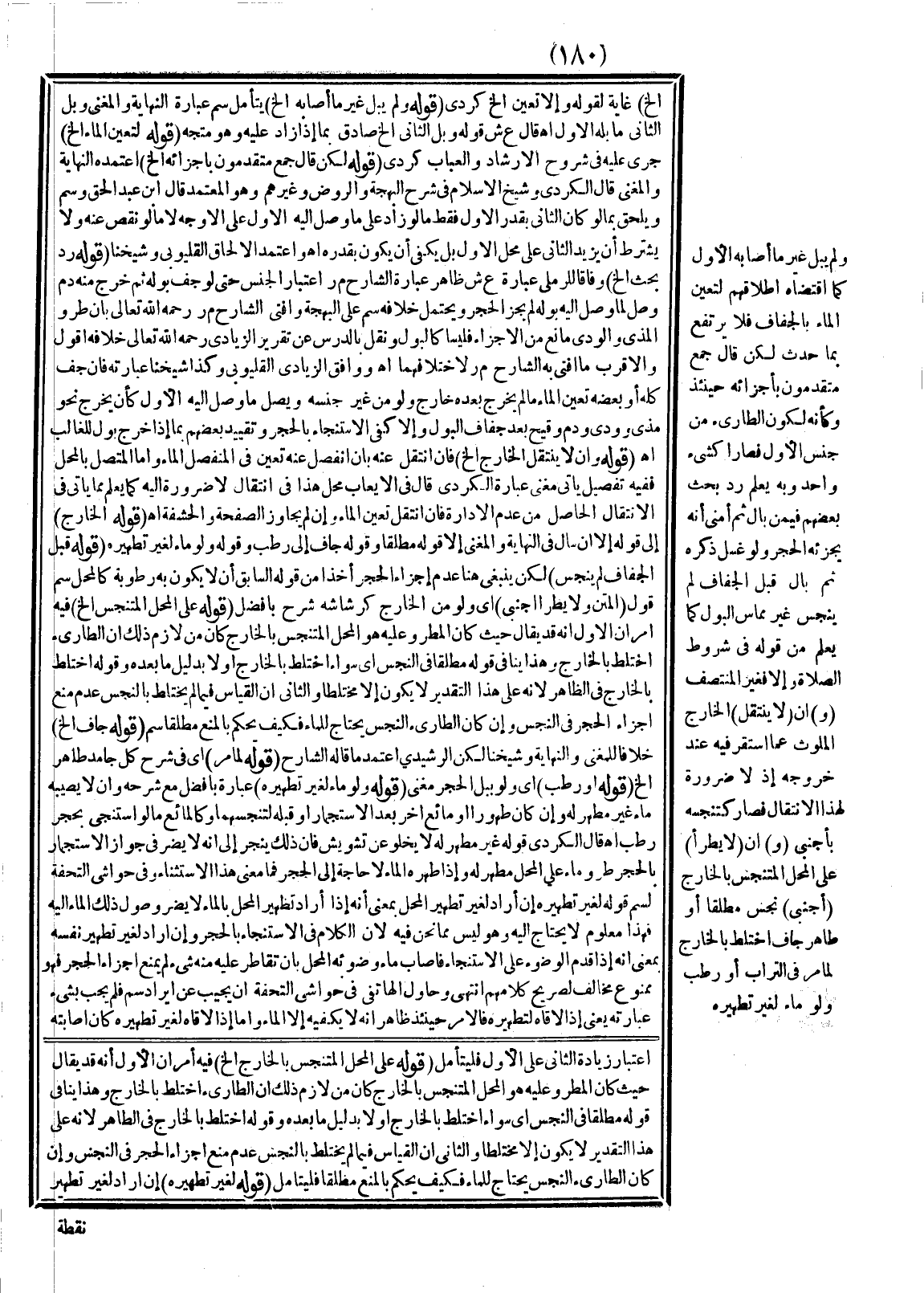 وَالثَّانِي أَنَّ الْقِيَاسَ فِيمَا لَمْ يَخْتَلِطْ بِالنَّجِسِ عَدَمُ مَنْعِ إجْزَاءِ الْحَجَرِ فِي النَّجِسِ، وَإِنْ كَانَ الطَّارِئُ النَّجِسُ يَحْتَاجُ لِلْمَاءِ فَكَيْفَ يُحْكَمُ بِالْمَنْعِ مُطْلَقًا فَلْيُتَأَمَّلْ (قَوْلُهُ: لِغَيْرِ تَطْهِيرِهِ) إنْ أَرَادَ لِغَيْرِ تَطْهِيرِ