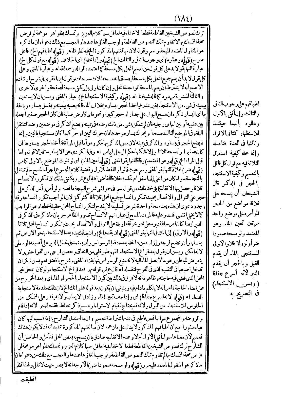 إطْبَاقُهُمْ عَلَى وُجُوبِ الثَّانِي وَالثَّالِثِ، وَإِنْ أَنْقَى بِالْأَوَّلِ وَعَلَّلُوهُ بِأَنَّهُمَا حِينَئِذٍ لِلِاسْتِظْهَارِ كَثَانِي الْأَقْرَاءِ وَثَالِثِهَا فِي الْعِدَّةِ فَتَأَمَّلْهُ، وَإِنَّمَا مَحَلُّهُ كَيْفِيَّةُ اسْتِعْمَالِ الثَّلَاثَةِ فِيهِ مَعَ قَوْلِ كُلِّ قَائِلٍ بِالتَّعْمِيمِ وَكَيْفِيَّةُ الِاسْتِنْجَاءِ بِالْحَجَرِ فِي الذَّكَرِ قَالَ الشَّيْخَانِ أَنْ يَمْسَحَهُ عَلَى ثَلَاثَةِ مَوَاضِعَ مِنْ الْحَجَرِ فَلَوْ أَمَرَّهُ عَلَى مَوْضِعٍ وَاحِدٍ مَرَّتَيْنِ تَعَيَّنَ الْمَاءُ، وَهُوَ الْمُعْتَمَدُ وَلَوْ مَسَحَهُ صُعُودًا ضَرَّ أَوْ نُزُولًا فَلَا وَالْأَوْلَى لِلْمُسْتَنْجِي بِالْمَاءِ أَنْ يُقَدِّمَ الْقُبُلَ وَبِالْحَجَرِ أَنْ يُقَدِّمَ الدُّبُرَ؛ لِأَنَّهُ أَسْرَعُ جَفَافًا