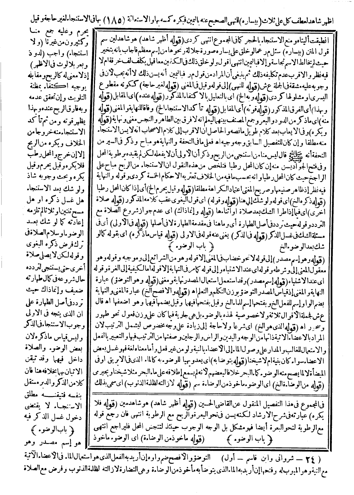 (قَوْلُهُ: وَبِهِ إلَخْ) أَيْ بِالتَّعْلِيلِ بِالِاكْتِفَاءِ الْمَذْكُورِ (قَوْلُهُ: عِنْدَهُ) أَيْ الْمُقَابِلِ (قَوْلُهُ: وَبِهَذَا) أَيْ الْفَرْقِ الْمَذْكُورِ (قَوْلُهُ: قُوَّتُهُ) أَيْ الْمُقَابِلِ (قَوْلُهُ: تَأَكَّدَ الِاسْتِنْجَاءُ إلَخْ) وِفَاقًا لِلنِّهَايَةِ وَالْمُغْنِي (قَوْلُهُ: مِنْهُ) أَيْ مَا ذُكِرَ مِنْ الدُّودِ وَالْبَعْرِ وَجَمَعَ الْمُصَنِّفُ بَيْنَهُمَا لِيُعْلَمَ أَنَّهُ لَا فَرْقَ بَيْنَ الطَّاهِرِ وَالنَّجِسِ مُغْنِي وَنِهَايَةٌ (قَوْلُهُ: وَيُكْرَهُ إلَخْ) وَفِي الْإِيعَابِ بَعْدَ كَلَامٍ طَوِيلٍ مَا نَصُّهُ وَالْحَاصِلُ أَنَّ الْأَقْرَبَ إلَى كَلَامِ الْأَصْحَابِ أَنَّهُ لَا يُسَنُّ الِاسْتِنْجَاءُ مِنْهُ مُطْلَقًا، وَإِنْ كَانَ لِلتَّفْصِيلِ السَّابِقِ وَجْهٌ وَجِيهٌ اهـ فَعَلَى مَا فِي التُّحْفَةِ وَالنِّهَايَةِ هُوَ مُبَاحٌ وَذَكَرَ فِي السِّيَرِ مِنْ التُّحْفَةِ أَنَّهُ - صَلَّى اللَّهُ عَلَيْهِ وَسَلَّمَ - قَالَ «لَيْسَ مِنَّا مَنْ اسْتَنْجَى مِنْ الرِّيحِ» وَذَكَرَ أَنَّ الْأَوْلَى أَنْ لَا يَفْعَلَهُ لَكِنْ لَمْ يُقَيِّدْهُ بِرُطُوبَةِ الْمَحَلِّ وَفِي فَتْحِ الْجَوَادِ يُسَنُّ مِنْهُ إنْ كَانَ الْمَحَلُّ رَطْبًا فَتَلَخَّصَ مِنْ هَذِهِ النُّقُولِ أَنَّ الِاسْتِنْجَاءَ مِنْ الرِّيحِ مُبَاحٌ عَلَى الرَّاجِحِ حَيْثُ كَانَ الْمَحَلُّ رَطْبًا، وَأَنَّهُ بِحَسَبِ مَا فِيهِ مِنْ الْخِلَافِ تَعْتَرِيهِ الْأَحْكَامُ الْخَمْسَةُ كُرْدِيٌّ وَقَوْلُهُ وَالنِّهَايَةُ فِيهِ نَظَرٌ إذْ ظَاهِرُ صَنِيعِهَا وَصَرِيحُ الْمُغْنِي اعْتِمَادُ الْكَرَاهَةِ مُطْلَقًا (قَوْلُهُ: وَقِيلَ يَحْرُمُ إلَخْ) أَيْ إذَا كَانَ الْمَحَلُّ رَطْبًا (قَوْلُهُ: ذَكَرَهُ إلَخْ) أَيْ قَوْلُهُ: وَلَوْ شَكَّ إلَى هُنَا (قَوْلُهُ: وَقَوْلُهُ) أَيْ قَوْلُ الْبَغَوِيّ عَقِبَ كَلَامِهِ الْمَذْكُورِ (قَوْلُهُ صَلَاةً أُخْرَى) أَيْ فِيمَا إذَا طَرَأَ الشَّكُّ بَعْدَ صَلَاةٍ أَوْ أَثْنَاءَهَا (قَوْلُهُ: وَإِنَّمَا ذَاكَ) أَيْ عَدَمُ جَوَازِ شُرُوعِ الصَّلَاةِ مَعَ التَّرَدُّدِ وَقَوْلُهُ حَيْثُ تَرَدَّدَ فِي أَصْلِ الطَّهَارَةِ أَيْ وَمَا هُنَا فِي مُقَدِّمَةِ الطَّهَارَةِ لَا فِي أَصْلِهَا (قَوْلُهُ: فِي الْأُولَى) أَيْ فِي مَسْأَلَةِ الشَّكِّ فِي غَسْلِ الذَّكَرِ (قَوْلُهُ: فِي الذَّكَرِ) يُغْنِي عَنْهُ قَوْلُهُ: فِي الْأُولَى (قَوْلُهُ قِيَاسُ مَا ذَكَرَهُ) أَيْ بِقَوْلِهِ كَمَا لَوْ شَكَّ بَعْدَ الْوُضُوءِ إلَخْ.