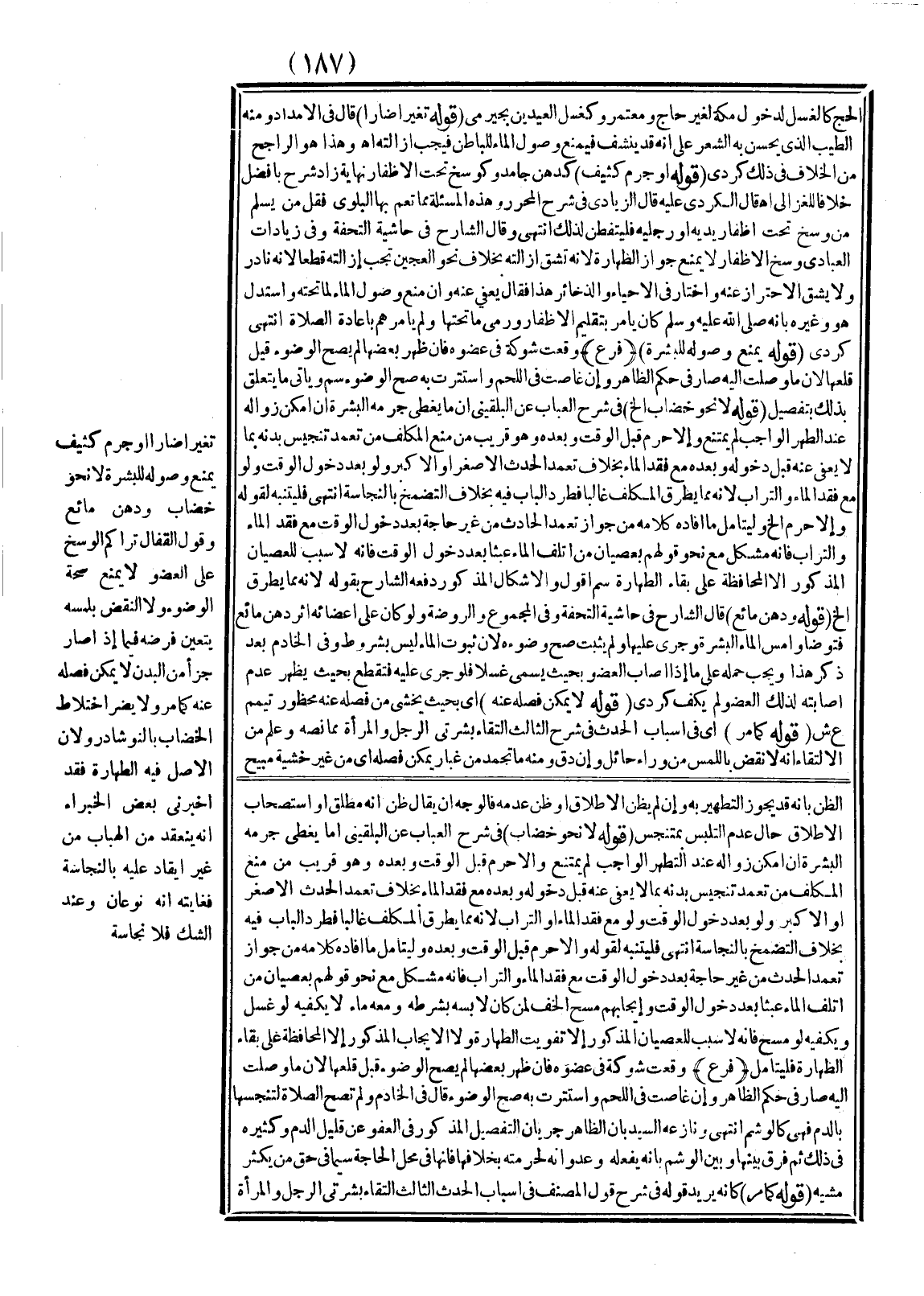 وَقَعَتْ شَوْكَةٌ فِي عُضْوِهِ، فَإِنْ ظَهَرَ بَعْضُهَا لَمْ يَصِحَّ الْوُضُوءُ قَبْلَ قَلْعِهَا؛ لِأَنَّ مَا وَصَلَتْ إلَيْهِ صَارَ فِي حُكْمِ الظَّاهِرِ، وَإِنْ غَاصَتْ فِي اللَّحْمِ وَاسْتَتَرَتْ بِهِ صَحَّ الْوُضُوءُ سم، وَيَأْتِي مَا يَتَعَلَّقُ بِذَلِكَ بِتَفْصِيلٍ (قَوْلُهُ: لَا نَحْوَ خِضَابٍ إلَخْ) فِي شَرْحِ الْعُبَابِ عَنْ الْبُلْقِينِيِّ أَنَّ مَا يُغَطِّي جُرْمُهُ الْبَشَرَةَ إنْ أَمْكَنَ زَوَالُهُ عِنْدَ الطُّهْرِ الْوَاجِبِ لَمْ يَمْتَنِعْ وَإِلَّا حَرُمَ قَبْلَ الْوَقْتِ وَبَعْدَهُ وَهُوَ قَرِيبٌ مِنْ مَنْعِ الْمُكَلَّفِ مِنْ تَعَمُّدِ تَنْجِيسِ بَدَنِهِ بِمَا لَا يُعْفَى عَنْهُ قَبْلَ دُخُولِهِ وَبَعْدَهُ مَعَ فَقْدِ الْمَاءِ بِخِلَافِ تَعَمُّدِ الْحَدَثِ الْأَصْغَرِ أَوْ الْأَكْبَرِ وَلَوْ بَعْدَ دُخُولِ الْوَقْتِ وَلَوْ مَعَ فَقْدِ الْمَاءِ وَالتُّرَابِ؛ لِأَنَّهُ مِمَّا يَطْرُقُ الْمُكَلَّفُ غَالِبًا فَطُرِدَ الْبَابُ فِيهِ بِخِلَافِ التَّضَمُّخِ بِالنَّجَاسَةِ انْتَهَى فَلْيُتَنَبَّهْ لِقَوْلِهِ وَإِلَّا حَرُمَ إلَخْ وَلْيُتَأَمَّلْ مَا أَفَادَهُ كَلَامُهُ مِنْ جَوَازِ تَعَمُّدِ الْحَدَثِ مِنْ غَيْرِ حَاجَةٍ بَعْدَ دُخُولِ الْوَقْتِ مَعَ فَقْدِ الْمَاءِ وَالتُّرَابِ فَإِنَّهُ مُشْكِلٌ مَعَ نَحْوِ قَوْلِهِمْ بِعِصْيَانِ مَنْ أَتْلَفَ الْمَاءَ عَبَثًا بَعْدَ دُخُولِ الْوَقْتِ فَإِنَّهُ لَا سَبَبَ لِلْعِصْيَانِ الْمَذْكُورِ إلَّا الْمُحَافَظَةُ عَلَى بَقَاءِ الطَّهَارَةِ سم أَقُولُ وَالْإِشْكَالُ الْمَذْكُورُ دَفَعَهُ الشَّارِحُ بِقَوْلِهِ؛ لِأَنَّهُ مِمَّا يَطْرُقُ إلَخْ.