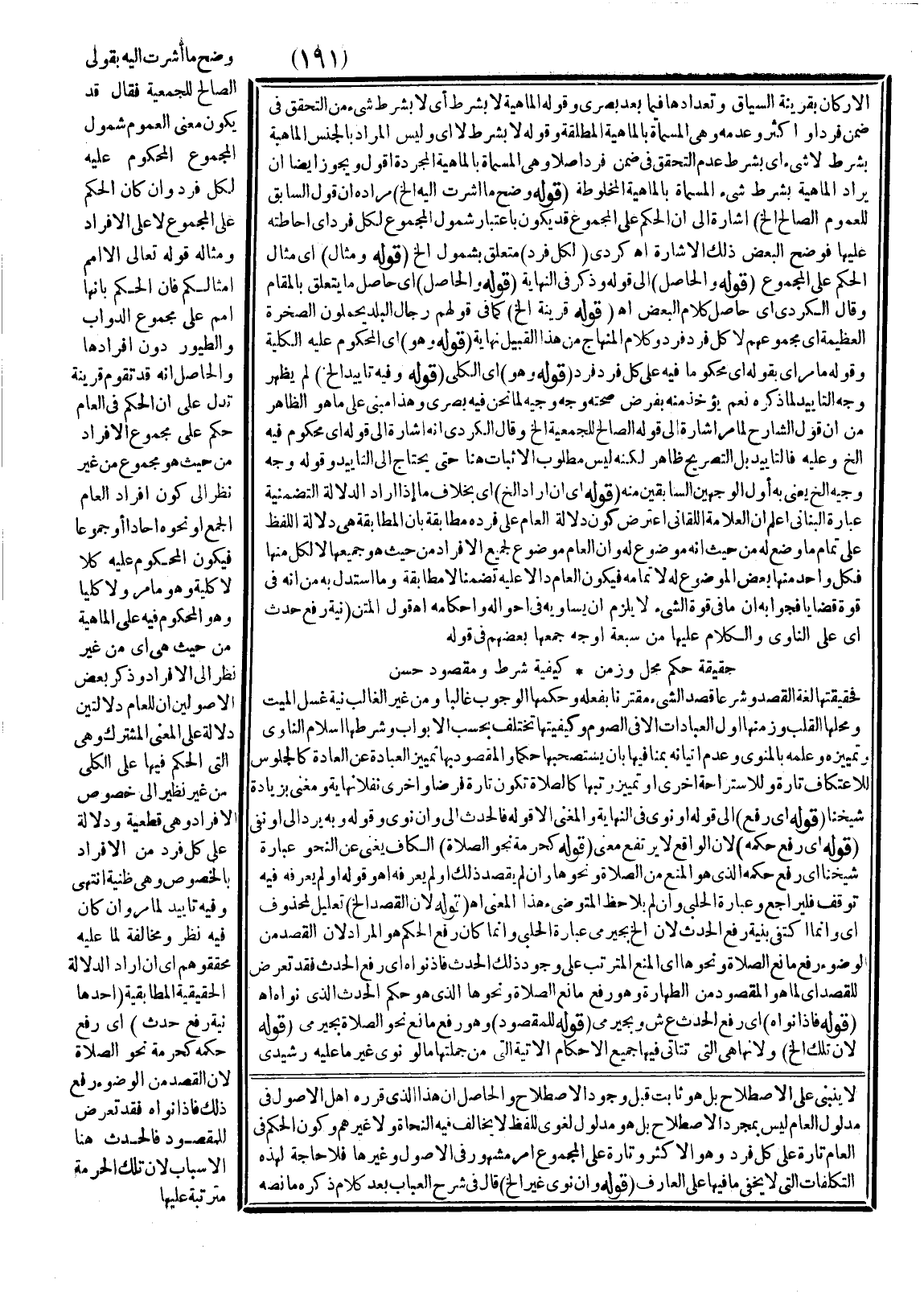 وَضَّحَ مَا أَشَرْت إلَيْهِ بِقَوْلِي الصَّالِحُ لِلْجَمْعِيَّةِ فَقَالَ قَدْ يَكُونُ مَعْنَى الْعُمُومِ شُمُولَ الْمَجْمُوعِ الْمَحْكُومِ عَلَيْهِ لِكُلِّ فَرْدٍ، وَإِنْ كَانَ الْحُكْمُ عَلَى الْمَجْمُوعِ لَا عَلَى الْأَفْرَادِ وَمِثَالُهُ قَوْله تَعَالَى {إِلا أُمَمٌ أَمْثَالُكُمْ} [الأنعام: 38] فَإِنَّ الْحُكْمَ بِأَنَّهَا أُمَمٌ عَلَى مَجْمُوعِ الدَّوَابِّ وَالطُّيُورِ دُونَ أَفْرَادِهَا وَالْحَاصِلُ أَنَّهُ قَدْ تَقُومُ قَرِينَةٌ تَدُلُّ عَلَى أَنَّ الْحُكْمَ فِي الْعَامِّ حُكْمٌ عَلَى مَجْمُوعِ الْأَفْرَادِ مِنْ حَيْثُ هُوَ مَجْمُوعٌ مِنْ غَيْرِ نَظَرٍ إلَى كَوْنِ أَفْرَادِ الْعَامِّ الْجَمْعُ أَوْ نَحْوُهُ آحَادًا أَوْ جُمُوعًا فَيَكُونُ الْمَحْكُومُ عَلَيْهِ كُلًّا لَا كُلِّيَّةً، وَهُوَ مَا مَرَّ وَلَا كُلِّيًّا وَهُوَ الْمَحْكُومُ فِيهِ عَلَى الْمَاهِيَّةِ مِنْ حَيْثُ هِيَ أَيْ مِنْ غَيْرِ نَظَرٍ إلَى الْأَفْرَادِ وَذَكَرَ بَعْضُ الْأُصُولِيِّينَ أَنَّ لِلْعَامِّ دَلَالَتَيْنِ دَلَالَةً عَلَى الْمَعْنَى الْمُشْتَرَكِ، وَهِيَ الَّتِي الْحُكْمُ فِيهَا عَلَى الْكُلِّيِّ مِنْ غَيْرِ نَظَرٍ إلَى خُصُوصِ الْأَفْرَادِ، وَهِيَ قَطْعِيَّةٌ وَدَلَالَةً عَلَى كُلِّ فَرْدٍ فَرْدٍ مِنْ الْأَفْرَادِ بِالْخُصُوصِ، وَهِيَ ظَنِّيَّةٌ انْتَهَى.