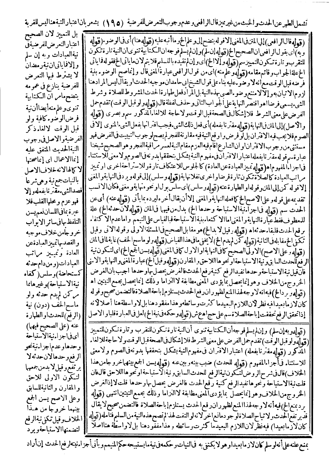 تَشْمَلُ الطُّهْرَ عَنْ الْحَدَثِ وَالْخَبَثِ مِنْ غَيْرِ مُمَيِّزٍ قَالَ الرَّافِعِيُّ وَعَدَمُ وُجُوبِ التَّعَرُّضِ لِلْفَرْضِيَّةِ يُشْعِرُ بِأَنَّ اعْتِبَارَ النِّيَّةِ هُنَا لَيْسَ لِلْقُرْبَةِ بَلْ لِلتَّمْيِيزِ؛ لِأَنَّ الصَّحِيحَ اعْتِبَارُ التَّعَرُّضِ لِلْفَرْضِيَّةِ فِي نِيَّةِ الْعِبَادَاتِ وَبِهِ إنْ سَلِمَ وَإِلَّا فَمَا يَأْتِي أَنَّ نِيَّةَ رَمَضَانَ لَا يُشْتَرَطُ فِيهَا التَّعَرُّضُ لِلْفَرْضِيَّةِ يُنَازِعُ فِي عُمُومِهِ يَتَّضِحُ مَا مَرَّ أَنَّ الْكِتَابِيَّةَ تَنْوِي وَعُلِمَ مِنْهُ أَيْضًا أَنَّ نِيَّةَ فَرْضِ الْوُضُوءِ كَافِيَةٌ وَلَوْ قَبْلَ الْوَقْتِ لِإِلْغَاءِ ذِكْرِ الْفَرْضِيَّةِ وَالْأَصْلُ فِي وُجُوبِ النِّيَّةِ الْحَدِيثُ الْمُتَّفَقُ عَلَيْهِ «إنَّمَا الْأَعْمَالُ» أَيْ إنَّمَا صِحَّتُهَا لِإِكْمَالِهَا؛ لِأَنَّهُ خِلَافُ الْأَصْلِ «بِالنِّيَّاتِ» جَمْعُ نِيَّةٍ، وَهِيَ شَرْعًا قَصْدُ الشَّيْءِ مُقْتَرِنًا بِفِعْلِهِ وَإِلَّا فَهُوَ عَزْمٌ وَمَحَلُّهَا الْقَلْبُ فَلَا عِبْرَةَ بِمَا فِي اللِّسَانِ نَعَمْ يُسَنُّ التَّلَفُّظُ بِهَا فِي سَائِرِ الْأَبْوَابِ خُرُوجًا مِنْ خِلَافِ مُوجِبِهِ وَالْقَصْدُ بِهَا تَمْيِيزُ الْعِبَادَةِ عَنْ الْعَادَةِ وَتَمْيِيزُ مَرَاتِبِ الْعِبَادَاتِ