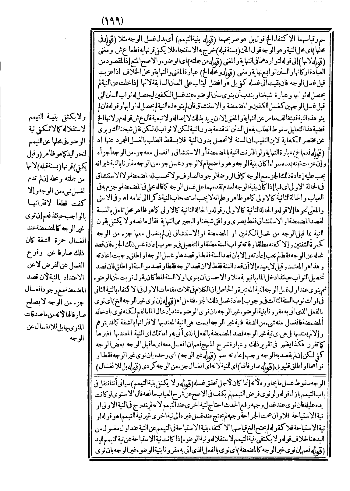 ـــــــــــــــــــــــــــــSالْوَجْهِ سُقُوطُ غَسْلِ مَا يُجَاوِرُهُ؛ لِأَنَّهُ إنَّمَا كَانَ لِأَجْلِ تَحَقُّقِ غَسْلِهِ (قَوْلُهُ: وَلَا يَكْتَفِي بِنِيَّةِ التَّيَمُّمِ) سَيَأْتِي أَنَّنَا نَنْقُلُ فِي بَابِ التَّيَمُّمِ بِإِزَاءِ قَوْلِهِ وَلَوْ نَوَى فَرْضَ التَّيَمُّمِ لَمْ يَكْفِ فِي الْأَصَحِّ عَنْ شَرْحِ الْعُبَابِ مَا نَصُّهُ قَالَ الْإِسْنَوِيُّ لَوْ كَانَتْ يَدُهُ عَلِيلَةً، فَإِنْ نَوَى عِنْدَ غَسْلِ وَجْهِهِ رَفْعَ الْحَدَثِ احْتَاجَ لِنِيَّةٍ أُخْرَى عِنْدَ التَّيَمُّمِ؛ لِأَنَّهُ لَمْ يَنْدَرِجْ فِي النِّيَّةِ الْأُولَى أَوْ نِيَّةِ الِاسْتِبَاحَةِ فَلَا، وَإِنْ عَمَّتْ الْجِرَاحَةُ وَجْهَهُ لَمْ يَحْتَجْ عِنْدَ غَسْلِ غَيْرِهِ إلَى نِيَّةٍ أُخْرَى غَيْرِ نِيَّةِ التَّيَمُّمِ انْتَهَى وَقَوْلُهُ أَوْ نِيَّةِ الِاسْتِبَاحَةِ فَلَا كَقَوْلِهِ لَمْ يَحْتَجْ إلَخْ قِيَاسُهُمَا الِاكْتِفَاءُ بِنِيَّةِ الِاسْتِبَاحَةِ فِي التَّيَمُّمِ عَنْ النِّيَّةِ عِنْدَ أَوَّلِ مَغْسُولٍ مِنْ الْيَدِ هُنَا خِلَافُ قَوْلِهِ وَلَا يَكْتَفِي بِنِيَّةِ التَّيَمُّمِ لِاسْتِقْلَالِهِ وَنِيَّةِ الْوُضُوء إذَا كَانَتْ نِيَّةُ الِاسْتِبَاحَةِ عَنْ نِيَّةِ التَّيَمُّمِ لِلْيَدِ (قَوْلُهُ: نَعَمْ إنْ نَوَى غَيْرَ الْوَجْهِ كَالْمَضْمَضَةِ) أَيْ نَوَى بِالْفِعْلِ الَّذِي أَتَى بِهِ مَقْرُونًا بِنِيَّةِ الْوُضُوءِ غَيْرَ الْوَجْهِ بِأَنْ نَوَى