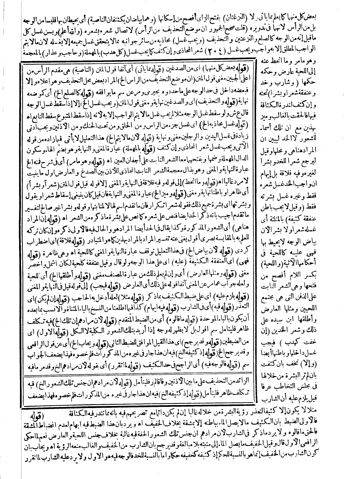 (قَوْلُهُ وَمِثْلُهَا الْعَارِضُ) أَيْ، وَإِنْ لَمْ يُعْلَمْ ذَلِكَ مِنْ عِبَارَةِ الْمُصَنِّفِ مُغْنِي (قَوْلُهُ وَأَطْلَقَهَا إلَخْ) أَيْ اللِّحْيَةَ وَلَعَلَّهُ جَوَابٌ عَمَّا مَرَّ عَنْ الْمُغْنِي آنِفًا قَوْلُهُ: عَلَى ذَلِكَ أَيْ الْعَارِضِ (قَوْلُهُ فَيَجِبُ) إلَى قَوْلِهِ قِيلَ فِي النِّهَايَةِ وَالْمُغْنِي (قَوْلُهُ يَلْزَمُ عَلَيْهِ) أَيْ عَلَى ضَبْطِ الْكَثِيفِ بِمَا ذُكِرَ (قَوْلُهُ: مَثَلًا) لَعَلَّهُ أَدْخَلَ بِهِ الْحَاجِبَ (قَوْلُهُ: إنْ لَمْ يَكُنْ) أَيْ التَّعَذُّرُ (قَوْلُهُ: فِيهِ) أَيْ فِي الشَّارِبِ (قَوْلُهُ فِيهِ إيهَامٌ) كَذَا فِيمَا اطَّلَعْنَا مِنْ النُّسَخِ بِالْيَاءِ الْمُثَنَّاةِ وَالْأَنْسَبُ بِمَا بَعْدَهُ أَنْ يَكُونَ بِالْبَاءِ الْمُوَحَّدَةِ (قَوْلُهُ: مَا قَالُوهُ) أَيْ مِنْ الضَّبْطِ الْمُتَقَدِّمِ (قَوْلُهُ:؛ لِأَنَّ مُرَادَهُمْ أَنَّ تِلْكَ إلَخْ) فِيهِ تَكَلُّفٌ ظَاهِرٌ فَلْيُتَأَمَّلْ سم أَقُولُ بَلْ لَا يَظْهَرُ لَهُ وَجْهٌ إذَا أُرِيدَ بِتِلْكَ الشُّعُورِ الْكُلِّيَّةُ لَا الْكُلُّ (قَوْلُهُ: الْأَوَّلُ) أَيْ مِنْ الضَّبْطَيْنِ (قَوْلُهُ: وَقَدْ يُرَجَّحُ) أَيْ هَذَا الْقِيلُ الْمُوَافِقُ لِلضَّبْطِ الثَّانِي (قَوْلُهُ: وَيُجَابُ إلَخْ) أَيْ عَنْ قَوْلِ الرَّافِعِيِّ وَقَدْ يُرَجَّحُ إلَخْ (قَوْلُهُ إذْ كَثِيفُهُ إلَخْ) فِيهِ أَنَّ هَذَا جَارٍ فِي غَيْرِهِ مِنْ الْمَذْكُورَاتِ فَلِمَ خَصُّوهُ فَهَذَا يُضْعِفُ الْجَوَابَ سم.