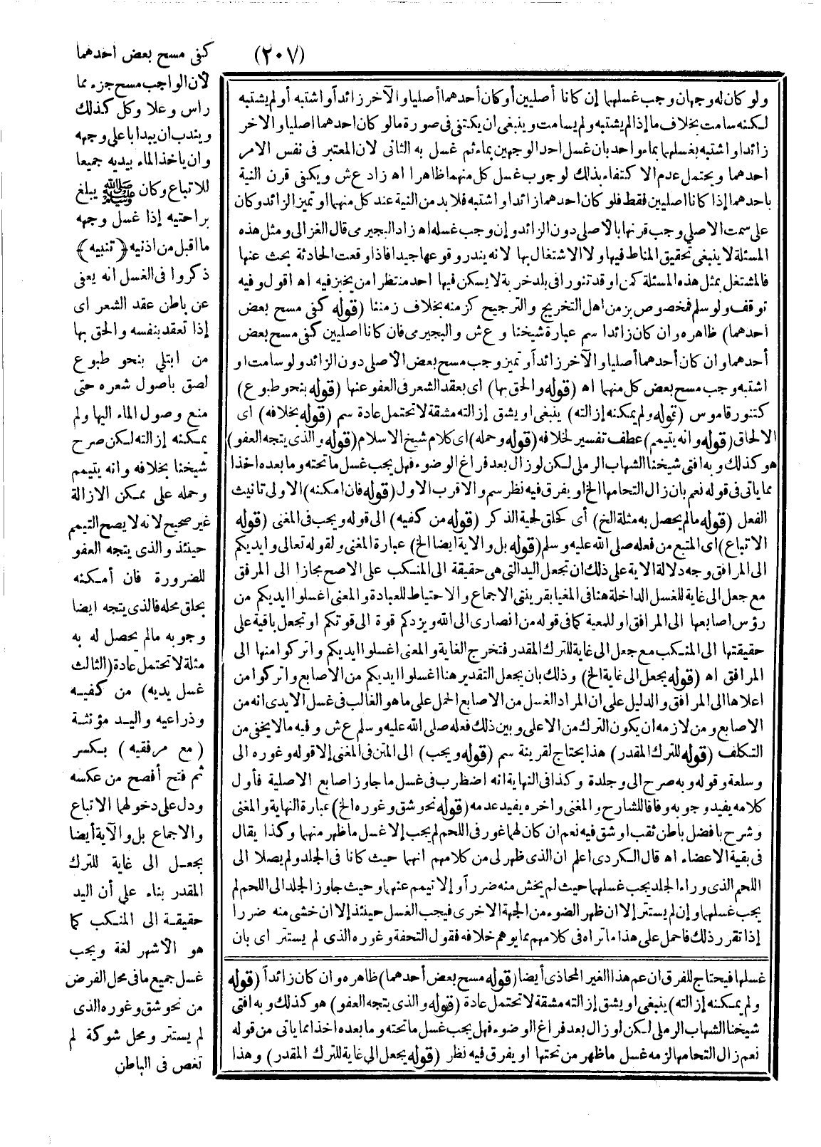 ـــــــــــــــــــــــــــــQوَلَوْ كَانَ لَهُ وَجْهَانِ وَجَبَ غَسْلُهُمَا إنْ كَانَا أَصْلِيَّيْنِ أَوْ كَانَ أَحَدُهُمَا أَصْلِيًّا وَالْآخَرُ زَائِدًا وَاشْتَبَهَ أَوْ لَمْ يُشْتَبَهْ لَكِنَّهُ سَامَتَ بِخِلَافِ مَا إذَا لَمْ يُشْتَبَهْ وَلَمْ يُسَامِتْ، وَيَنْبَغِي أَنْ يَكْتَفِيَ فِي صُورَةِ مَا لَوْ كَانَ أَحَدُهُمْ أَصْلِيًّا وَالْآخَرُ زَائِدًا وَاشْتَبَهَ بِغَسْلِهِمَا بِمَاءٍ وَاحِدٍ بِأَنْ غَسَلَ أَحَدَ الْوَجْهَيْنِ بِمَاءٍ ثُمَّ غَسَلَ بِهِ الثَّانِيَ؛ لِأَنَّ الْمُعْتَبَرَ فِي نَفْسِ الْأَمْرِ أَحَدُهُمَا وَيُحْتَمَلُ عَدَمُ الِاكْتِفَاءِ بِذَلِكَ لِوُجُوبِ غَسْلِ كُلٍّ مِنْهُمَا ظَاهِرًا اهـ زَادَ ع ش، وَيَكْفِي قَرْنُ النِّيَّةِ بِأَحَدِهِمَا إذَا كَانَا أَصْلِيَّيْنِ فَقَطْ فَلَوْ كَانَ أَحَدُهُمَا زَائِدًا وَاشْتَبَهَ فَلَا بُدَّ مِنْ النِّيَّةِ عِنْدَ كُلٍّ مِنْهُمَا أَوْ تَمَيَّزَ الزَّائِدُ وَكَانَ عَلَى سَمْتِ الْأَصْلِيِّ وَجَبَ قَرْنُهَا بِالْأَصْلِيِّ دُونَ الزَّائِدِ، وَإِنْ وَجَبَ غَسْلُهُ اهـ زَادَ الْبُجَيْرِمِيُّ قَالَ الْغَزَالِيُّ وَمِثْلُ هَذِهِ الْمَسْأَلَةِ لَا يَنْبَغِي تَحْقِيقُ الْمَنَاطِ فِيهَا وَلَا الِاشْتِغَالُ بِهَا؛ لِأَنَّهُ يَنْدُرُ وُقُوعُهَا جِدًّا فَإِذَا وَقَعَتْ الْحَادِثَةُ بُحِثَ عَنْهَا فَالْمُشْتَغِلُ بِمِثْلِ هَذِهِ الْمَسْأَلَةِ كَمَنْ أَوْقَدَ تَنُّورًا فِي بَلَدٍ خَرِبَةٍ لَا يَسْكُنُ فِيهَا أَحَدٌ مُنْتَظِرًا مَنْ يَخْبِزُ فِيهِ اهـ أَقُولُ فِيهِ تَوَقُّفٌ وَلَوْ سَلِمَ فَمَخْصُوصٌ بِزَمَنِ أَهْلِ التَّخْرِيجِ وَالتَّرْجِيحِ كَزَمَنِهِ بِخِلَافِ زَمَنِنَا (قَوْلُهُ: كَفَى مَسْحُ بَعْضِ أَحَدِهِمَا) ظَاهِرُهُ، وَإِنْ كَانَ زَائِدًا سم عِبَارَةُ شَيْخِنَا وع ش وَالْبُجَيْرِمِيُّ، فَإِنْ كَانَا أَصْلِيَّيْنِ كَفَى مَسْحُ بَعْضِ أَحَدِهِمَا، وَإِنْ كَانَ أَحَدُهُمَا أَصْلِيًّا وَالْآخَرُ زَائِدًا وَتَمَيَّزَ وَجَبَ مَسْحُ بَعْضِ الْأَصْلِيِّ دُونَ الزَّائِدِ وَلَوْ سَامَتَ أَوْ اشْتَبَهَ وَجَبَ مَسْحُ بَعْضِ كُلٍّ مِنْهُمَا اهـ.
