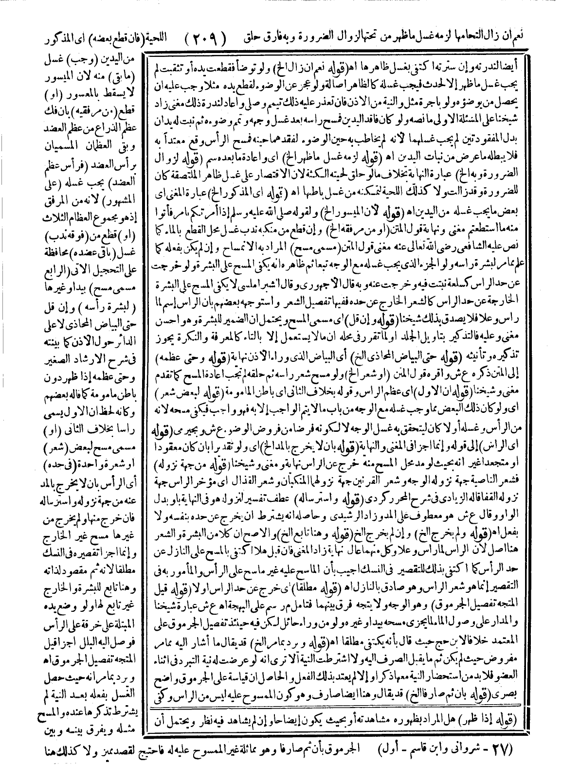 (قَوْلُهُ: مُطْلَقًا) أَيْ خَرَجَ عَنْ حَدِّ الرَّأْسِ أَوْ لَا (قَوْلُهُ: قِيلَ الْمُتَّجَهُ تَفْصِيلُ الْجُرْمُوقِ) وَهُوَ الْوَجْهُ وَلَا يَتَّجِهُ فَرْقٌ بَيْنَهُمَا فَتَأَمَّلْ م ر سم عَلَى الْبَهْجَةِ اهـ ع ش.
