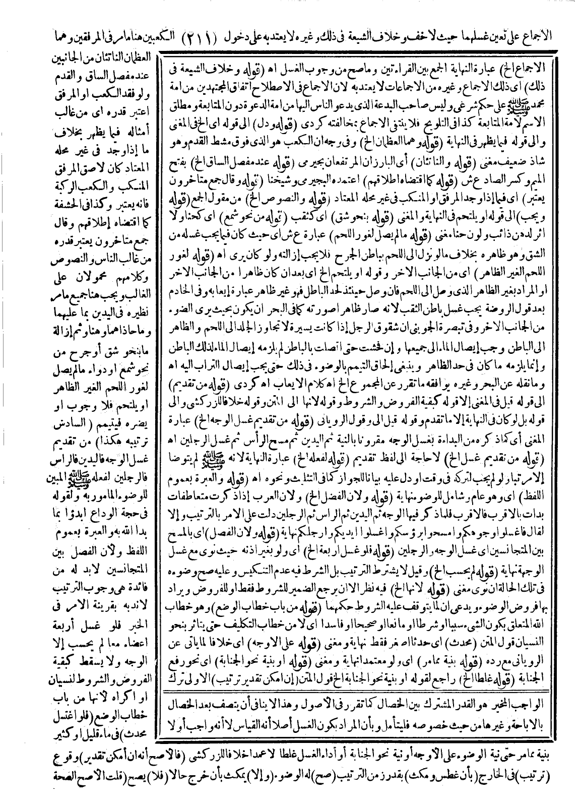 (قَوْلُهُ: وَخِلَافُ الشِّيعَةِ فِي ذَلِكَ) أَيْ ذَلِكَ الْإِجْمَاعِ وَغَيْرِهِ مِنْ الْإِجْمَاعَاتِ لَا يُعْتَدُّ بِهِ؛ لِأَنَّ الْإِجْمَاعَ فِي الِاصْطِلَاحِ اتِّفَاقُ الْمُجْتَهِدِينَ مِنْ أُمَّةِ مُحَمَّدٍ - صَلَّى اللَّهُ عَلَيْهِ وَسَلَّمَ - عَلَى حُكْمٍ شَرْعِيٍّ وَلَيْسَ صَاحِبُ الْبِدْعَةِ الَّذِي يَدْعُو النَّاسَ إلَيْهَا مِنْ أُمَّةِ الدَّعْوَةِ دُونَ الْمُتَابَعَةِ وَمُطْلَقُ الِاسْمِ لِأُمَّةِ الْمُتَابَعَةِ كَذَا فِي التَّلْوِيحِ فَلَا يَنْتَفِي الْإِجْمَاعُ بِمُخَالَفَتِهِ كُرْدِيٌّ (قَوْلُهُ: وَدَلَّ) إلَى قَوْلِهِ أَيْ إلَخْ فِي الْمُغْنِي وَإِلَى قَوْلِهِ فِيمَا يَظْهَرُ فِي النِّهَايَةِ (قَوْلُهُ وَهُمَا الْعَظْمَانِ إلَخْ) وَفِي وَجْهٍ أَنَّ الْكَعْبَ هُوَ الَّذِي فَوْقَ مُشْطِ الْقَدَمِ، وَهُوَ شَاذٌّ ضَعِيفٌ مُغْنِي (قَوْلُهُ: النَّاتِئَانِ) أَيْ الْبَارِزَانِ الْمُرْتَفِعَانِ بُجَيْرِمِيٌّ (قَوْلُهُ: عِنْدَ مَفْصِلِ السَّاقِ إلَخْ) بِفَتْحِ الْمِيمِ وَكَسْرِ الصَّادِ ع ش.