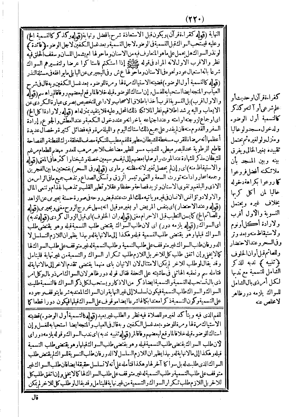 ـــــــــــــــــــــــــــــQالنِّهَايَةِ (قَوْلُهُ كَقِرَاءَةِ قُرْآنٍ) ، وَيَكُونُ قَبْلَ الِاسْتِعَاذَةِ شَرْحُ بَافَضْلٍ وَنِهَايَةٌ (قَوْلُهُ وَكَذِكْرٍ كَالتَّسْمِيَةِ إلَخْ) وَعَلَيْهِ فَيُسْتَحَبُّ السِّوَاكُ قَبْلَ التَّسْمِيَةِ فِي الْوُضُوءِ لِأَجْلِ التَّسْمِيَةِ وَبَعْدَ غَسْلِ الْكَفَّيْنِ لِأَجْلِ الْوُضُوءِ.