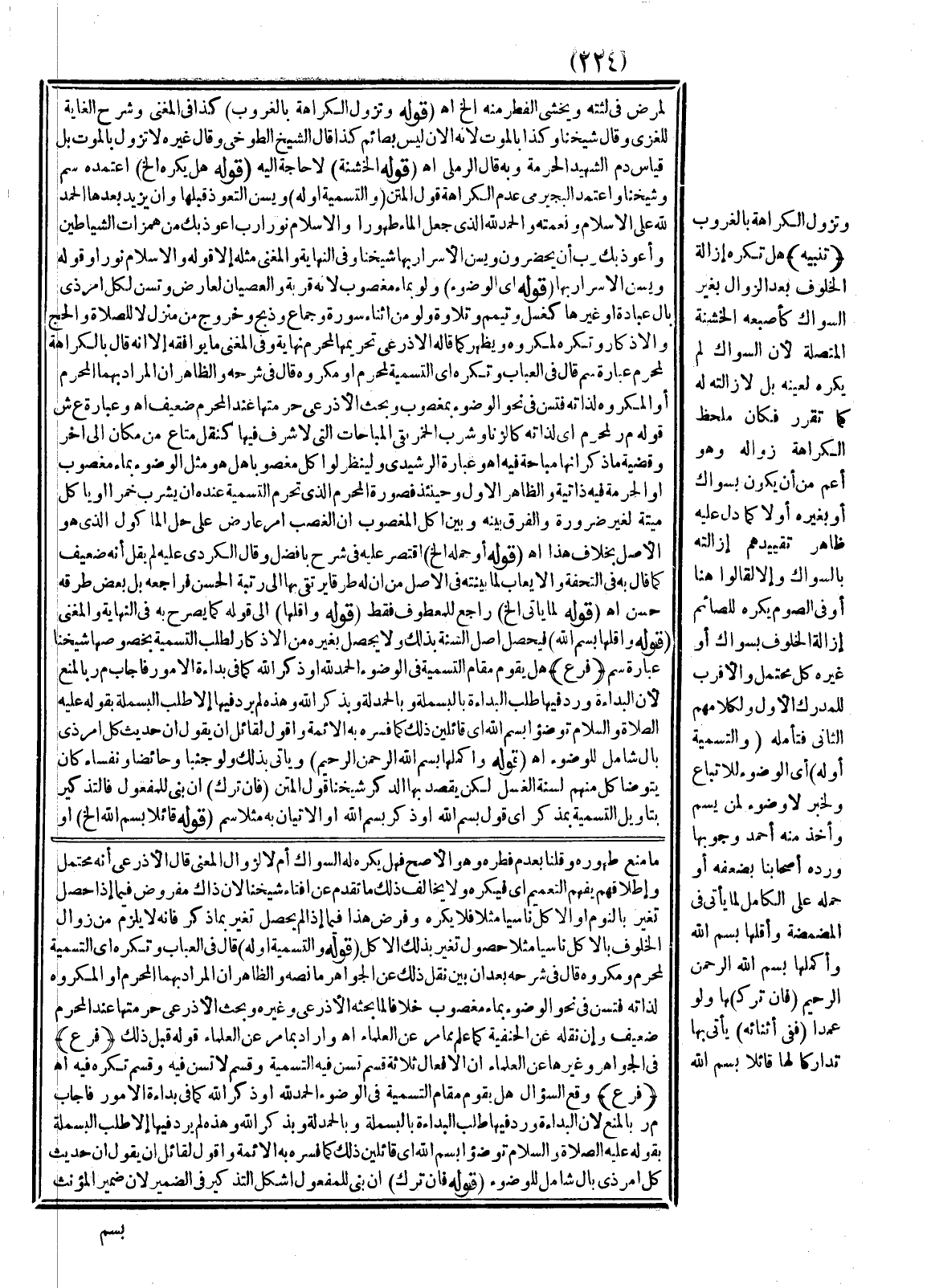 (قَوْلُهُ وَالتَّسْمِيَةُ أَوَّلَهُ) قَالَ فِي الْعُبَابِ وَتُكْرَهُ أَيْ التَّسْمِيَةُ لِمُحَرَّمٍ وَمَكْرُوهٍ قَالَ فِي شَرْحِهِ بَعْدَ أَنْ بَيَّنَ نَقْلَ ذَلِكَ عَنْ الْجَوَاهِرِ مَا نَصُّهُ وَالظَّاهِرُ أَنَّ الْمُرَادَ بِهِمَا الْمُحَرَّمِ أَوْ الْمَكْرُوهِ لِذَاتِهِ فَتُسَنُّ فِي نَحْوِ الْوُضُوءِ بِمَاءٍ مَغْصُوبٍ خِلَافًا لِمَا بَحَثَهُ الْأَذْرَعِيُّ وَغَيْرُهُ وَبَحْثُ الْأَذْرَعِيِّ حُرْمَتَهَا عِنْدَ الْمُحَرَّمِ ضَعِيفٌ، وَإِنْ نَقَلَهُ عَنْ الْحَنَفِيَّةِ كَمَا عُلِمَ مِمَّا مَرَّ عَنْ الْعُلَمَاءِ اهـ وَأَرَادَ بِمَا مَرَّ عَنْ الْعُلَمَاءِ قَوْلَهُ قَبْلَ ذَلِكَ فَرْعٌ فِي الْجَوَاهِرِ وَغَيْرِهَا عَنْ الْعُلَمَاءِ أَنَّ الْأَفْعَالَ ثَلَاثٌ قِسْمٌ تُسَنُّ فِيهِ التَّسْمِيَةُ وَقِسْمٌ لَا تُسَنُّ فِيهِ وَقِسْمٌ تُكْرَهُ فِيهِ اهـ.