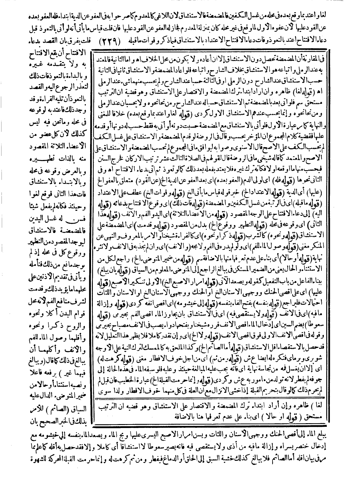 وَمَا نَحْنُ فِيهِ لَيْسَ كَذَلِكَ؛ لِأَنَّ كُلَّ عُضْوٍ مِنْ الْأَعْضَاءِ الثَّلَاثَةِ الْمَقْصُودُ مِنْهُ بِالذَّاتِ تَطْهِيرُهُ وَبِالْعَرْضَلِ وُقُوعُهُ فِي مَحَلِّهِ وَبِالِابْتِدَاءِ بِالِاسْتِنْشَاقِ فَاتَ هَذَا الثَّانِي فَوَقَعَ لَغْوًا وَحِينَئِذٍ فَكَأَنَّهُ لَمْ يَفْعَلْ شَيْئًا فَسُنَّ لَهُ غَسْلُ الْيَدَيْنِ فَالْمَضْمَضَةُ فَالِاسْتِنْشَاقُ لِيُوجَدَ الْمَقْصُودُ مِنْ التَّطْهِيرِ وَوُقُوعِ كُلٍّ فِي مَحَلِّهِ إذْ لَمْ يُوجَدْ مَانِعٌ مِنْ ذَلِكَ فَتَأَمَّلْهُ، وَيَأْتِي فِي تَقْدِيمِ الْأُذُنَيْنِ عَلَى مَحَلِّهِمَا مَا يُؤَيِّدُ ذَلِكَ وَقُدِّمَتْ لِشَرَفِ مَنَافِعِ الْفَمِ؛ لِأَنَّهُ مَحَلُّ قِوَامِ الْبَدَنِ أَكْلًا وَنَحْوَهُ وَالرُّوحِ ذِكْرًا وَنَحْوَهُ وَأَقَلُّهُمَا وُصُولُ الْمَاءِ لِلْفَمِ وَالْأَنْفِ وَأَكْمَلُهُمَا أَنْ يُبَالِغَ فِي ذَلِكَ كَمَا قَالَ (وَيُبَالِغَ فِيهِمَا غَيْرُ) بِرَفْعِهِ فَاعِلًا وَنَصْبِهِ اسْتِثْنَاءً أَوْ حَالًا مِنْ ضَمِيرِ الْمُتَوَضِّئِ الدَّالِّ عَلَيْهِ السِّيَاقُ (الصَّائِمِ) لِأَمْرٍ بِذَلِكَ فِي الْخَبَرِ الصَّحِيحِ بِأَنْ يَبْلُغَ الْمَاءُ إلَى أَقْصَى الْحَنَكِ وَوَجْهَيْ الْأَسْنَانِ وَاللِّثَاتِ وَيُسَنُّ إمْرَارُ الْأُصْبُعِ الْيُسْرَى عَلَيْهَا وَمَجُّ الْمَاءِ، وَيُصْعِدُ الْمَاءَ بِنَفَسِهِ إلَى خَيْشُومِهِ مَعَ إدْخَالِ خِنْصَرِ يُسْرَاهُ وَإِزَالَةِ مَا فِيهِ مِنْ أَذًى وَلَا يُسْتَقْصَى فِيهِ فَإِنَّهُ يَصِيرُ سَعُوطًا لَا اسْتِنْشَاقًا أَيْ كَامِلًا وَإِلَّا فَقَدْ حَصَلَ بِهِ أَقَلُّهُ كَمَا عُلِمَ مِمَّا مَرَّ فِي بَيَانِ أَقَلِّهِ أَمَّا الصَّائِمُ فَلَا يُبَالِغُ كَذَلِكَ خَشْيَةَ السَّبْقِ إلَى الْحَلْقِ أَوْ الدِّمَاغِ فَيُفْطِرُ وَمِنْ ثَمَّ كُرِهَتْ لَهُ.