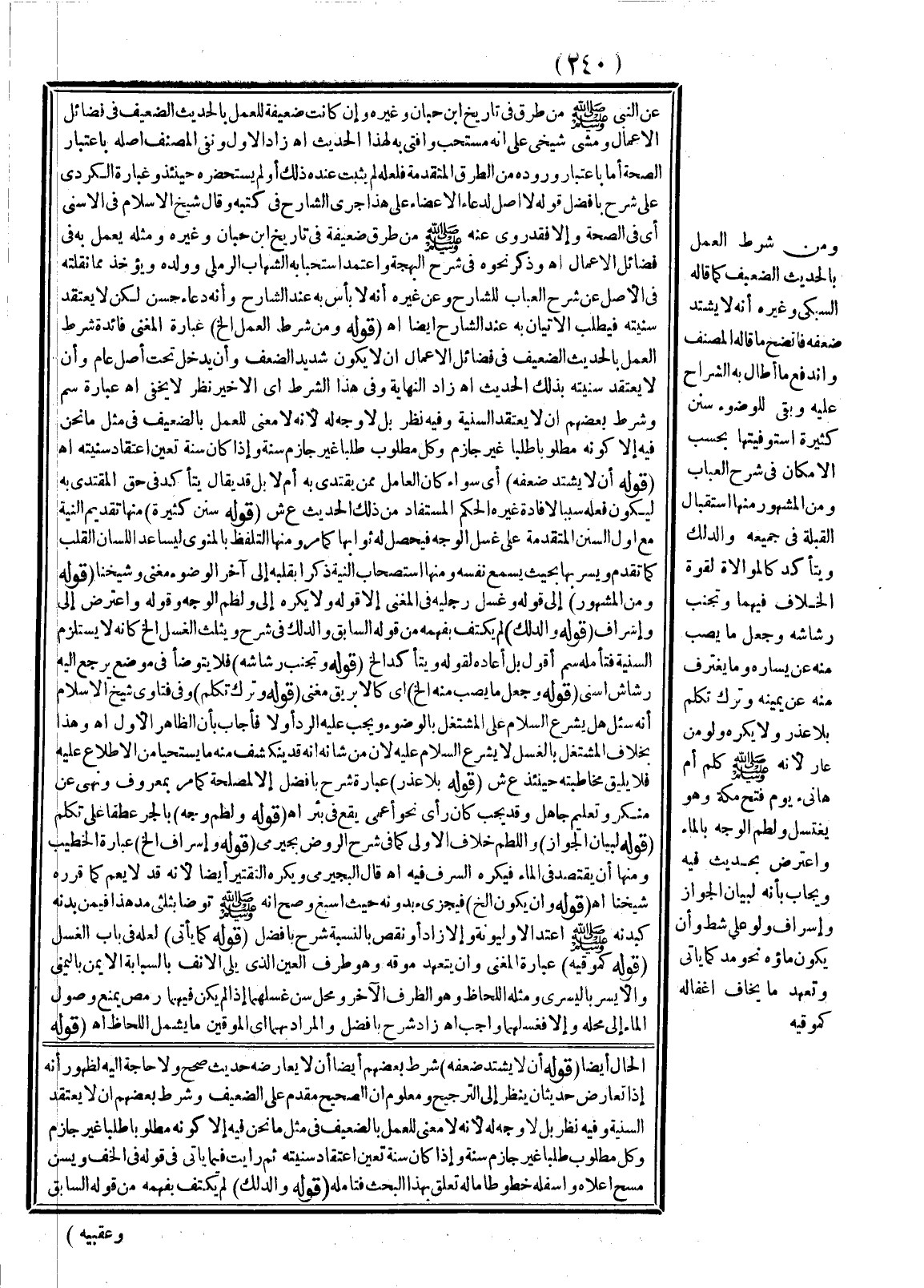 وَمِنْ شَرْطِ الْعَمَلِ بِالْحَدِيثِ الضَّعِيفِ كَمَا قَالَهُ السُّبْكِيُّ وَغَيْرُهُ أَنْ لَا يَشْتَدَّ ضَعْفُهُ فَاتَّضَحَ مَا قَالَهُ الْمُصَنِّفُ وَانْدَفَعَ مَا أَطَالَ بِهِ الشُّرَّاحُ عَلَيْهِ وَبَقِيَ لِلْوُضُوءِ سُنَنٌ كَثِيرَةٌ اسْتَوْفَيْتهَا بِحَسَبِ الْإِمْكَانِ فِي شَرْحِ الْعُبَابِ.