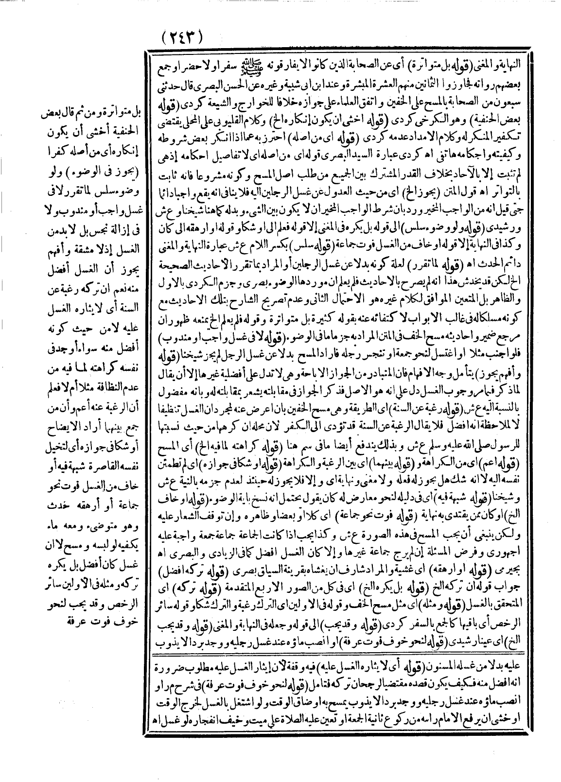 بَلْ مُتَوَاتِرَةٌ وَمِنْ ثَمَّ قَالَ بَعْضُ الْحَنَفِيَّةِ أَخْشَى أَنْ يَكُونَ إنْكَارُهُ أَيْ مِنْ أَصْلِهِ كُفْرًا (يَجُوزُ فِي الْوُضُوءِ) وَلَوْ وُضُوءَ سَلِسٍ لِمَا تَقَرَّرَ لَا فِي غُسْلِ وَاجِبٍ أَوْ مَنْدُوبٍ وَلَا فِي إزَالَةِ نَجَسٍ بَلْ لَا بُدَّ مِنْ الْغَسْلِ إذْ لَا مَشَقَّةَ وَأَفْهَمَ يَجُوزُ أَنَّ الْغَسْلَ أَفْضَلُ مِنْهُ نَعَمْ إنْ تَرَكَهُ رَغْبَةً عَنْ السُّنَّةِ أَيْ لِإِيثَارِهِ الْغَسْلَ عَلَيْهِ لَا مِنْ حَيْثُ كَوْنُهُ أَفْضَلَ مِنْهُ سَوَاءٌ أَوَجَدَ فِي نَفْسِهِ كَرَاهَتَهُ لِمَا فِيهِ مِنْ عَدَمِ النَّظَافَةِ مَثَلًا أَمْ لَا، فَعُلِمَ أَنَّ الرَّغْبَةَ عَنْهُ أَعَمُّ وَأَنَّ مَنْ جَمَعَ بَيْنَهُمَا أَرَادَ الْإِيضَاحَ أَوْ شَكًّا فِي جَوَازِهِ أَيْ لِتَخَيُّلِ نَفْسِهِ الْقَاصِرَةِ شُبْهَةً فِيهِ أَوْ خَافَ مِنْ الْغَسْلِ فَوْتَ نَحْوِ جَمَاعَةٍ أَوْ أَرْهَقَهُ حَدَثٌ وَهُوَ مُتَوَضِّئٌ وَمَعَهُ مَاءٌ يَكْفِيهِ لَوْ لَبِسَهُ وَمَسَحَ لَا إنْ غَسَلَ كَانَ أَفْضَلَ بَلْ يُكْرَهُ تَرْكُهُ وَمِثْلُهُ فِي الْأَوَّلَيْنِ سَائِرُ الرُّخَصِ.