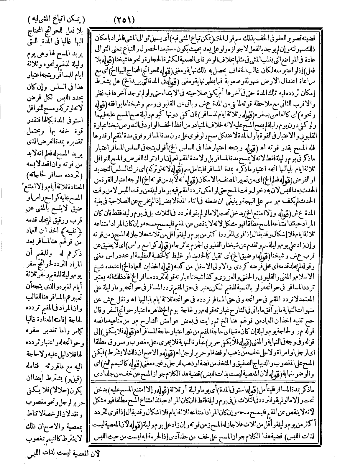 وَأَمَّا تَقْدِيرُ سَفَرِهِ وَحَوَائِجِهِ لَهُ وَاعْتِبَارُ تَرَدُّدِهِ لَهَا فَلَا دَلِيلَ عَلَيْهِ وَلَا حَاجَةَ إلَيْهِ مَعَ مَا قَرَّرْته فَتَأَمَّلْهُ (قِيلَ وَ) وَيُشْتَرَطُ أَيْضًا أَنْ يَكُونَ (حَلَالًا) فَلَا يَكْفِي حَرِيرٌ لِرَجُلٍ وَنَحْوُ مَغْصُوبٍ وَنَقْدٍ؛ لِأَنَّ الرُّخْصَةَ لَا تُنَاطُ بِمَعْصِيَةٍ وَالْأَصَحُّ أَنَّ ذَلِكَ لَا يُشْتَرَطُ كَالتَّيَمُّمِ بِمَغْصُوبٍ؛ لِأَنَّ الْمَعْصِيَةَ لَيْسَتْ لِذَاتِ اللُّبْسِ