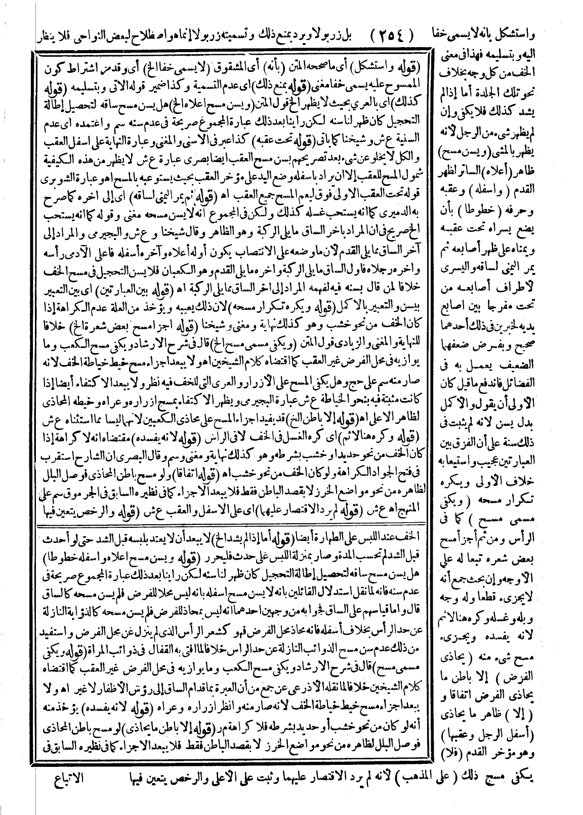 (قَوْلُهُ وَيُسَنُّ مَسْحُ أَعْلَاهُ وَأَسْفَلِهِ خُطُوطًا) هَلْ يُسَنُّ مَسْحُ سَاقِهِ لِتَحْصِيلِ إطَالَةِ التَّحْجِيلِ كَانَ ظَهَرَ لَنَا سَنَّهُ لَكِنْ رَأَيْنَا بَعْدَ ذَلِكَ عِبَارَةَ الْمَجْمُوعِ صَرِيحَةً فِي عَدَمِ سَنِّهِ فَإِنَّهُ لَمَّا نَقَلَ اسْتِدْلَالَ الْقَائِلِينَ بِأَنَّهُ لَا يُسَنُّ مَسْحُ أَسْفَلِهِ بِأَنَّهُ لَيْسَ مَحَلًّا لِلْفَرْضِ فَلَمْ يُسَنَّ مَسْحُهُ كَالسَّاقِ قَالَ وَأَمَّا قِيَاسُهُمْ عَلَى السَّاقِ فَجَوَابُهُ مِنْ وَجْهَيْنِ أَحَدُهُمَا أَنَّهُ لَيْسَ بِمُحَاذٍ لِلْفَرْضِ فَلَمْ يُسَنَّ مَسْحُهُ كَالذُّؤَابَةِ النَّازِلَةِ عَنْ حَدِّ الرَّأْسِ بِخِلَافِ أَسْفَلِهِ فَإِنَّهُ مُحَاذٍ مَحَلَّ الْفَرْضِ فَهُوَ كَشَعْرِ الرَّأْسِ الَّذِي لَمْ يَنْزِلْ عَنْ مَحْلِ الْفَرْضِ. اهـ. وَاسْتُفِيدَ مِنْ ذَلِكَ عَدَمُ سَنِّ مَسْحِ الذَّوَائِبِ النَّازِلَةِ عَنْ حَدِّ الرَّأْسِ خِلَافًا لِمَا أَفْتَى بِهِ الْقَفَّالُ فِي ذَوَائِبِ الْمَرْأَةِ (قَوْلُهُ وَيَكْفِي مُسَمَّى مَسْحٍ) قَالَ فِي شَرْحِ الْإِرْشَادِ وَيَكْفِي مَسْحُ الْكَعْبِ وَمَا يُوَازِيهِ فِي مَحَلِّ الْفَرْضِ غَيْرِ الْعَقِبِ كَمَا اقْتَضَاهُ كَلَامُ الشَّيْخَيْنِ خِلَافًا لِمَا نَقَلَهُ الْأَذْرَعِيُّ عَنْ جَمْعٍ مِنْ أَنَّ الْعِبْرَةَ بِمَا قُدَّامَ السَّاقِ إلَى رُءُوسِ الْأَظْفَارِ لَا غَيْرُ. اهـ. وَلَا يَبْعُدُ إجْزَاءُ مَسْحِ خَيْطِ خِيَاطَةِ الْخُفِّ؛ لِأَنَّهُ صَارَ مِنْهُ وَانْظُرْ أَزْرَارَهُ وَعُرَاهُ (قَوْلُهُ لِأَنَّهُ يُفْسِدُهُ) يُؤْخَذُ مِنْهُ أَنَّهُ لَوْ كَانَ مِنْ نَحْوِ خَشَبٍ أَوْ حَدِيدٍ بِشَرْطِهِ فَلَا كَرَاهَةَ م ر (قَوْلُهُ إلَّا بَاطِنَ مَا يُحَاذِي) لَوْ مَسَحَ بَاطِنَ الْمُحَاذِي فَوَصَلَ الْبَلَلُ لِظَاهِرِهِ مِنْ نَحْوِ مَوَاضِعِ الْخَرْزِ لَا بِقَصْدِ الْبَاطِنِ فَقَطْ فَلَا يَبْعُدُ الْإِجْزَاءُ كَمَا فِي نَظِيرِهِ السَّابِقِ فِي