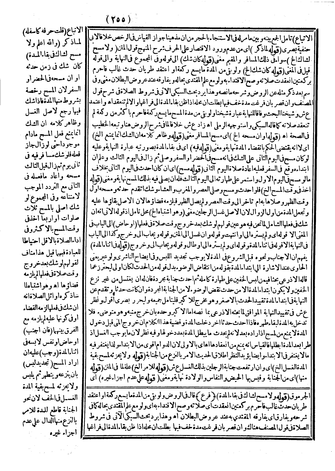 قَوْلُ الْمَتْنِ (وَلَا مَسْحَ لِشَاكٍّ إلَخْ) سَوَاءٌ فِي ذَلِكَ الْمُسَافِرُ وَالْمُقِيمُ مُغْنِي (قَوْلُهُ كَأَنْ شَكَّ) إلَى قَوْلِهِ وَفِي الْمَجْمُوعِ فِي النِّهَايَةِ وَإِلَى قَوْلِهِ قِيلَ فِي الْمُغْنِي (قَوْلُهُ كَأَنْ شَكَّ إلَخْ) وَلَوْ بَقِيَ مِنْ الْمُدَّةِ مَا يَسَعُ رَكْعَةً أَوْ اعْتَقَدَ طَرَيَان حَدَثٍ غَالِبٍ فَأَحْرَمَ بِرَكْعَتَيْنِ انْعَقَدَتْ صَلَاتُهُ وَصَحَّ الِاقْتِدَاءُ بِهِ، وَلَوْ مَعَ عِلْمِ الْمُقْتَدِي بِحَالِهِ وَيُفَارِقُهُ عِنْدَ عُرُوضِ الْبُطْلَانِ مُغْنِي وَفِي سم بَعْدَ ذِكْرِ مِثْلِهِ عَنْ الرَّوْضِ وَشَرْحِهِ مَا نَصُّهُ وَهَذَا يَرُدُّ بَحْثَ السُّبْكِيّ الْآتِي فِي شُرُوطِ الصَّلَاةِ فِي شَرْحِ قَوْلِ الْمُصَنِّفِ وَإِنْ قَصَرَ بِأَنْ فَرَغَتْ مُدَّةُ خُفٍّ فِيهَا بَطَلَتْ أَنَّ مَحَلَّهُ إذَا ظَنَّ بَقَاءَ الْمُدَّةِ إلَى فَرَاغِهَا وَإِلَّا لَمْ تَنْعَقِدْ اهـ وَاعْتَمَدَ ع ش وَشَيْخُنَا الْبَحْثَ وِفَاقًا لِلنِّهَايَةِ عِبَارَةُ شَيْخِنَا وَلَوْ بَقِيَ مِنْ مُدَّةِ الْمَسْحِ مَا يَسَعُ رَكْعَةً فَأَحْرَمَ بِأَكْثَرَ مِنْ رَكْعَةٍ لَمْ تَنْعَقِدْ صَلَاتُهُ كَمَا قَالَهُ السُّبْكِيُّ وَاسْتَوْجَهَهُ الرَّمْلِيُّ اهـ.