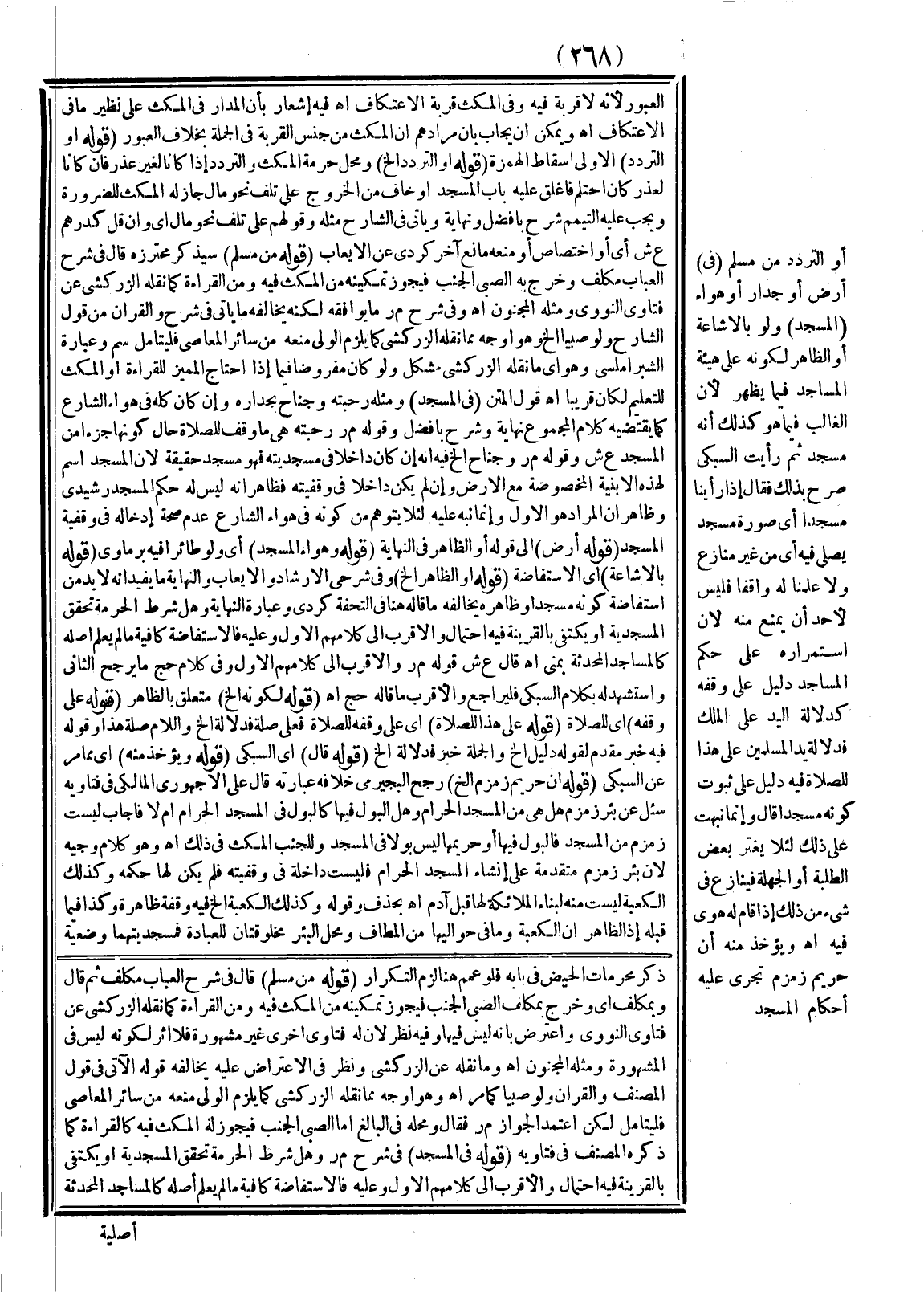 (قَوْلُهُ عَلَى وَقْفِهِ) أَيْ لِلصَّلَاةِ (قَوْلُهُ عَلَى هَذَا لِلصَّلَاةِ) أَيْ عَلَى وَقْفِهِ لِلصَّلَاةِ فَعَلَى صِلَةُ فَدَلَالَةُ إلَخْ وَاللَّامُ صِلَةُ هَذَا وَقَوْلُهُ فِيهِ خَبَرٌ مُقَدَّمٌ لِقَوْلِهِ دَلِيلٌ إلَخْ وَالْجُمْلَةُ خَبَرُ فَدَلَالَةُ إلَخْ (قَوْلُهُ قَالَ) أَيْ السُّبْكِيُّ (قَوْلُهُ وَيُؤْخَذُ مِنْهُ) أَيْ مِمَّا مَرَّ عَنْ السُّبْكِيّ (قَوْلُهُ أَنَّ حَرِيمَ زَمْزَمَ إلَخْ) رَجَّحَ الْبُجَيْرِمِيُّ خِلَافَهُ عِبَارَتُهُ قَالَ عَلِيٌّ الْأُجْهُورِيُّ الْمَالِكِيُّ فِي فَتَاوِيهِ سُئِلَ عَنْ بِئْرِ زَمْزَمَ هَلْ هِيَ مِنْ الْمَسْجِدِ الْحَرَامِ وَهَلْ الْبَوْلُ فِيهَا كَالْبَوْلِ فِي الْمَسْجِدِ الْحَرَامِ أَمْ لَا فَأَجَابَ لَيْسَتْ زَمْزَمَ مِنْ الْمَسْجِدِ فَالْبَوْلُ فِيهَا أَوْ حَرِيمِهَا لَيْسَ بَوْلًا فِي الْمَسْجِدِ وَلِلْجُنُبِ الْمُكْثُ فِي ذَلِكَ اهـ.