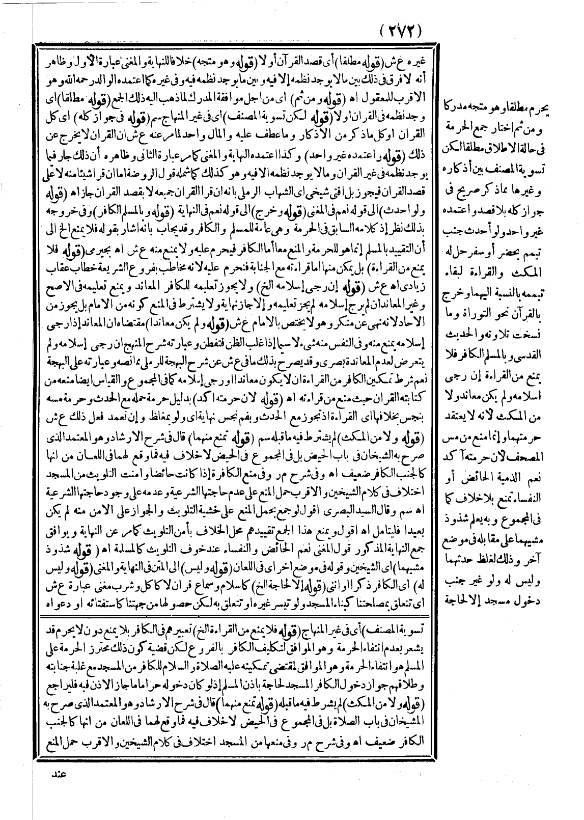 ـــــــــــــــــــــــــــــSتَسْوِيَةَ الْمُصَنِّفِ) أَيْ فِي غَيْرِ الْمِنْهَاجِ (قَوْلُهُ فَلَا يُمْنَعُ مِنْ الْقِرَاءَةِ إلَخْ) تَعْبِيرُهُمْ فِي الْكَافِرِ بِلَا يَمْنَعُ دُونَ لَا يَحْرُمُ قَدْ يُشْعِرُ بِعَدَمِ انْتِفَاءِ الْحُرْمَةِ وَهُوَ الْمُوَافِقُ لِتَكْلِيفِ الْكَافِرِ بِالْفُرُوعِ لَكِنَّ قَضِيَّةَ كَوْنِ ذَلِكَ مُحْتَرَزَ الْحُرْمَةِ عَلَى الْمُسْلِمِ هُوَ انْتِفَاءُ الْحُرْمَةِ وَهُوَ الْمُوَافِقُ لِمُقْتَضَى تَمْكِينِهِ - عَلَيْهِ الصَّلَاةُ وَالسَّلَامُ - لِلْكَافِرِ مِنْ الْمَسْجِدِ مَعَ غَلَبَةِ جَنَابَتِهِ وَلِإِطْلَاقِهِمْ جَوَازَ دُخُولِ الْكَافِرِ الْمَسْجِدَ لِحَاجَةٍ بِإِذْنِ الْمُسْلِمِ إذْ لَوْ كَانَ دُخُولُهُ حَرَامًا مَا جَازَ الْإِذْنُ فِيهِ فَلْيُرَاجَعْ (قَوْلُهُ وَلَا مِنْ الْمُكْثِ) لَمْ يُشْرَطْ فِيهِ مَا قَبْلَهُ (قَوْلُهُ تُمْنَعُ مِنْهُمَا) قَالَ فِي شَرْحِ الْإِرْشَادِ وَهُوَ الْمُعْتَمَدُ الَّذِي صَرَّحَ بِهِ الشَّيْخَانِ فِي بَابِ الصَّلَاةِ بَلْ فِي الْمَجْمُوعِ فِي الْحَيْضِ لَا خِلَافَ فِيهِ فَمَا وَقَعَ لَهُمَا فِي اللِّعَانِ مِنْ أَنَّهَا كَالْجُنُبِ الْكَافِرِ ضَعِيفٌ اهـ.