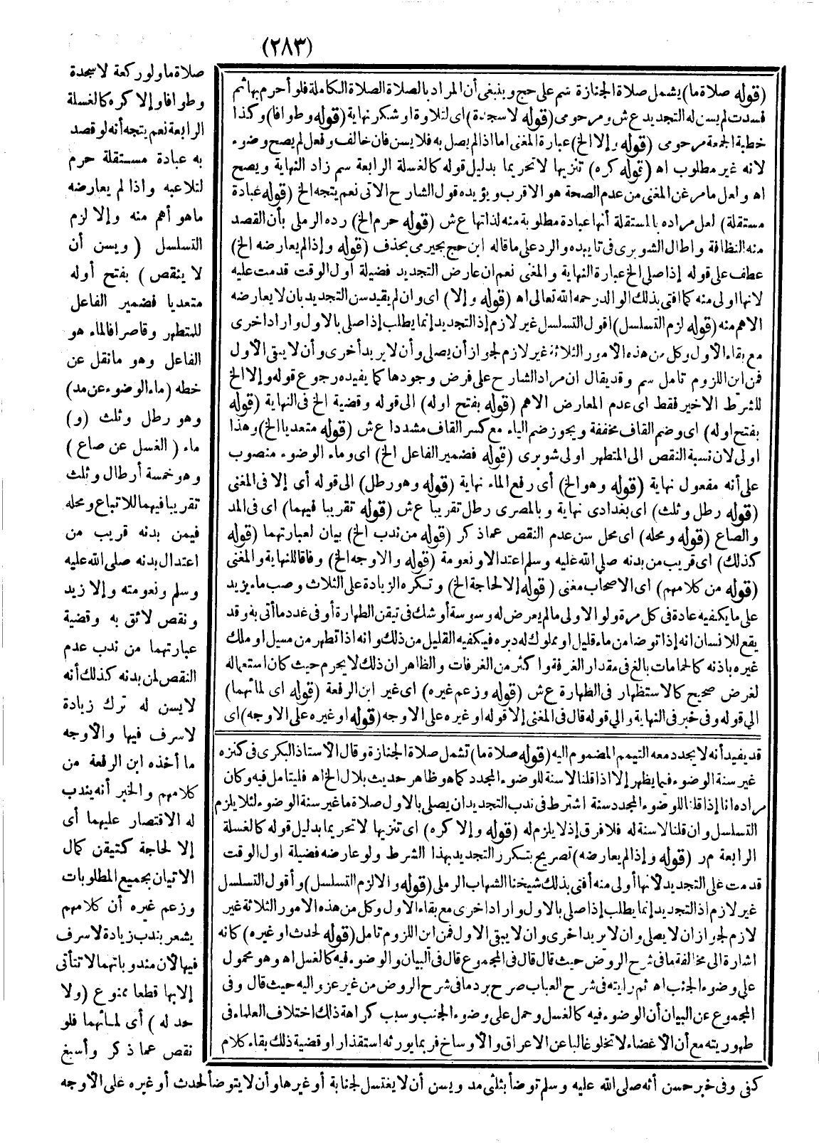 صَلَاةً مَا وَلَوْ رَكْعَةً لَا سَجْدَةً وَطَوَافًا وَإِلَّا كُرِهَ كَالْغَسْلَةِ الرَّابِعَةِ نَعَمْ يُتَّجَهُ أَنَّهُ لَوْ قَصَدَ بِهِ عِبَادَةً مُسْتَقِلَّةً حَرُمَ لِتَلَاعُبِهِ وَإِذَا لَمْ يُعَارِضْهُ مَا هُوَ أَهَمُّ مِنْهُ وَإِلَّا لَزِمَ التَّسَلْسُلُ.