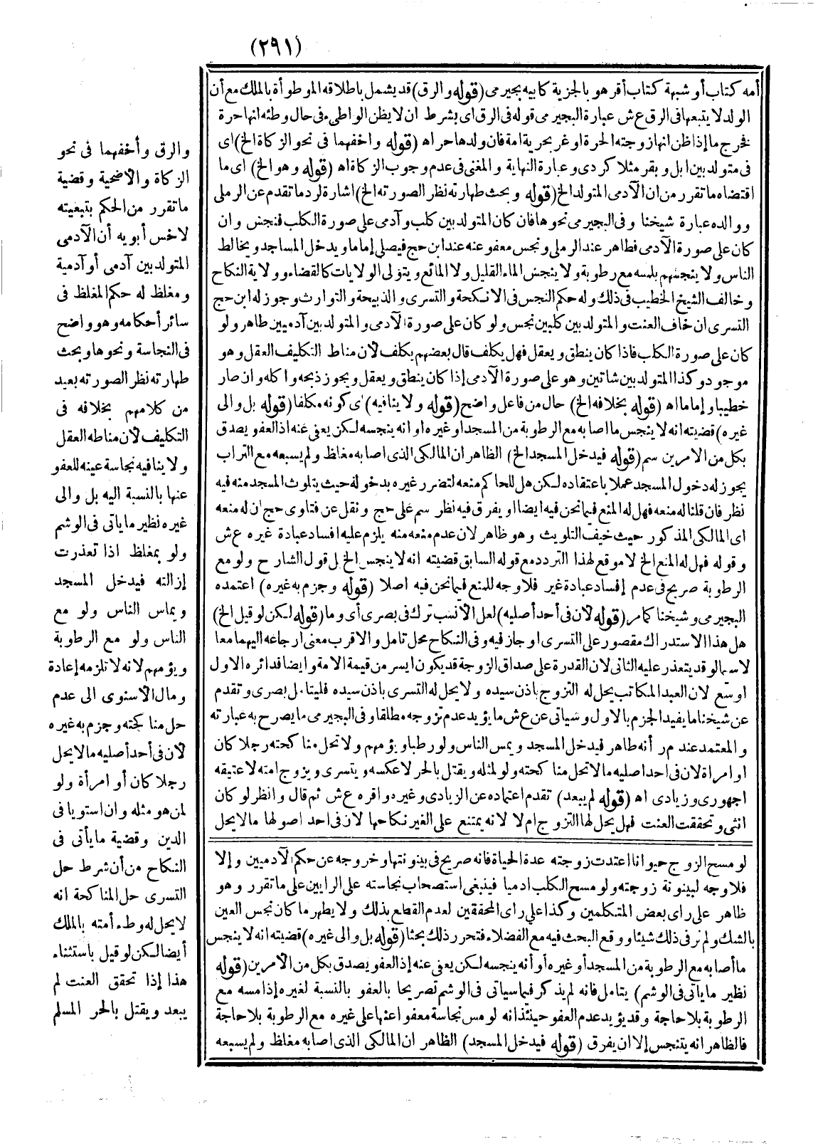 وَكَذَا الْمُتَوَلِّدُ بَيْنَ شَاتَيْنِ وَهُوَ عَلَى صُورَةِ الْآدَمِيِّ إذَا كَانَ يَنْطِقُ وَيَعْقِلُ وَيَجُوزُ ذَبْحُهُ وَأَكْلُهُ وَإِنْ صَارَ خَطِيبًا وَإِمَامًا اهـ. (قَوْلُهُ بِخِلَافِهِ إلَخْ) حَالٌ مِنْ فَاعِلِ وَاضِحٌ (قَوْلُهُ وَلَا يُنَافِيهِ) أَيْ كَوْنُهُ مُكَلَّفًا (قَوْلُهُ بَلْ وَإِلَى غَيْرِهِ) قَضِيَّتُهُ أَنَّهُ لَا يَتَنَجَّسُ مَا أَصَابَهُ مَعَ الرُّطُوبَةِ مِنْ الْمَسْجِدِ أَوْ غَيْرِهِ أَوْ أَنَّهُ يُنَجِّسُهُ لَكِنْ يُعْفَى عَنْهُ إذْ الْعَفْوُ يَصْدُقُ بِكُلٍّ مِنْ الْأَمْرَيْنِ سم (قَوْلُهُ فَيَدْخُلُ الْمَسْجِدَ إلَخْ) الظَّاهِرُ أَنَّ الْمَالِكِيَّ الَّذِي أَصَابَهُ مُغَلَّظٌ وَلَمْ يُسَبِّعْهُ مَعَ التُّرَابِ يَجُوزُ لَهُ دُخُولُ الْمَسْجِدِ عَمَلًا بِاعْتِقَادِهِ لَكِنْ هَلْ لِلْحَاكِمِ مَنْعُهُ لِتَضَرُّرِ غَيْرِهِ بِدُخُولِهِ حَيْثُ يَتَلَوَّثُ الْمَسْجِدُ مِنْهُ فِيهِ نَظَرٌ فَإِنْ قُلْنَا لَهُ مَنْعُهُ فَهَلْ لَهُ الْمَنْعُ فِيمَا نَحْنُ فِيهِ أَيْضًا أَوْ يُفَرَّقُ فِيهِ نَظَرٌ سم عَلَى حَجّ وَنُقِلَ عَنْ فَتَاوَى حَجّ أَنَّ لَهُ مَنْعَهُ أَيْ الْمَالِكِيِّ الْمَذْكُورِ حَيْثُ خِيفَ التَّلْوِيثُ وَهُوَ ظَاهِرٌ؛ لِأَنَّ عَدَمَ مَنْعِهِ مِنْهُ يَلْزَمُ عَلَيْهِ إفْسَادُ عِبَادَةِ غَيْرِهِ ع ش وَقَوْلُهُ فَهَلْ لَهُ الْمَنْعُ إلَخْ لَا مَوْقِعَ لِهَذَا التَّرَدُّدِ مَعَ قَوْلِهِ السَّابِقِ قَضِيَّتُهُ أَنَّهُ لَا يَنْجَسُ إلَخْ بَلْ قَوْلُ الشَّارِحِ وَلَوْ مَعَ الرُّطُوبَةِ صَرِيحٌ فِي عَدَمِ إفْسَادِ عِبَادَةِ غَيْرِهِ فَلَا وَجْهَ لِلْمَنْعِ فِيمَا نَحْنُ فِيهِ أَصْلًا (قَوْلُهُ وَجَزَمَ بِهِ غَيْرُهُ) اعْتَمَدَهُ الْبُجَيْرِمِيُّ وَشَيْخُنَا كَمَا مَرَّ.