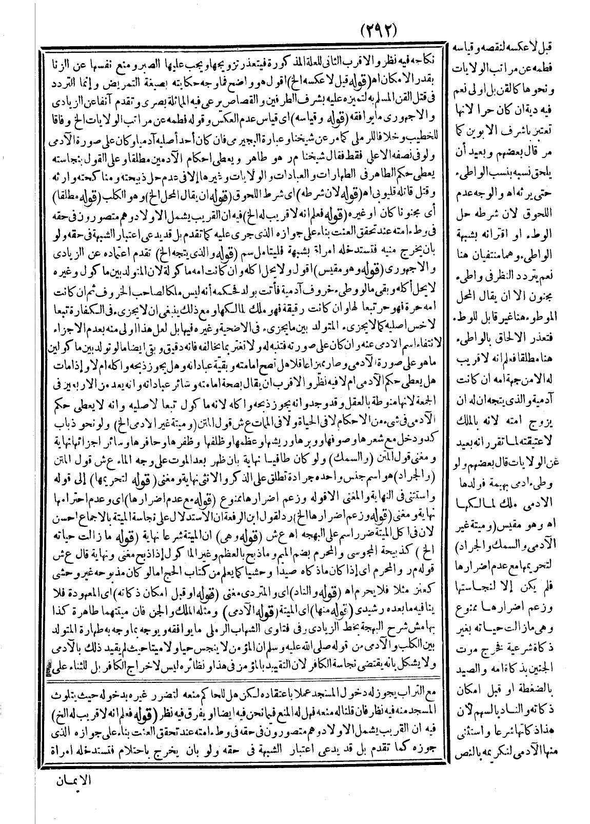ـــــــــــــــــــــــــــــQنِكَاحُهُ فِيهِ نَظَرٌ وَالْأَقْرَبُ الثَّانِي لِلْعِلَّةِ الْمَذْكُورَةِ فَيَتَعَذَّرُ تَزْوِيجُهَا وَيَجِبُ عَلَيْهَا الصَّبْرُ وَمَنْعُ نَفْسِهَا عَنْ الزِّنَا بِقَدْرِ الْإِمْكَانِ اهـ. (قَوْلُهُ قِيلَ لَا عَكْسُهُ إلَخْ) أَقُولُ هُوَ وَاضِحٌ فَمَا وَجْهُ حِكَايَتِهِ بِصِيغَةِ التَّمْرِيضِ وَإِنَّمَا التَّرَدُّدُ فِي قَتْلِ الْقِنِّ الْمُسْلِمِ بِهِ لِتَمَيُّزِهِ عَلَيْهِ بِشَرَفِ الطَّرَفَيْنِ، وَالْقِصَاصُ يُرْعَى فِيهِ الْمُمَاثَلَةُ بَصْرِيٌّ وَتَقَدَّمَ آنِفًا عَنْ الزِّيَادِيِّ وَالْأُجْهُورِيِّ مَا يُوَافِقُهُ (قَوْلُهُ وَقِيَاسُهُ) أَيْ قِيَاسُ عَدَمِ الْعَكْسِ وَقَوْلُهُ فَطْمُهُ عَنْ مَرَاتِبِ الْوِلَايَاتِ إلَخْ وِفَاقًا لِلْخَطِيبِ وَخِلَافًا لِلرَّمْلِيِّ كَمَا مَرَّ عَنْ شَيْخِنَا وَعِبَارَةُ الْبُجَيْرِمِيِّ فَإِنْ كَانَ أَحَدُ أَصْلَيْهِ آدَمِيًّا وَكَانَ عَلَى صُورَةِ الْآدَمِيِّ وَلَوْ فِي نِصْفِهِ الْأَعْلَى فَقَطْ فَقَالَ شَيْخُنَا م ر هُوَ طَاهِرٌ وَيُعْطَى أَحْكَامَ الْآدَمِيِّينَ مُطْلَقًا وَعَلَى الْقَوْلِ بِنَجَاسَتِهِ يُعْطَى حُكْمَ الطَّاهِرِ فِي الطِّهَارَاتِ وَالْعِبَادَاتِ وَالْوِلَايَاتِ وَغَيْرِهَا إلَّا فِي عَدَمِ حِلِّ ذَبِيحَتِهِ وَمُنَاكَحَتِهِ وَارِثَهُ وَقَتْلِ قَاتِلِهِ قَلْيُوبِيٌّ اهـ.