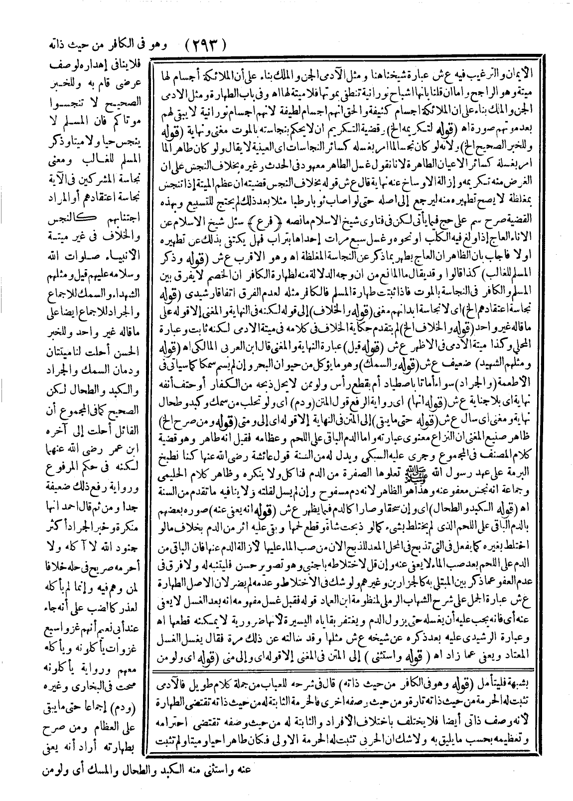 وَفِي بَابِ الطَّهَارَةِ وَمِثْلُ الْآدَمِيِّ الْجِنُّ وَالْمَلَكُ بِنَاءً عَلَى أَنَّ الْمَلَائِكَةَ أَجْسَامٌ كَثِيفَةٌ وَالْحَقُّ أَنَّهُمْ أَجْسَامٌ لَطِيفَةٌ؛ لِأَنَّهُمْ أَجْسَامٌ نُورَانِيَّةٌ لَا يَبْقَى لَهُمْ بَعْدَ مَوْتِهِمْ صُورَةٌ اهـ.