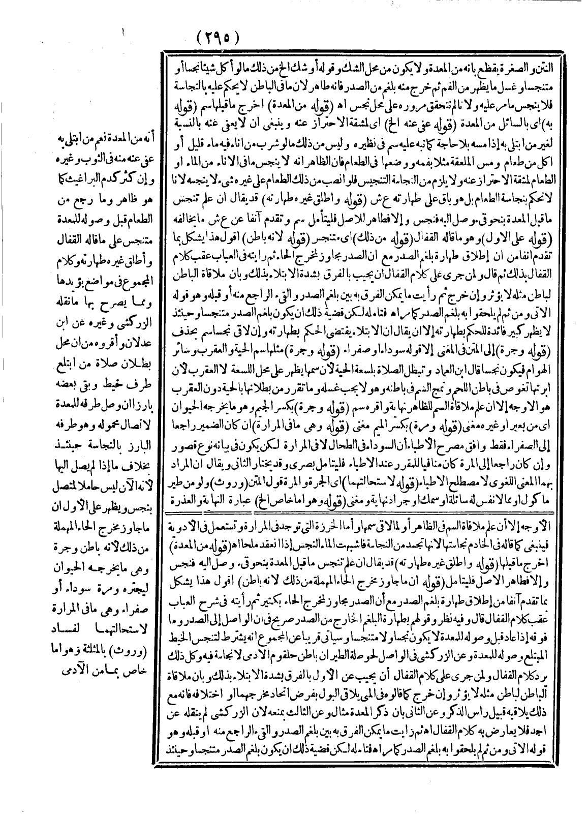 قَالَ وَفِيهِ نَظَرٌ وَقَوْلُهُمْ بِطَهَارَةِ الْبَلْغَمِ الْخَارِجِ مِنْ الصَّدْرِ صَرِيحٌ فِي أَنَّ الْوَاصِلَ إلَى الصَّدْرِ وَمَا فَوْقَهُ إذَا عَادَ قَبْلَ وُصُولِهِ لِلْمَعِدَةِ لَا يَكُونُ نَجِسًا وَلَا مُتَنَجِّسًا وَسَيَأْتِي قَرِيبًا عَنْ الْمَجْمُوعِ أَنَّهُ يُشْتَرَطُ لِتَنَجُّسِ الْخَيْطِ الْمُبْتَلَعِ وُصُولُهُ لِلْمَعِدَةِ وَعَنْ الزَّرْكَشِيّ فِي الْوَاصِلِ لِحَوْصَلَةِ الطَّيْرِ أَنَّ بَاطِنَ حُلْقُومِ الْآدَمِيِّ لَا نَجَاسَةَ فِيهِ وَكُلُّ ذَلِكَ يَرُدُّ كَلَامَ الْقَفَّالِ وَلِمَنْ جَرَى عَلَى كَلَامِ الْقَفَّالِ أَنْ يُجِيبَ عَنْ الْأَوَّلِ بِالْفَرْقِ بِشِدَّةِ الِابْتِلَاءِ بِذَلِكَ وَبِأَنَّ مُلَاقَاةَ الْبَاطِنِ لِبَاطِنٍ مِثْلِهِ لَا يُؤَثِّرُ وَإِنْ خَرَجَ، كَمَا قَالُوهُ فِي الْمَنِيِّ يُلَاقِي الْبَوْلَ بِفَرْضِ اتِّحَادِ مَخْرَجِهِمَا أَوْ اخْتِلَافِهِ فَإِنَّهُ مَعَ ذَلِكَ يُلَاقِيهِ قُبَيْلَ رَأْسِ الذَّكَرِ وَعَنْ الثَّانِي بِأَنَّ ذِكْرَ الْمَعِدَةِ مِثَالٌ وَعَنْ الثَّالِثِ بِمَنْعِهِ؛ لِأَنَّ الزَّرْكَشِيَّ لَمْ يَنْقُلْهُ عَنْ أَحَدٍ فَلَا يُعَارَضُ بِهِ كَلَامُ الْقَفَّالِ اهـ، ثُمَّ رَأَيْت مَا يُمْكِنُ الْفَرْقُ بِهِ بَيْنَ بَلْغَمِ الصَّدْرِ وَالْقَيْءِ الرَّاجِعِ مِنْهُ أَوْ قَبْلَهُ وَهُوَ قَوْلُهُ الْآتِي.