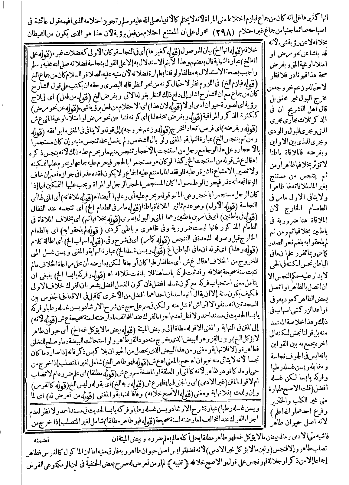 أَنَّهَا كَغَيْرِهَا عَلَى أَنَّهُ كَانَ مِنْ جَمْعٍ فَيَلْزَمُ اخْتِلَاطُ مَنِيِّ الْمَرْأَةِ بِهِ؛ لِأَنَّهُ لَا يَحْتَلِمُ كَالْأَنْبِيَاءِ - صَلَّى اللَّهُ عَلَيْهِ وَسَلَّمَ - وَتَجْوِيزُ احْتِلَامِهِ الَّذِي أَفْهَمَهُ قَوْلُ عَائِشَةَ فِي إصْبَاحِهِ صَائِمًا جُنُبًا مِنْ جِمَاعٍ غَيْرِ احْتِلَامٍ مَحْمُولٌ عَلَى أَنَّ الْمُمْتَنِعَ احْتِلَامٌ مِنْ فِعْلٍ بِرُؤْيَةٍ؛ لِأَنَّ هَذَا هُوَ الَّذِي يَكُونُ مِنْ الشَّيْطَانِ بِخِلَافِهِ لَا عَنْ رُؤْيَةِ شَيْءٍ لِأَنَّهُ قَدْ يَنْشَأُ عَنْ نَحْوِ مَرَضٍ أَوْ امْتِلَاءِ أَوْعِيَةِ الْمَنِيِّ وَبِفَرْضِ صِحَّةِ هَذَا فَهُوَ نَادِرٌ فَلَا نَظَرَ لِاحْتِمَالِهِ وَزَعْمُ خُرُوجِهِ مِنْ مَخْرَجِ الْبَوْلِ غَيْرُ مُحَقَّقٍ بَلْ قَالَ أَهْلُ التَّشْرِيحِ إنَّ فِي الذَّكَرِ ثَلَاثَ مَجَارِي مَجْرًى لِلْمَنِيِّ وَمَجْرًى لِلْبَوْلِ وَالْوَدْيِ وَمَجْرًى لِلْمَذْيِ بَيْنَ الْأَوَّلَيْنِ وَبِفَرْضِهِ فَالْمُلَاقَاةُ بَاطِنًا لَا تُؤَثِّرُ بِخِلَافِهَا ظَاهِرًا وَمِنْ ثَمَّ يَتَنَجَّسُ مِنْ مُسْتَنْجٍ بِغَيْرِ الْمَاءِ لِمُلَاقَاتِهِ لَهَا طَاهِرًا وَلَا يُنَافِي الْأَوَّلُ مَا مَرَّ فِي الطَّعَامِ الْخَارِجِ؛ لِأَنَّ الْمُلَاقَاةَ هُنَا ضَرُورِيَّةٌ فِي بَاطِنَيْنِ بِخِلَافِهَا ثَمَّ وَمِنْ ثَمَّ لَمْ يُلْحِقُوا بِهِ بَلْغَمَ نَحْوِ الصَّدْرِ كَمَا مَرَّ.