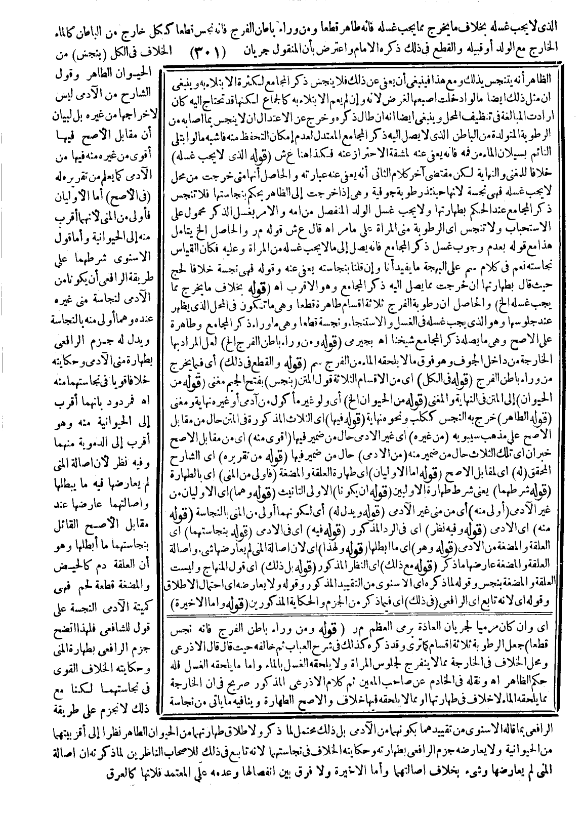 (قَوْلُهُ بِخِلَافِ مَا يَخْرُجُ مِمَّا يَجِبُ غَسْلُهُ إلَخْ) وَالْحَاصِلُ أَنَّ رُطُوبَةَ الْفَرْجِ ثَلَاثُ أَقْسَامٍ طَاهِرَةٌ قَطْعًا وَهِيَ مَا تَكُونُ فِي الْمَحَلِّ الَّذِي يَظْهَرُ عِنْدَ جُلُوسِهَا وَهُوَ الَّذِي يَجِبُ غَسْلُهُ فِي الْغُسْلِ وَالِاسْتِنْجَاءِ، وَنَجِسَةٌ قَطْعًا وَهِيَ مَا وَرَاءَ ذَكَرِ الْمُجَامِعِ، وَطَاهِرَةٌ عَلَى الْأَصَحِّ وَهِيَ مَا يَصِلُهُ ذَكَرُ الْمُجَامِعِ شَيْخُنَا اهـ بُجَيْرِمِيٌّ (قَوْلُهُ وَمِنْ وَرَاءِ بَاطِنِ الْفَرْجِ إلَخْ) لَعَلَّ الْمُرَادَ بِهَا الْخَارِجَةُ مِنْ دَاخِلِ الْجَوْفِ وَهُوَ فَوْقَ مَا لَا يَلْحَقُهُ الْمَاءُ مِنْ الْفَرْجِ سم (قَوْلُهُ وَالْقَطْعُ فِي ذَلِكَ) أَيْ فِيمَا يَخْرُجُ مِنْ وَرَاءِ بَاطِنِ الْفَرْجِ (قَوْلُهُ فِي الْكُلِّ) أَيْ مِنْ الْأَقْسَامِ الثَّلَاثَةِ قَوْلُ الْمَتْنِ (بِنَجَسٍ) بِفَتْحِ الْجِيمِ مُغْنِي (قَوْلُهُ مِنْ الْحَيَوَانِ) إلَى الْمَتْنِ فِي النِّهَايَةِ وَالْمُغْنِي (قَوْلُهُ مِنْ الْحَيَوَانِ إلَخْ) أَيْ وَلَوْ غَيْرَ مَأْكُولٍ مِنْ آدَمِيٍّ أَوْ غَيْرِهِ نِهَايَةٌ وَمُغْنِي (قَوْلُهُ الطَّاهِرُ) خَرَجَ بِهِ النَّجِسُ كَكَلْبٍ وَنَحْوِهِ نِهَايَةٌ (قَوْلُهُ فِيهَا) أَيْ الثَّلَاثِ الْمَذْكُورَةِ فِي الْمَتْنِ حَالٌ مِنْ مُقَابِلِ الْأَصَحِّ عَلَى مَذْهَبِ سِيبَوَيْهِ (مِنْ غَيْرِهِ) أَيْ غَيْرِ الْآدَمِيِّ حَالٌ مِنْ ضَمِيرِ فِيهَا (أَقْوَى مِنْهُ) أَيْ مِنْ مُقَابِلِ الْأَصَحِّ خَبَرَانِ أَيْ تِلْكَ الثَّلَاثُ حَالٌ مِنْ ضَمِيرِ مِنْهُ (مِنْ الْآدَمِيِّ) حَالٌ مِنْ ضَمِيرِ فِيهَا (قَوْلُهُ مِنْ تَقْرِيرِهِ) أَيْ الشَّارِحِ الْمُحَقِّقِ (لَهُ) أَيْ لِمُقَابِلِ الْأَصَحِّ (قَوْلُهُ أَمَّا الْأُولَيَانِ) أَيْ طَهَارَةُ الْعَلَقَةِ وَالْمُضْغَةِ (فَأَوْلَى مِنْ الْمَنِيِّ) أَيْ بِالطَّهَارَةِ (قَوْلُهُ شَرْطُهُمَا) يَعْنِي شَرْطَ طَهَارَةِ الْأُولَيَيْنِ (قَوْلُهُ أَنْ يَكُونَا) الْأَوْلَى التَّأْنِيثُ (قَوْلُهُ وَهُمَا) أَيْ الْأُولَيَانِ مِنْ غَيْرِ الْآدَمِيِّ (أَوْلَى مِنْهُ) أَيْ مِنْ مَنِيِّ غَيْرِ الْآدَمِيِّ (قَوْلُهُ وَيَدُلُّ لَهُ) أَيْ لِكَوْنِهِمَا أَوْلَى مِنْ الْمَنِيِّ بِالنَّجَاسَةِ (قَوْلُهُ مِنْهُ) أَيْ الْآدَمِيِّ (قَوْلُهُ وَفِيهِ نَظَرٌ) أَيْ فِي الرَّدِّ الْمَذْكُورِ (قَوْلُهُ فِيهِ) أَيْ فِي الْآدَمِيِّ (قَوْلُهُ بِنَجَاسَتِهِمَا) أَيْ الْعَلَقَةِ وَالْمُضْغَةِ مِنْ الْآدَمِيِّ (قَوْلُهُ وَهُوَ) أَيْ مَا أَبْطَلَهَا (قَوْلُهُ وَلِهَذَا) أَيْ لِأَنَّ أَصَالَةَ الْمَنِيِّ لَمْ يُعَارِضْهَا شَيْءٌ وَأَصَالَةَ الْعَلَقَةِ وَالْمُضْغَةِ عَارَضَهَا مَا ذَكَرَ (قَوْلُهُ مَعَ ذَلِكَ) أَيْ النَّظَرِ الْمَذْكُورِ (قَوْلُهُ بَلْ ذَلِكَ) أَيْ قَوْلُ الْمِنْهَاجِ وَلَيْسَتْ الْعَلَقَةُ وَالْمُضْغَةُ بِنَجَسٍ وَقَوْلُهُ لِمَا ذَكَرَهُ أَيْ الْإِسْنَوِيُّ مِنْ التَّقْيِيدِ الْمَذْكُورِ وَقَوْلُهُ وَلَا يُعَارِضُهُ أَيْ احْتِمَالُ الْإِطْلَاقِ وَقَوْلُهُ لِأَنَّهُ تَابِعٌ أَيْ الرَّافِعِيُّ (فِي ذَلِكَ) أَيْ فِيمَا ذَكَرَ مِنْ الْجَزْمِ وَالْحِكَايَةِ الْمَذْكُورَيْنِ.