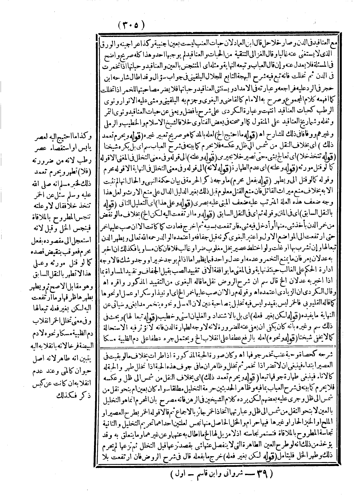 ـــــــــــــــــــــــــــــQمَعَ الْعَنَاقِيدِ فِي الدَّنِّ وَصَارَ خَلًّا حَلَّ قَالَ ابْنُ الْعِمَادِ لِأَنَّ حَبَّاتِ الْعِنَبِ لَيْسَتْ بِعَيْنٍ أَجْنَبِيَّةٍ وَكَذَا عَرَاجِينُهُ وَالْوَرَقُ الَّذِي لَا يُسْتَغْنَى عَنْهُ غَالِبًا وَقَالَ الْغَزَالِيُّ التَّنْقِيَةُ مِنْ الْحَبَّاتِ وَالْعَنَاقِيدِ لَمْ يُوجِبْهَا أَحَدٌ وَهَذَا كُلُّهُ صَرِيحٌ وَاضِحٌ فِي الْمَسْأَلَةِ فَلَا يَعْدِلُ عَنْهُ وَإِنْ قَالَ الْعُبَابُ وَتَبِعَهُ النِّهَايَةُ وَمِثْلُهُ أَيْ الْمُتَنَجِّسُ بِالْعَيْنِ الْعَنَاقِيدُ وَحَبَّاتُهَا إذَا تَخَمَّرَتْ فِي الدَّنِّ ثُمَّ تَخَلَّلَتْ فَإِنَّهُ تَبِعَ فِيهِ شَرْحَ الْبَهْجَةِ التَّابِعِ لِلْجَلَالِ الْبُلْقِينِيِّ فِي جَوَابِ سُؤَالٍ، وَقَدْ أَطَالَ شَارِحُهُ ابْنُ حَجَرٍ فِي الرَّدِّ عَلَيْهِ فَرَاجِعْهُ وَعِبَارَتُهُ فِي الْإِمْدَادِ وَيُسْتَثْنَى الْعَنَاقِيدُ وَحَبَّاتُهَا فَلَا يَضُرُّ مُصَاحَبَتُهَا لِلْخَمْرِ إذَا تَخَلَّلَتْ كَمَا أَفْهَمَهُ كَلَامُ الْمَجْمُوعِ وَصَرَّحَ بِهِ الْإِمَامُ كَالْقَاضِي وَالْبَغَوِيِّ وَجَزَمَ بِهِ الْبُلْقِينِيُّ وَمَشَى عَلَيْهِ الْأَنْوَارُ وَنَوَى الرُّطَبِ كَحَبَّاتِ الْعَنَاقِيدِ انْتَهَتْ وَعِبَارَةُ الْكُرْدِيِّ عَلَى شَرْحِ بَافَضْلٍ وَيُعْفَى عَنْ حَبَّاتِ الْعَنَاقِيدِ وَنَوَى التَّمْرِ وَثُفْلِهِ وَشَمَارِيخِ الْعَنَاقِيدِ عَلَى الْمَنْقُولِ كَمَا أَوْضَحْته فِي بَعْضِ الْفَتَاوَى خِلَافًا لِشَيْخِ الْإِسْلَامِ وَالْخَطِيبِ وَالرَّمْلِيِّ وَغَيْرِهِمْ وَوِفَاقًا فِي ذَلِكَ لِلشَّارِحِ اهـ.