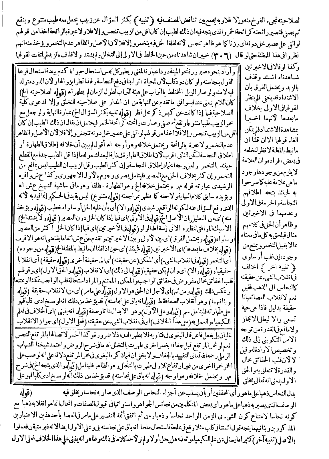 اُخْتُلِفَ فِي انْقِلَابِ الشَّيْءِ عَنْ حَقِيقَتِهِ كَالنُّحَاسِ إلَى الذَّهَبِ فَقِيلَ نَعَمْ لِانْقِلَابِ الْعَصَا ثُعْبَانًا حَقِيقَةً بِدَلِيلِ {فَإِذَا هِيَ حَيَّةٌ تَسْعَى} [طه: 20] وَإِلَّا لَبَطَلَ الْإِعْجَازُ وَلَا مَانِعَ فِي الْقُدْرَةِ مِنْ تَوَجُّهِ الْأَمْرِ التَّكْوِينِيِّ إلَى ذَلِكَ وَتَخْصِيصِ الْإِرَادَةِ لَهُ، وَقِيلَ لَا لِأَنَّ قَلْبَ الْحَقَائِقِ مُحَالٌ وَالْقُدْرَةُ لَا تَتَعَلَّقُ بِهِ، وَالْحَقُّ الْأَوَّلُ بِمَعْنَى أَنَّهُ تَعَالَى يَخْلُقُ بَدَلَ النُّحَاسِ ذَهَبًا عَلَى مَا هُوَ رَأْيُ الْمُحَقِّقِينَ أَوْ بِأَنْ يَسْلُبَ عَنْ أَجْزَاءِ النُّحَاسِ الْوَصْفَ الَّذِي صَارَ بِهِ نُحَاسًا وَيَخْلُقُ فِيهِ الْوَصْفَ الَّذِي يَصِيرُ بِهِ ذَهَبًا عَلَى مَا هُوَ رَأْيُ بَعْضِ الْمُتَكَلِّمِينَ مِنْ تَجَانُسِ الْجَوَاهِرِ وَاسْتِوَائِهَا فِي قَبُولِ الصِّفَاتِ، وَالْمُحَالُ إنَّمَا هُوَ انْقِلَابُهُ ذَهَبًا مَعَ كَوْنِهِ نُحَاسًا لِامْتِنَاعِ كَوْنِ الشَّيْءِ فِي الزَّمَنِ الْوَاحِدِ نُحَاسًا وَذَهَبًا، وَمِنْ ثَمَّ اتَّفَقَ أَئِمَّةُ التَّفْسِيرِ عَلَى مَا مَرَّ فِي الْعَصَا بِأَحَدِ هَذَيْنِ الِاعْتِبَارَيْنِ الْمَذْكُورَيْنِ وَبِثَانِيهِمَا يُتَّجَهُ قَوْلُ أَئِمَّتِنَا فِي كَلْبٍ مَثَلًا وَقَعَ فِي مَمْلَحَةٍ فَاسْتَحَالَ مِلْحًا أَنَّهُ بَاقٍ عَلَى نَجَاسَتِهِ بَلْ وَعَلَى الْأَوَّلِ أَيْضًا؛ لِأَنَّهُ غَيْرُ مُتَيَقَّنٍ فَعَمِلُوا بِالْأَصْلِ (تَنْبِيهٌ آخَرُ)