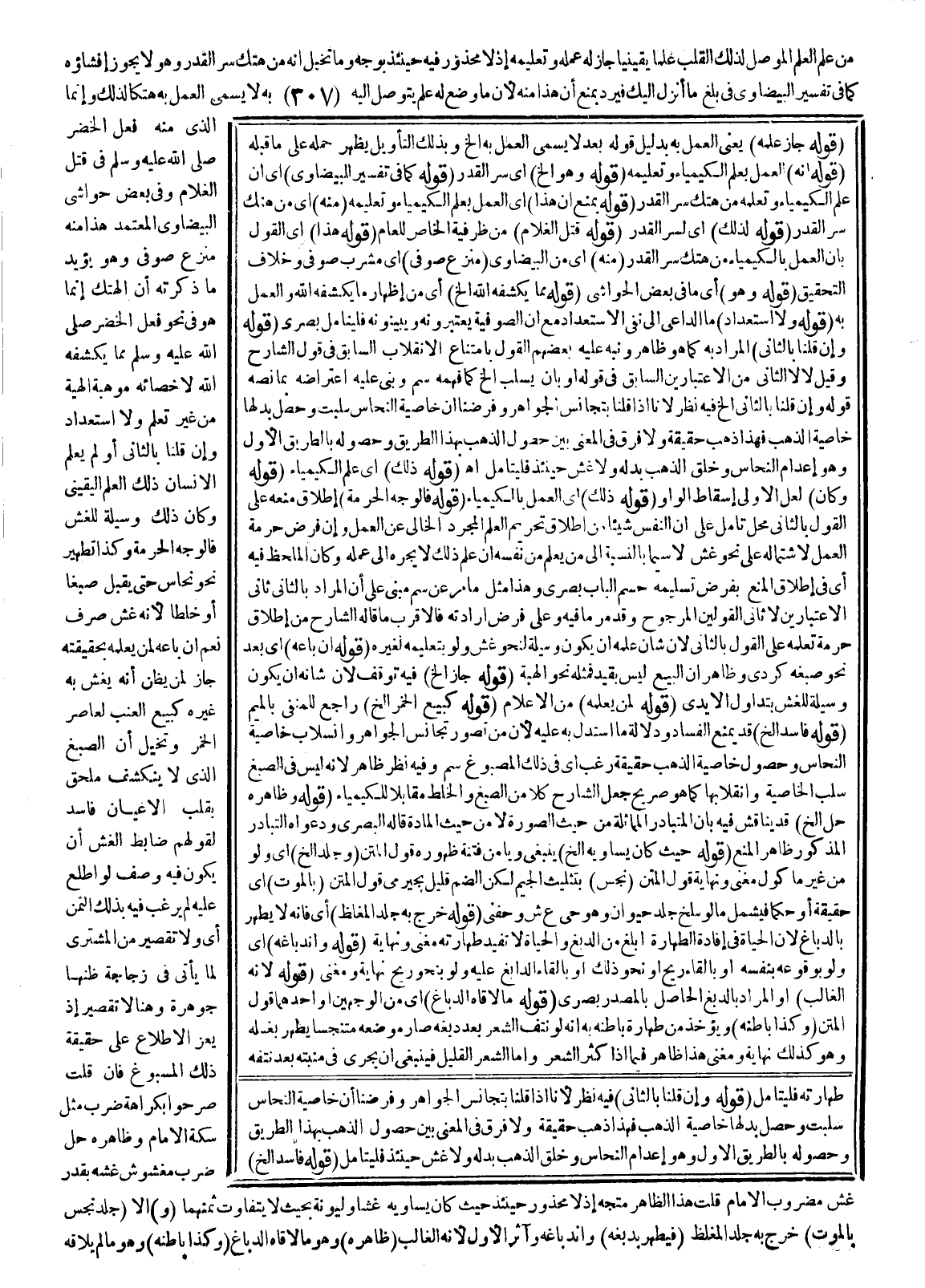ـــــــــــــــــــــــــــــQقَوْلُهُ: جَازَ لَهُ عَمَلُهُ) يَعْنِي الْعَمَلَ بِهِ بِدَلِيلِ قَوْلِهِ بَعْدُ لَا يُسَمَّى الْعَمَلُ بِهِ إلَخْ وَبِذَلِكَ التَّأْوِيلِ يَظْهَرُ حَمْلُهُ عَلَى مَا قَبْلَهُ (قَوْلُهُ أَنَّهُ) الْعَمَلُ بِعِلْمِ الْكِيمْيَاءِ وَتَعْلِيمِهِ (قَوْلُهُ وَهُوَ إلَخْ) أَيْ سِرُّ الْقَدَرِ (قَوْلُهُ كَمَا فِي تَفْسِيرِ الْبَيْضَاوِيِّ) أَيْ إنَّ عِلْمَ الْكِيمْيَاءِ وَتَعَلُّمَهُ مِنْ هَتْكِ سِرِّ الْقَدَرِ (قَوْلُهُ بِمَنْعِ أَنَّ هَذَا) أَيْ الْعَمَلَ بِعِلْمِ الْكِيمْيَاءِ وَتَعْلِيمِهِ (مِنْهُ) أَيْ مِنْ هَتْكِ سِرِّ الْقَدَرِ (قَوْلُهُ لِذَلِكَ) أَيْ لِسِرِّ الْقَدَرِ (قَوْلُهُ قَتْلِ الْغُلَامِ) مِنْ ظَرْفِيَّةِ الْخَاصِّ لِلْعَامِّ (قَوْلُهُ هَذَا) أَيْ الْقَوْلُ بِأَنَّ الْعَمَلَ بِالْكِيمْيَاءِ مِنْ هَتْكِ سِرِّ الْقَدَرِ (مِنْهُ) أَيْ مِنْ الْبَيْضَاوِيِّ.