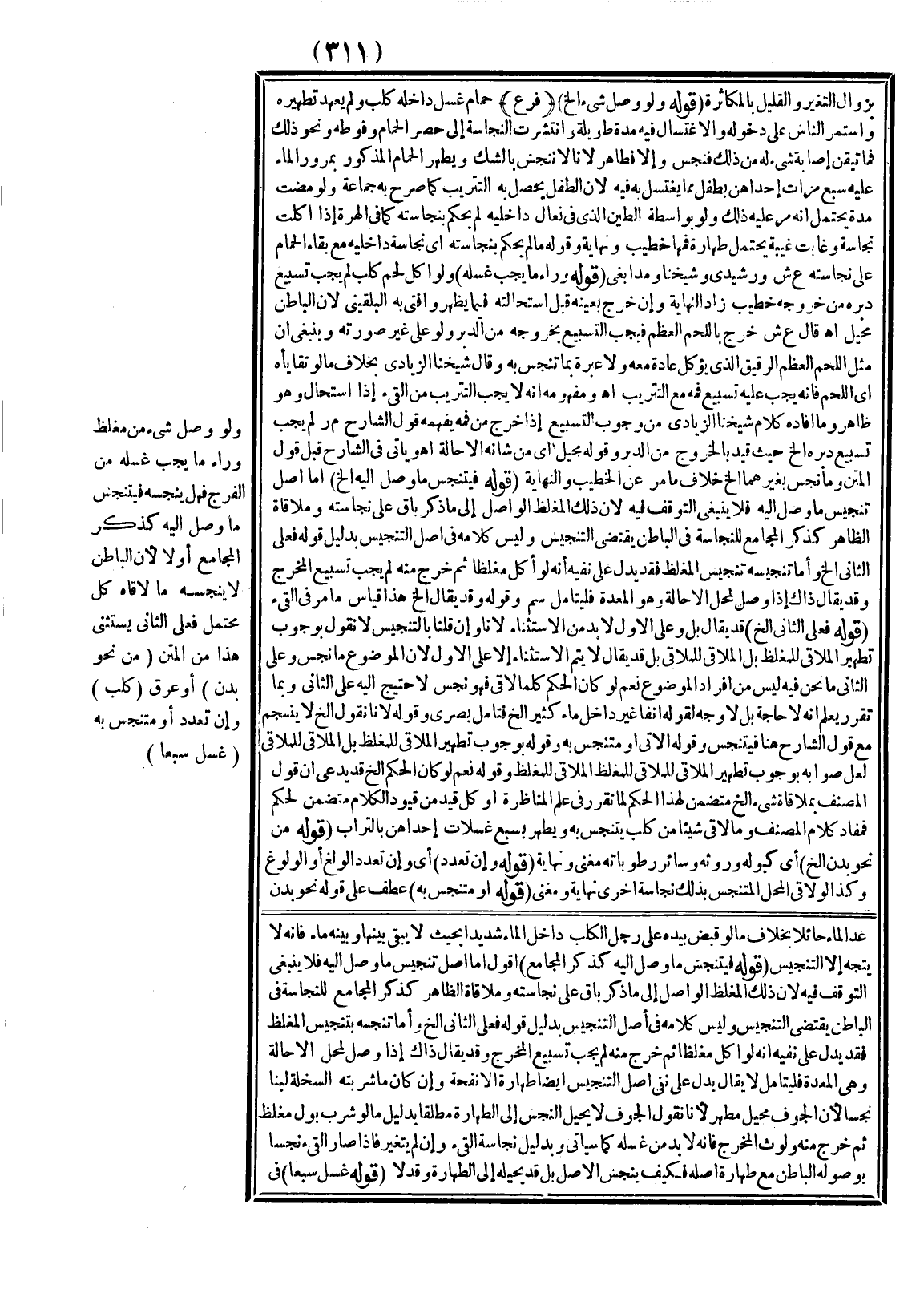 وَيَأْتِي فِي الشَّارِحِ قَبْلَ قَوْلِ الْمَتْنِ وَمَا نَجِسَ بِغَيْرِهِمَا إلَخْ خِلَافُ مَا مَرَّ عَنْ الْخَطِيبِ وَالنِّهَايَةِ (قَوْلُهُ فَيَتَنَجَّسُ مَا وَصَلَ إلَيْهِ إلَخْ) أَمَّا أَصْلُ تَنْجِيسِ مَا وَصَلَ إلَيْهِ فَلَا يَنْبَغِي التَّوَقُّفُ فِيهِ؛ لِأَنَّ ذَلِكَ الْمُغَلَّظَ الْوَاصِلَ إلَى مَا ذُكِرَ بَاقٍ عَلَى نَجَاسَتِهِ وَمُلَاقَاةُ الظَّاهِرِ كَذَكَرِ الْمُجَامِعِ لِلنَّجَاسَةِ فِي الْبَاطِنِ يَقْتَضِي التَّنْجِيسَ وَلَيْسَ كَلَامُهُ فِي أَصْلِ التَّنْجِيسِ بِدَلِيلِ قَوْلِهِ فَعَلَى الثَّانِي إلَخْ، وَأَمَّا تَنْجِيسُهُ تَنْجِيسَ الْمُغَلَّظِ فَقَدْ يَدُلُّ عَلَى نَفْيِهِ أَنَّهُ لَوْ أَكَلَ مُغَلَّظًا ثُمَّ خَرَجَ مِنْهُ لَمْ يَجِبْ تَسْبِيعُ الْمَخْرَجِ، وَقَدْ يُقَالُ ذَاكَ إذَا وَصَلَ لِمَحَلِّ الْإِحَالَةِ وَهُوَ الْمَعِدَةُ فَلْيُتَأَمَّلْ سم وَقَوْلُهُ وَقَدْ يُقَالُ إلَخْ هَذَا قِيَاسُ مَا مَرَّ فِي الْقَيْءِ (قَوْلُهُ فَعَلَى الثَّانِي إلَخْ) قَدْ يُقَالُ بَلْ وَعَلَى الْأَوَّلِ لَا بُدَّ مِنْ الِاسْتِثْنَاءِ؛ لِأَنَّا وَإِنْ قُلْنَا بِالتَّنْجِيسِ لَا نَقُولُ بِوُجُوبِ تَطْهِيرِ الْمُلَاقِي لِلْمُغَلَّظِ بَلْ الْمُلَاقِي لِلْمُلَاقِي، بَلْ قَدْ يُقَالُ لَا يَتِمُّ الِاسْتِثْنَاءُ إلَّا عَلَى الْأَوَّلِ؛ لِأَنَّ الْمَوْضُوعَ مَا نَجِسَ وَعَلَى الثَّانِي مَا نَحْنُ فِيهِ لَيْسَ مِنْ أَفْرَادِ الْمَوْضُوعِ نَعَمْ لَوْ كَانَ الْحُكْمُ كُلَّمَا لَاقَى فَهُوَ نَجِسٌ لَاحْتِيجَ إلَيْهِ عَلَى الثَّانِي وَبِمَا تَقَرَّرَ يُعْلَمُ أَنَّهُ لَا حَاجَةَ بَلْ لَا وَجْهَ لِقَوْلِهِ آنِفًا غَيْرُ دَاخِلِ مَاءٍ كَثِيرٍ إلَخْ فَتَأَمَّلْ بَصْرِيٌّ وَقَوْلُهُ لَا نَقُولُ إلَخْ لَا يَنْسَجِمُ مَعَ قَوْلِ الشَّارِحِ هُنَا فَيَتَنَجَّسُ وَقَوْلُهُ الْآتِي أَوْ مُتَنَجِّسٌ بِهِ وَقَوْلُهُ بِوُجُوبِ تَطْهِيرِ الْمُلَاقِي لِلْمُغَلَّظِ بَلْ الْمُلَاقِي لِلْمُلَاقِي لَعَلَّ صَوَابَهُ بِوُجُوبِ تَطْهِيرِ الْمُلَاقِي لِلْمُلَاقِي لِلْمُغَلَّظِ الْمُلَاقِي لِلْمُغَلَّظِ وَقَوْلُهُ نَعَمْ لَوْ كَانَ الْحُكْمُ إلَخْ قَدْ يُدَّعَى أَنَّ قَوْلَ الْمُصَنِّفِ بِمُلَاقَاةِ شَيْءٍ إلَخْ مُتَضَمِّنٌ لِهَذَا الْحُكْمِ لِمَا تَقَرَّرَ فِي عِلْمِ الْمُنَاظَرَةِ أَنَّ كُلَّ قَيْدٍ مِنْ قُيُودِ الْكَلَامِ مُتَضَمِّنٌ لِحُكْمٍ فَمُفَادُ كَلَامِ الْمُصَنِّفِ وَمَا لَاقَى شَيْئًا مِنْ كَلْبٍ يَتَنَجَّسُ بِهِ وَيَطْهُرُ بِسَبْعِ غَسَلَاتٍ إحْدَاهُنَّ بِالتُّرَابِ (قَوْلُهُ مِنْ نَحْوِ بَدَنٍ إلَخْ) أَيْ كَبَوْلِهِ وَرَوْثِهِ وَسَائِرِ رُطُوبَاتِهِ مُغْنِي وَنِهَايَةٌ (قَوْلُهُ وَإِنْ تَعَدَّدَ) أَيْ وَإِنْ تَعَدَّدَ الْوَالِغُ أَوْ الْوُلُوغُ وَكَذَا لَوْ لَاقَى الْمَحَلَّ الْمُتَنَجِّسَ بِذَلِكَ نَجَاسَةٌ أُخْرَى نِهَايَةٌ وَمُغْنِي (قَوْلُهُ أَوْ مُتَنَجِّسٌ بِهِ) عَطْفٌ عَلَى قَوْلِهِ نَحْوِ بَدَنٍ