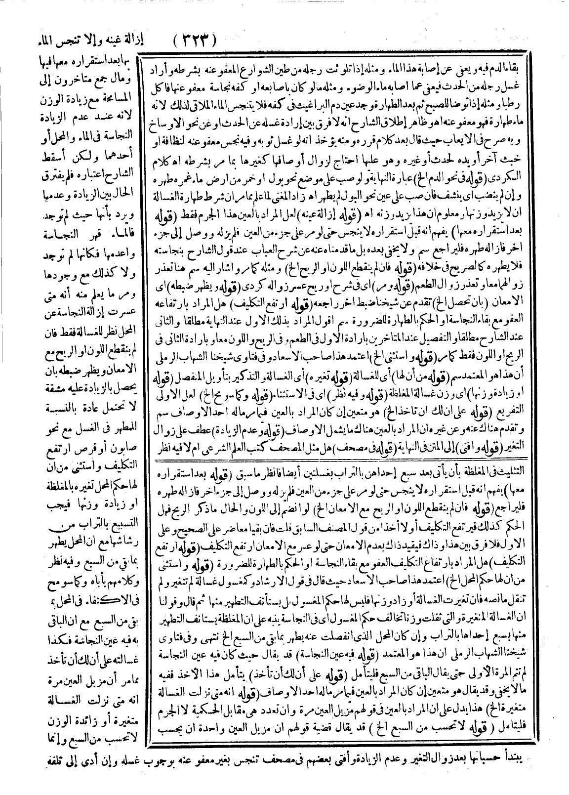 (قَوْلُهُ إزَالَةُ عَيْنِهِ) لَعَلَّ الْمُرَادَ بِالْعَيْنِ هَذَا الْجِرْمُ فَقَطْ (قَوْلُهُ بَعْدَ اسْتِقْرَارِهِ مَعَهَا) يُفْهَمُ أَنَّهُ قَبْلَ اسْتِقْرَارِهِ لَا يَنْجَسُ حَتَّى لَوْ مَرَّ عَلَى جَزْءٍ مِنْ الْعَيْنِ فَلَمْ يُزِلْهُ وَوَصَلَ إلَى جَزْءٍ آخَرَ فَأَزَالَهُ طَهَّرَهُ فَلْيُرَاجَعْ سم وَلَا يَخْفَى بَعْدَهُ بَلْ مَا قَدَّمْنَاهُ عَنْهُ عَنْ شَرْحِ الْعُبَابِ عِنْدَ قَوْلِ الشَّارِحِ بِنَجَاسَتِهِ فَلَا يُطَهِّرُهُ كَالصَّرِيحِ فِي خِلَافِهِ (قَوْلُهُ فَإِنْ لَمْ يَنْقَطِعْ اللَّوْنُ أَوْ الرِّيحُ إلَخْ) وَمَثَّلَهُ كَمَا مَرَّ وَأَشَارَ إلَيْهِ سم هُنَا تَعَذَّرَ زَوَالُهُمَا مَعًا وَتَعَذَّرَ زَوَالُ الطَّعْمِ (قَوْلُهُ وَمَرَّ) أَيْ فِي شَرْحِ أَوْ رِيحٌ عَسُرَ زَوَالُهُ كُرْدِيٌّ (قَوْلُهُ وَيَظْهَرُ ضَبْطُهُ) أَيْ الْإِمْعَانُ (بِأَنْ تَحْصُلَ إلَخْ) تَقَدَّمَ عَنْ شَيْخِنَا ضَبْطٌ آخَرُ رَاجِعْهُ (قَوْلُهُ ارْتَفَعَ التَّكْلِيفُ) هَلْ الْمُرَادُ بِارْتِفَاعِهِ الْعَفْوُ مَعَ بَقَاءِ النَّجَاسَةِ أَوْ الْحُكْمُ بِالطَّهَارَةِ لِلضَّرُورَةِ سم أَقُولُ الْمُرَادُ بِذَلِكَ الْأَوَّلُ عِنْدَ النِّهَايَةِ مُطْلَقًا وَالثَّانِي عِنْدَ الشَّارِحِ مُطْلَقًا وَالتَّفْصِيلُ عِنْدَ الْمُتَأَخِّرِينَ بِإِرَادَةِ الْأَوَّلِ فِي الطَّعْمِ وَفِي الرِّيحِ وَاللَّوْنِ مَعًا وَبِإِرَادَةِ الثَّانِي فِي الرِّيحِ أَوْ اللَّوْنِ فَقَطْ كَمَا مَرَّ (قَوْلُهُ وَاسْتَثْنَى إلَخْ) اعْتَمَدَ هَذَا صَاحِبُ الْإِسْعَادِ وَفِي فَتَاوَى شَيْخِنَا الشِّهَابِ الرَّمْلِيِّ أَنَّ هَذَا هُوَ الْمُعْتَمَدُ سم (قَوْلُهُ مِنْ أَنَّ لَهَا) أَيْ لِلْغُسَالَةِ (قَوْلُهُ تَغَيُّرُهُ) أَيْ الْغُسَالَةِ وَالتَّذْكِيرُ بِتَأْوِيلِ الْمُنْفَصِلِ (قَوْلُهُ أَوْ زِيَادَةُ وَزْنِهَا) أَيْ وَزْنِ غُسَالَةِ الْمُغَلَّظَةِ (قَوْلُهُ وَفِيهِ نَظَرٌ) أَيْ فِي الِاسْتِثْنَاءِ (قَوْلُهُ وَكَمَا سُومِحَ إلَخْ) لَعَلَّ الْأَوْلَى التَّفْرِيعُ (قَوْلُهُ عَلَى أَنَّ لَك أَنْ تَأْخُذَ إلَخْ) هُوَ مُتَعَيِّنٌ إنْ كَانَ الْمُرَادُ بِالْعَيْنِ فِيمَا مَرَّ مَا لَهُ أَحَدُ الْأَوْصَافِ سم وَتَقَدَّمَ هُنَاكَ عَنْهُ وَعَنْ غَيْرِهِ أَنَّ الْمُرَادَ بِالْعَيْنِ هُنَاكَ مَا يَشْمَلُ الْأَوْصَافَ (قَوْلُهُ وَعَدَمُ الزِّيَادَةِ) عَطْفٌ عَلَى زَوَالِ التَّغَيُّرِ (قَوْلُهُ وَأَفْتَى) إلَى الْمَتْنِ فِي النِّهَايَةِ (قَوْلُهُ فِي مُصْحَفٍ) هَلْ مِثْلُ الْمُصْحَفِ كُتُبُ الْعِلْمِ الشَّرْعِيِّ أَمْ لَا فِيهِ نَظَرٌ