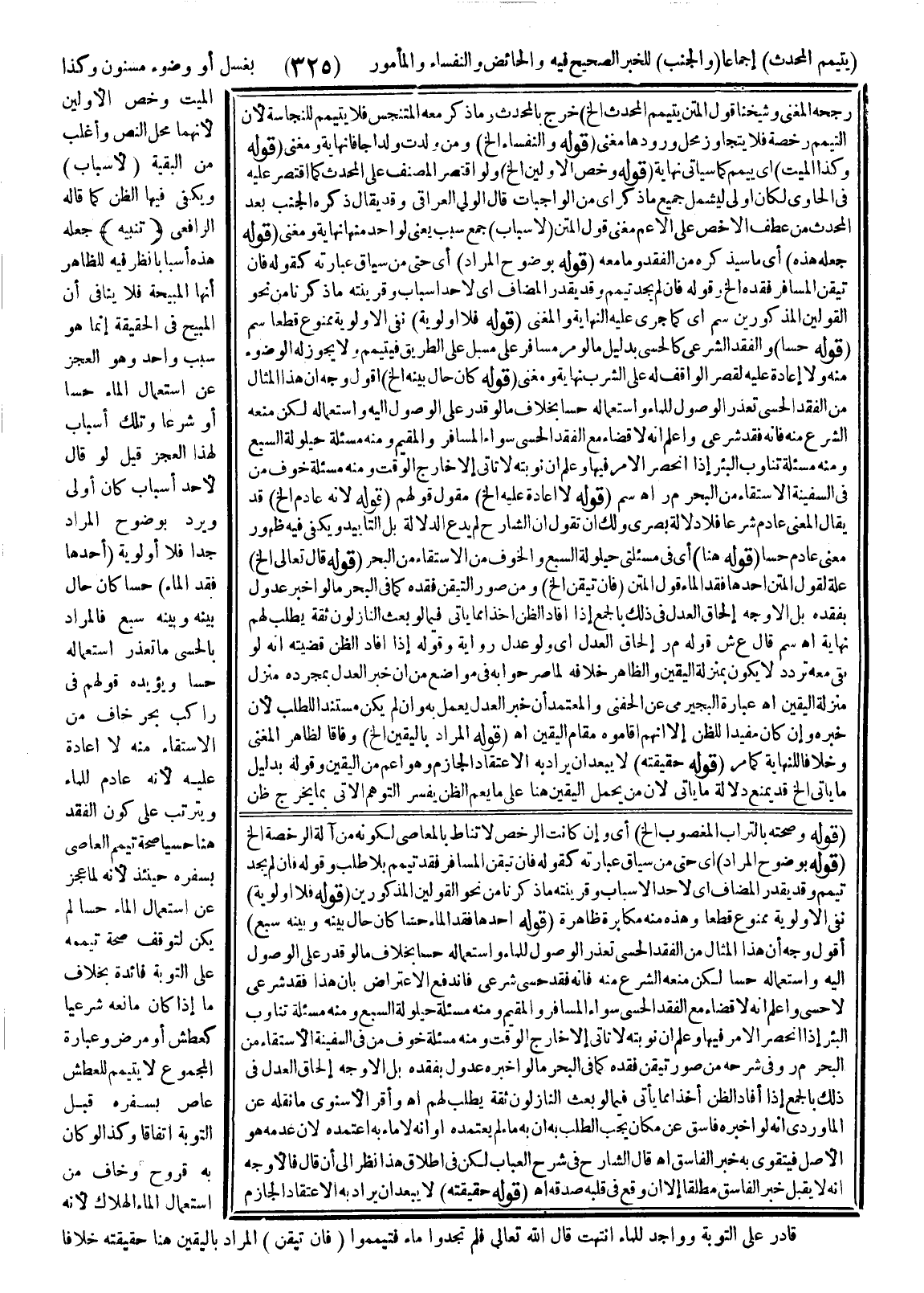 ـــــــــــــــــــــــــــــSقَوْلُهُ وَصِحَّتُهُ بِالتُّرَابِ الْمَغْصُوبِ إلَخْ) أَيْ وَإِنْ كَانَتْ الرُّخَصُ لَا تُنَاطُ بِالْمَعَاصِي لِكَوْنِهِ مِنْ آلَةِ الرُّخْصَةِ إلَخْ. (قَوْلُهُ بِوُضُوحِ الْمُرَادِ) أَيْ حَتَّى مِنْ سِيَاقِ عِبَارَتِهِ كَقَوْلِهِ فَإِنْ تَيَقَّنَ الْمُسَافِرُ فَقْدَهُ تَيَمَّمَ بِلَا طَلَبٍ، وَقَوْلِهِ فَإِنْ لَمْ يَجِدْ تَيَمَّمَ، وَقَدْ يُقَدَّرُ الْمُضَافُ أَيْ لِأَحَدِ الْأَسْبَابِ وَقَرِينَتُهُ مَا ذَكَرْنَا مِنْ نَحْوِ الْقَوْلَيْنِ الْمَذْكُورَيْنِ (قَوْلُهُ فَلَا أَوْلَوِيَّةَ) نَفْيُ الْأَوْلَوِيَّةِ مَمْنُوعٌ قَطْعًا وَهَذِهِ مِنْهُ مُكَابَرَةٌ ظَاهِرَةٌ. (قَوْلُهُ أَحَدُهَا فَقْدُ الْمَاءِ حِسًّا كَأَنْ حَالَ بَيْنَهُ وَبَيْنَهُ سَبُعٌ) أَقُولُ وَجْهُ هَذَا الْمِثَالَ مِنْ الْفَقْدِ الْحِسِّيِّ تَعَذُّرُ الْوُصُولِ لِلْمَاءِ وَاسْتِعْمَالُهُ حِسًّا بِخِلَافِ مَا لَوْ قَدَرَ عَلَى الْوُصُولِ إلَيْهِ وَاسْتِعْمَالِهِ حِسًّا لَكِنْ مَنَعَهُ الشَّرْعُ مِنْهُ فَإِنَّهُ فَقْدٌ حِسِّيٌّ شَرْعِيٌّ فَانْدَفَعَ الِاعْتِرَاضُ بِأَنَّ هَذَا فَقْدٌ شَرْعِيٌّ لَا حِسِّيٌّ وَاعْلَمْ أَنَّهُ لَا قَضَاءَ مَعَ الْفَقْدِ الْحِسِّيِّ سَوَاءٌ الْمُسَافِرُ وَالْمُقِيمُ وَمِنْهُ مَسْأَلَةُ حَيْلُولَةِ السَّبُعِ وَمِنْهُ مَسْأَلَةُ تَنَاوُبِ الْبِئْرِ إذَا انْحَصَرَ الْأَمْرُ فِيهَا وَعَلِمَ أَنَّ نَوْبَتَهُ لَا تَأْتِي إلَّا خَارِجَ الْوَقْتِ وَمِنْهُ مَسْأَلَةُ خَوْفِ مَنْ فِي السَّفِينَةِ الِاسْتِقَاءَ مِنْ الْبَحْرِ م ر وَفِي شَرْحِهِ مِنْ صُوَرِ تَيَقُّنِ فَقْدِهِ كَمَا فِي الْبَحْرِ مَا لَوْ أَخْبَرَهُ عُدُولٌ بِفَقْدِهِ بَلْ الْأَوْجَهُ إلْحَاقُ الْعَدْلِ فِي ذَلِكَ بِالْجَمْعِ إذَا أَفَادَ الظَّنَّ أَخْذًا مِمَّا يَأْتِي فِيمَا لَوْ بَعَثَ النَّازِلُونَ ثِقَةً يَطْلُبُ لَهُمْ اهـ وَأَقَرَّ الْإِسْنَوِيُّ مَا نَقَلَهُ عَنْ الْمَاوَرْدِيِّ أَنَّهُ لَوْ أَخْبَرَهُ فَاسِقٌ عَنْ مَكَان يَجِبُ الطَّلَبُ بِهِ أَنَّ بِهِ مَاءً لَمْ يَعْتَمِدْهُ أَوْ أَنَّهُ لَا مَاءَ بِهِ اعْتَمَدَهُ؛ لِأَنَّ عَدَمَهُ هُوَ الْأَصْلُ فَيَتَقَوَّى بِهِ خَبَرُ الْفَاسِقِ اهـ قَالَ الشَّارِحِ فِي شَرْحِ الْعُبَابِ لَكِنْ فِي إطْلَاقِ هَذَا نَظَرٌ إلَى أَنْ قَالَ فَالْأَوْجَهُ أَنَّهُ لَا يُقْبَلُ خَبَرُ الْفَاسِقِ مُطْلَقًا إلَّا إنْ وَقَعَ فِي قَلْبِهِ صِدْقُهُ اهـ. .