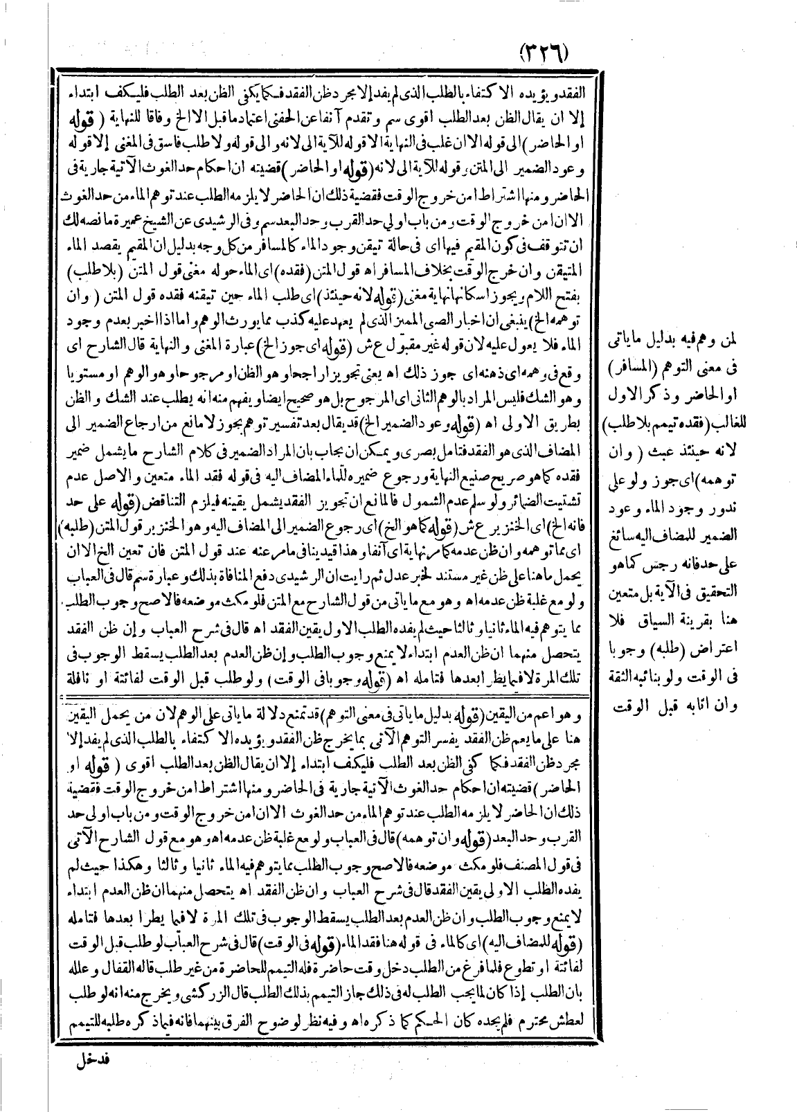 ـــــــــــــــــــــــــــــSوَهُوَ أَعَمُّ مِنْ الْيَقِينِ (قَوْلُهُ بِدَلِيلِ مَا يَأْتِي فِي مَعْنَى التَّوَهُّمِ) قَدْ تُمْنَعُ دَلَالَةُ مَا يَأْتِي عَلَى الْوَهْمِ؛ لِأَنَّ مَنْ يَحْمِلُ الْيَقِينَ هُنَا عَلَى مَا يَعُمُّ ظَنَّ الْفَقْدِ يُفَسِّرُ التَّوَهُّمَ الْآتِيَ بِمَا يُخْرِجُ ظَنَّ الْفَقْدِ وَيُؤَيِّدُهُ الِاكْتِفَاءُ بِالطَّلَبِ الَّذِي لَمْ يُفِدْ إلَّا مُجَرَّدَ ظَنِّ الْفَقْدِ فَكَمَا كَفَى الظَّنُّ بَعْدَ الطَّلَبِ فَلْيَكْفِ ابْتِدَاءٌ إلَّا أَنْ يُقَالَ الظَّنُّ بَعْدَ الطَّلَبِ أَقْوَى. (قَوْلُهُ أَوْ الْحَاضِرُ) قَضِيَّتُهُ أَنَّ أَحْكَامَ حَدِّ الْغَوْثِ الْآتِيَةَ جَارِيَةٌ فِي الْحَاضِرِ، وَمِنْهَا اشْتِرَاطُ أَمْنِ خُرُوجِ الْوَقْتِ فَقَضِيَّةُ ذَلِكَ أَنَّ الْحَاضِرَ لَا يَلْزَمُهُ الطَّلَبُ عِنْدَ تَوَهُّمِ الْمَاءِ مِنْ حَدِّ الْغَوْثِ إلَّا إنْ أَمِنَ خُرُوجَ الْوَقْتِ وَمِنْ بَابِ أَوْلَى حَدُّ الْقُرْبِ وَحَدُّ الْبُعْدِ.