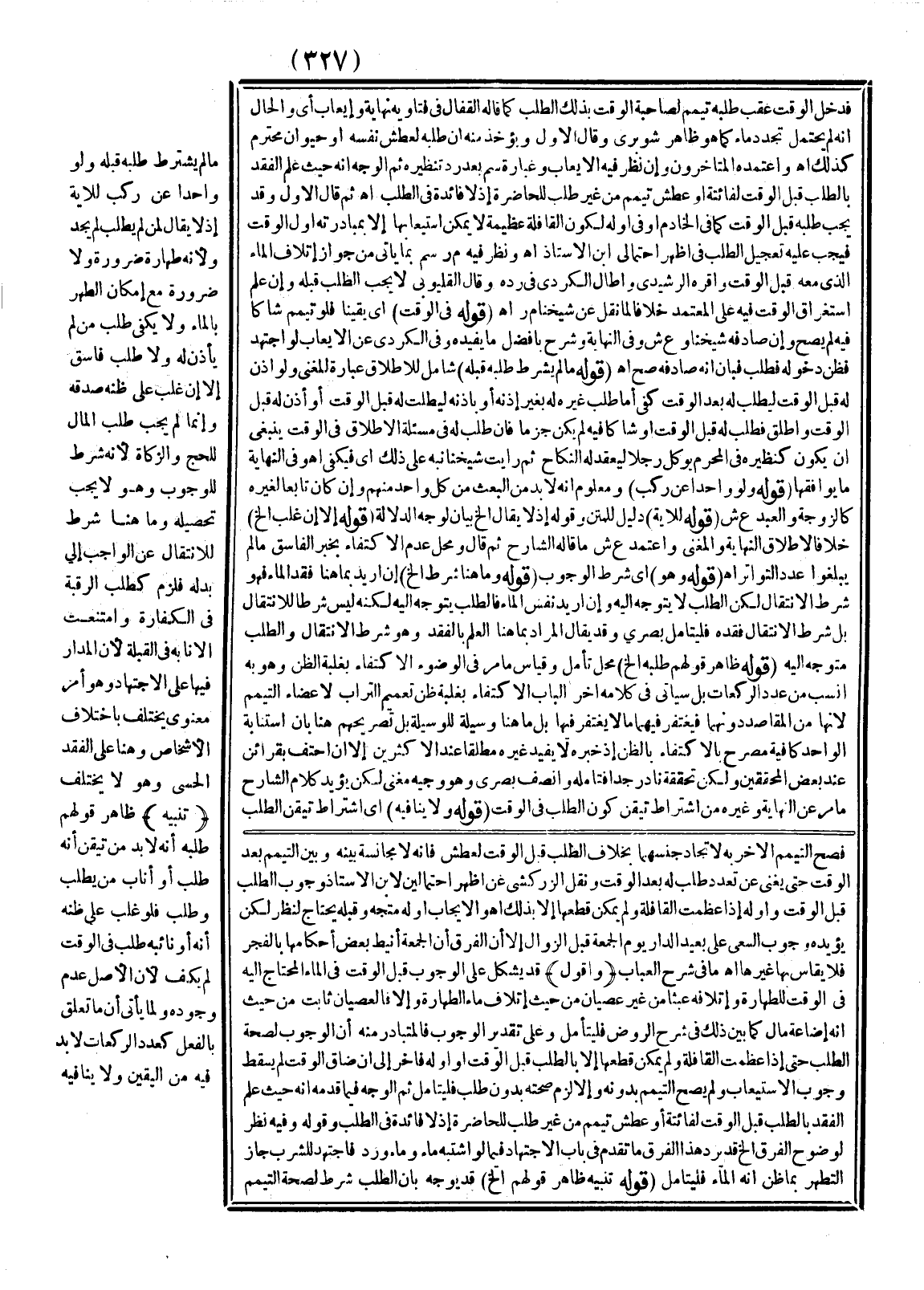 ـــــــــــــــــــــــــــــQفَدَخَلَ الْوَقْتُ عَقِبَ طَلَبِهِ تَيَمَّمَ لِصَاحِبَةِ الْوَقْتِ بِذَلِكَ الطَّلَبِ كَمَا قَالَهُ الْقَفَّالُ فِي فَتَاوِيهِ نِهَايَةٌ وَإِيعَابٌ أَيْ وَالْحَالُ أَنَّهُ لَمْ يُحْتَمَلْ تَجَدُّدُ مَاءٍ كَمَا هُوَ ظَاهِرٌ شَوْبَرِيٌّ وَقَالَ الْأَوَّلُ يُؤْخَذُ مِنْهُ أَنَّ طَلَبَهُ لِعَطَشِ نَفْسِهِ أَوْ حَيَوَانٍ مُحْتَرَمٍ كَذَلِكَ اهـ وَاعْتَمَدَهُ الْمُتَأَخِّرُونَ وَإِنْ نَظَرَ فِيهِ الْإِيعَابُ وَعِبَارَةُ سم بَعْدَ رَدِّ تَنْظِيرِهِ، ثُمَّ الْوَجْهُ أَنَّهُ حَيْثُ عَلِمَ الْفَقْدَ بِالطَّلَبِ قَبْلَ الْوَقْتِ لِفَائِتَةٍ أَوْ عَطَشٍ تَيَمَّمَ مِنْ غَيْرِ طَلَبٍ لِلْحَاضِرَةِ إذْ لَا فَائِدَةَ فِي الطَّلَبِ اهـ، ثُمَّ قَالَ الْأَوَّلُ، وَقَدْ يَجِبُ طَلَبُهُ قَبْلَ الْوَقْتِ كَمَا فِي الْخَادِمِ أَوْ فِي أَوَّلِهِ لِكَوْنِ الْقَافِلَةِ عَظِيمَةً لَا يُمْكِنُ اسْتِيعَابُهَا إلَّا بِمُبَادَرَتِهِ أَوَّلَ الْوَقْتِ فَيَجِبُ عَلَيْهِ تَعْجِيلُ الطَّلَبِ فِي أَظْهَرِ احْتِمَالَيْ ابْنِ الْأُسْتَاذِ اهـ وَنَظَرَ فِيهِ م ر سم بِمَا يَأْتِي مِنْ جَوَازِ إتْلَافِ الْمَاءِ الَّذِي مَعَهُ قَبْلَ الْوَقْتِ وَأَقَرَّهُ الرَّشِيدِيُّ وَأَطَالَ الْكُرْدِيُّ فِي رَدِّهِ قَالَ الْقَلْيُوبِيُّ لَا يَجِبُ الطَّلَبُ قَبْلَهُ وَإِنْ عَلِمَ اسْتِغْرَاقَ الْوَقْتِ فِيهِ عَلَى الْمُعْتَمَدِ خِلَافًا لِمَا نُقِلَ عَنْ شَيْخُنَا م ر اهـ