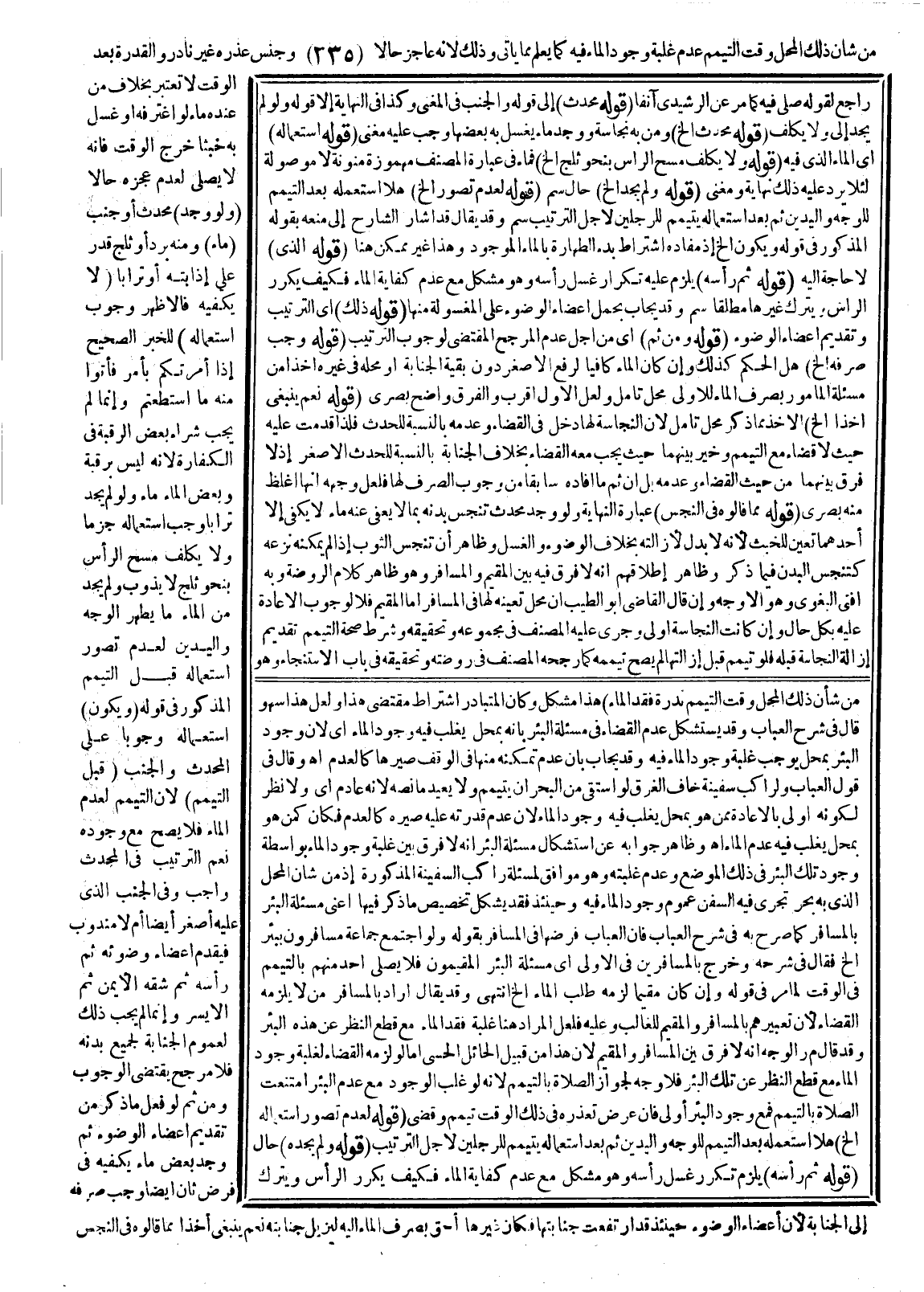 ـــــــــــــــــــــــــــــSمِنْ شَأْنِ ذَلِكَ الْمَحَلِّ وَقْتَ التَّيَمُّمِ نُدْرَةُ فَقْدِ الْمَاءِ) هَذَا مُشْكِلٌ وَكَانَ الْمُتَبَادَرُ اشْتِرَاطَ مُقْتَضَى هَذَا وَلَعَلَّ هَذَا سَهْوٌ قَالَ فِي شَرْحِ الْعُبَابِ، وَقَدْ يُسْتَشْكَلُ عَدَمُ الْقَضَاءِ فِي مَسْأَلَةِ الْبِئْرِ بِأَنَّهُ بِمَحَلٍّ يَغْلِبُ فِيهِ وُجُودُ الْمَاءِ أَيْ؛ لِأَنَّ وُجُودَ الْبِئْرِ بِمَحَلٍّ يُوجِبُ غَلَبَةَ وُجُودِ الْمَاءِ فِيهِ وَقَدْ يُجَابُ بِأَنَّ عَدَمَ تَمَكُّنِهِ مِنْهَا فِي الْوَقْتِ صَيَّرَهَا كَالْعَدَمِ اهـ وَقَالَ فِي قَوْلِ الْعُبَابِ وَلِرَاكِبِ سَفِينَةٍ خَافَ الْغَرَقَ لَوْ اسْتَقَى مِنْ الْبَحْرِ أَنْ يَتَيَمَّمَ وَلَا يُعِيدُ مَا نَصُّهُ؛ لِأَنَّهُ عَادِمٌ أَيْ وَلَا نَظَرَ لِكَوْنِهِ أَوْلَى بِالْإِعَادَةِ مِمَّنْ هُوَ بِمَحَلٍّ يَغْلِبُ فِيهِ وُجُودُ الْمَاءِ؛ لِأَنَّ عَدَمَ قُدْرَتِهِ عَلَيْهِ صَيَّرَهُ كَالْعَدَمِ فَكَانَ كَمَنْ هُوَ بِمَحَلٍّ يَغْلِبُ فِيهِ عَدَمُ الْمَاءِ اهـ