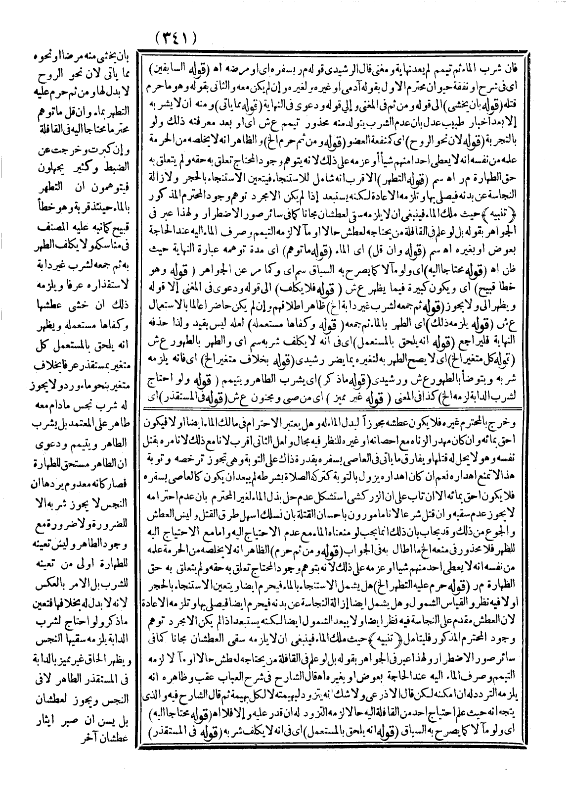 ـــــــــــــــــــــــــــــSوَخَرَجَ بِالْمُحْتَرَمِ غَيْرُهُ فَلَا يَكُونُ عَطَشُهُ مُجَوِّزًا لِبَذْلِ الْمَاءِ لَهُ وَهَلْ يُعْتَبَرُ الِاحْتِرَامُ فِي مَالِكِ الْمَاءِ أَيْضًا أَوْ لَا فَيَكُونُ أَحَقَّ بِمَائِهِ وَإِنْ كَانَ مُهْدَرًا لِزِنَاهُ مَعَ إحْصَانِهِ أَوْ غَيْرِهِ لِلنَّظَرِ فِيهِ مَجَالٌ وَلَعَلَّ الثَّانِيَ أَقْرَبُ؛ لِأَنَّا مَعَ ذَلِكَ لَا نَأْمُرُهُ بِقَتْلِ نَفْسِهِ وَهُوَ لَا يَحِلُّ لَهُ قَتْلُهَا وَيُفَارِقُ مَا يَأْتِي فِي الْعَاصِي بِسَفَرِهِ بِقُدْرَةِ ذَاكَ عَلَى التَّوْبَةِ وَهِيَ تُجَوِّزُ تَرَخُّصَهُ وَتَوْبَةُ هَذَا لَا تَمْنَعُ إهْدَارَهُ نَعَمْ إنْ كَانَ إهْدَارُهُ يَزُولُ بِالتَّوْبَةِ كَتَرْكِهِ الصَّلَاةَ بِشَرْطِهِ لَمْ يَبْعُدْ أَنْ يَكُونَ كَالْعَاصِي بِسَفَرِهِ فَلَا يَكُونُ أَحَقَّ بِمَائِهِ إلَّا إنْ تَابَ عَلَى أَنَّ الزَّرْكَشِيَّ اسْتَشْكَلَ عَدَمَ حِلِّ بَذْلِ الْمَاءِ لِغَيْرِ الْمُحْتَرَمِ بِأَنَّ عَدَمَ احْتِرَامِهِ لَا يَجُوزُ عَدَمُ سَقْيِهِ وَإِنْ قُتِلَ شَرْعًا؛ لِأَنَّا مَأْمُورُونَ بِإِحْسَانِ الْقِتْلَةِ بِأَنْ نَسْلَك أَسْهَلَ طُرُقِ الْقَتْلِ وَلَيْسَ الْعَطَشُ وَالْجُوعُ مِنْ ذَلِكَ، وَقَدْ يُجَابُ بِأَنَّ ذَلِكَ إنَّمَا يَجِبُ لَوْ مَنَعْنَاهُ الْمَاءَ مَعَ عَدَمِ الِاحْتِيَاجِ إلَيْهِ. وَأَمَّا مَعَ الِاحْتِيَاجِ إلَيْهِ لِلطُّهْرِ فَلَا مَحْذُورَ فِي مَنْعِهِ إلَخْ مَا أَطَالَ بِهِ فِي الْجَوَابِ. (قَوْلُهُ: وَمِنْ ثَمَّ حَرُمَ) الظَّاهِرُ أَنَّهُ لَا يُخَلِّصُهُ مِنْ الْحُرْمَةِ عِلْمُهُ مِنْ نَفْسِهِ أَنَّهُ لَا يُعْطِي أَحَدًا مِنْهُمْ شَيْئًا أَوْ عَزْمُهُ عَلَى ذَلِكَ؛ لِأَنَّهُ بِتَوَهُّمِ وُجُودِ الْمُحْتَاجِ تَعَلَّقَ بِهِ حَقُّهُ وَلَمْ يَتَعَلَّقْ بِهِ حَقُّ الطَّهَارَةِ م ر. (قَوْلُهُ حَرُمَ عَلَيْهِ التَّطَهُّرُ إلَخْ) هَلْ يَشْمَلُ الِاسْتِنْجَاءَ بِالْمَاءِ فَيَحْرُمُ أَيْضًا وَيَتَعَيَّنُ الِاسْتِنْجَاءُ بِالْحَجَرِ أَوْ لَا فِيهِ نَظَرٌ وَالْقِيَاسُ الشُّمُولُ وَهَلْ يَشْمَلُ أَيْضًا إزَالَةَ النَّجَاسَةِ عَنْ بَدَنِهِ فَيَحْرُمُ أَيْضًا فَيُصَلِّي بِهَا وَتَلْزَمُهُ الْإِعَادَةُ؛ لِأَنَّ الْعَطَشَ مُقَدَّمٌ عَلَى النَّجَاسَةِ فِيهِ نَظَرٌ أَيْضًا وَلَا يَبْعُدُ الشُّمُولُ أَيْضًا لَكِنَّهُ يُسْتَبْعَدُ إذَا لَمْ يَكُنْ إلَّا مُجَرَّدَ تَوَهُّمِ وُجُودِ الْمُحْتَرَمِ الْمَذْكُورِ فَلْيُتَأَمَّلْ (تَنْبِيهٌ)