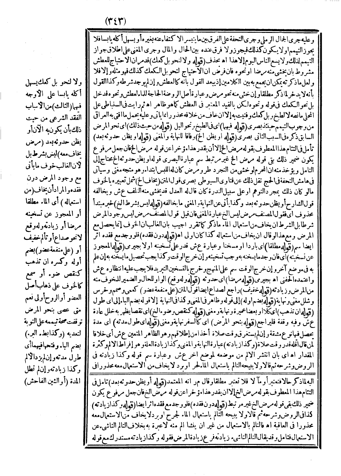 (الثَّالِثُ) مِنْ الْأَسْبَابِ الْفَقْدُ الشَّرْعِيُّ مِنْ حَيْثُ ذَلِكَ بِأَنْ يَكُونَ بِهِ الْآنَ أَوْ يَظُنَّ حُدُوثُهُ بَعْدُ (مَرَضٌ يَخَافُ مَعَهُ) لَيْسَ بِشَرْطٍ بَلْ؛ لِأَنَّ الْغَالِبَ خَوْفُ مَا يَأْتِي مَعَ وُجُودِ الْمَرَضِ دُونَ فَقْدِهِ وَالْمُرَادُ أَنْ يَخَافَ (مِنْ اسْتِعْمَالِهِ) أَيْ الْمَاءِ مُطْلَقًا أَوْ الْمَعْجُوزِ عَنْ تَسْخِينِهِ مَرَضًا أَوْ زِيَادَتَهُ وَلَهُ وَقْعٌ لَا نَحْوَ صُدَاعٍ أَوْ تَأَلُّمٍ خَفِيفٍ أَوْ (عَلَى مَنْفَعَةِ عُضْوٍ) بِضَمِّ أَوَّلِهِ وَكَسْرِهِ أَنْ تَذْهَبَ كَنَقْصِ ضَوْءٍ أَوْ سَمْعٍ فَالْخَوْفُ عَلَى ذَهَابِ أَصْلِ الْعُضْوِ أَوْ الرُّوحِ أَوْلَى نَعَمْ مَتَى عَصَى بِنَحْوِ الْمَرَضِ تَوَقَّفَتْ صِحَّةُ تَيَمُّمِهِ عَلَى التَّوْبَةِ لِتَعَدِّيهِ (وَكَذَا بُطْءُ الْبُرْءِ) بِضَمِّ الْبَاءِ وَفَتْحِهَا فِيهِمَا أَيْ طُولُ مُدَّتِهِ وَإِنْ لَمْ يَزِدْ الْأَلَمُ، وَكَذَا زِيَادَتُهُ وَإِنْ لَمْ تَطُلْ الْمُدَّةُ (أَوْ الشَّيْنُ الْفَاحِشُ)