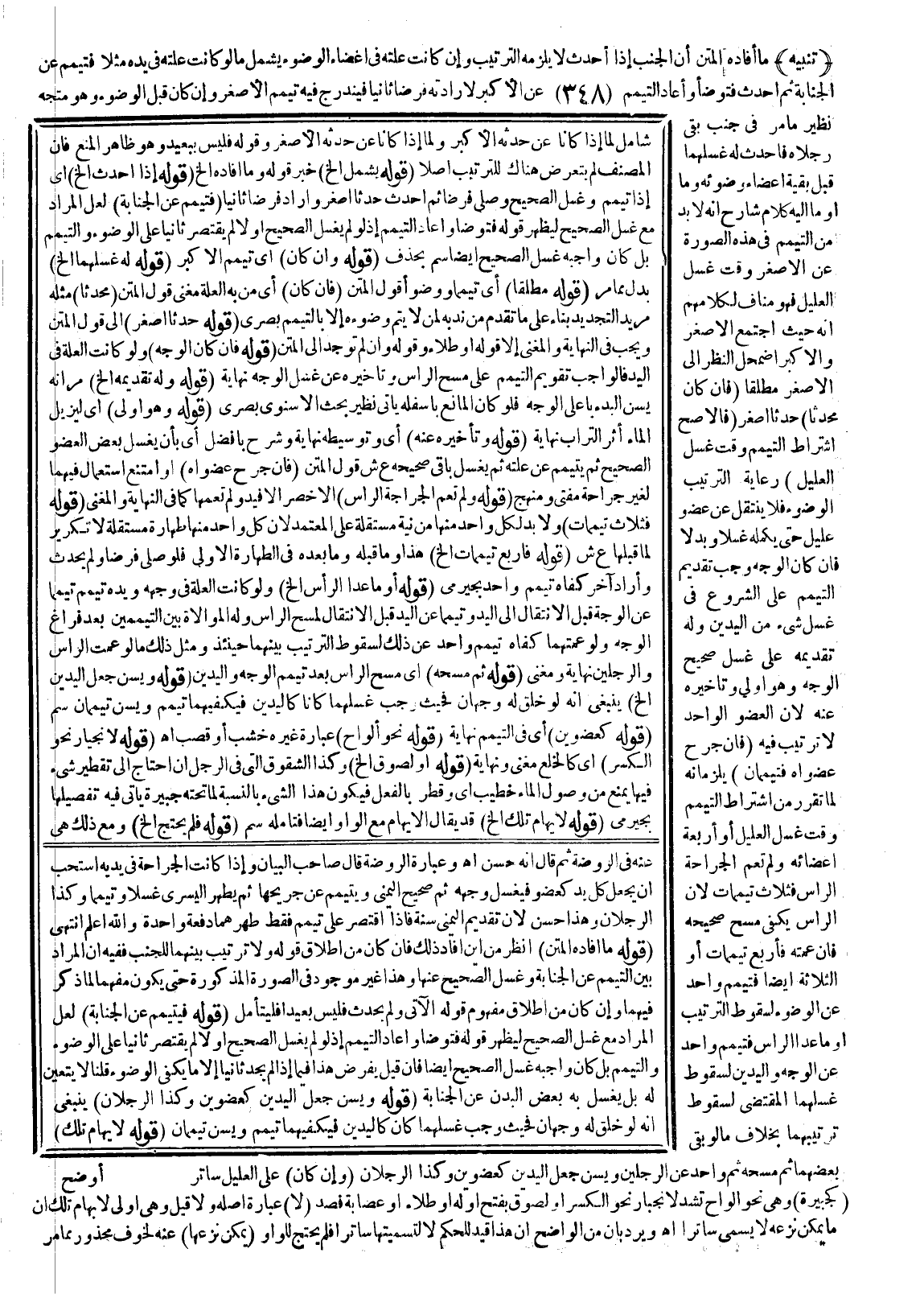 مَا أَفَادَهُ الْمَتْنُ أَنَّ الْجُنُبَ إذَا أَحْدَثَ لَا يَلْزَمُهُ التَّرْتِيبُ وَإِنْ كَانَتْ عِلَّتُهُ فِي أَعْضَاءِ الْوُضُوءِ يَشْمَلُ مَا لَوْ كَانَتْ عِلَّتُهُ فِي يَدِهِ مَثَلًا فَتَيَمَّمَ عَنْ الْجَنَابَةِ، ثُمَّ أَحْدَثَ فَتَوَضَّأَ وَأَعَادَ التَّيَمُّمَ عَنْ الْأَكْبَرِ لِإِرَادَتِهِ فَرْضًا ثَانِيًا فَيَنْدَرِجُ فِيهِ تَيَمُّمُ الْأَصْغَرِ وَإِنْ كَانَ قَبْلَ الْوُضُوءِ وَهُوَ مُتَّجَهٌ نَظِيرُ مَا مَرَّ فِي جُنُبٍ بَقِيَ رِجْلَاهُ فَأَحْدَثَ لَهُ غَسْلُهُمَا قَبْلَ بَقِيَّةِ أَعْضَاءِ وُضُوئِهِ وَمَا أَوْمَأَ إلَيْهِ كَلَامُ شَارِحٍ أَنَّهُ لَا بُدَّ مِنْ التَّيَمُّمِ فِي هَذِهِ الصُّورَةِ عَنْ الْأَصْغَرِ وَقْتَ غُسْلِ الْعَلِيلِ فَهُوَ مُنَافٍ لِكَلَامِهِمْ أَنَّهُ حَيْثُ اجْتَمَعَ الْأَصْغَرُ وَالْأَكْبَرُ اضْمَحَلَّ النَّظَرُ إلَى الْأَصْغَرِ مُطْلَقًا.