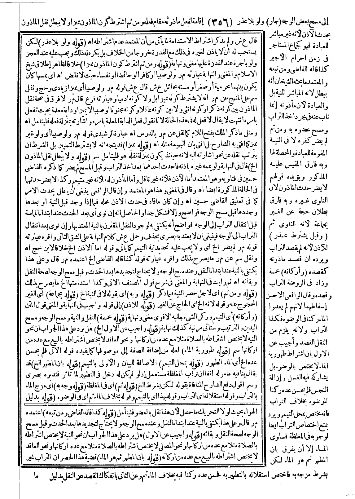 إلَى مَسْحِ بَعْضِ الْوَجْهِ (جَازَ) ، وَلَوْ بِلَا عُذْرٍ إقَامَةً لِفِعْلِ مَأْذُونِهِ مَقَامَ فِعْلِهِ، وَمِنْ ثَمَّ اُشْتُرِطَ كَوْنُ الْمَأْذُونِ مُمَيِّزًا وَلَا يَبْطُلُ نَقْلُ الْمَأْذُونِ بِحَدَثِ الْآذِنِ؛ لِأَنَّهُ غَيْرُ مُبَاشِرٍ لِلْعِبَادَةِ فَهُوَ كَجِمَاعِ الْمُسْتَأْجِرِ فِي زَمَنِ إحْرَامِ الْأَجِيرِ كَذَا قَالَهُ الْقَاضِي وَمَنْ تَبِعَهُ وَالْمُعْتَمَدُ مَا بَحَثَهُ الشَّيْخَانِ أَنَّهُ يَبْطُلُ؛ لِأَنَّهُ الْمُبَاشِرُ لِلنِّيَّةِ بَلْ وَالْعِبَادَةِ؛ لِأَنَّ مَأْذُونَهُ إنَّمَا نَابَ عَنْهُ فِي مُجَرَّدِ أَخْذِ التُّرَابِ وَمَسْحِ عُضْوِهِ بِهِ وَمِنْ ثَمَّ لَمْ يَضُرَّ كُفْرُهُ لَا فِي النِّيَّةِ الْمُقَوِّمَةِ لِلْعِبَادَةِ وَالْمُحَصِّلَةِ لَهَا وَبِهِ فَارَقَ الْمَقِيسَ عَلَيْهِ الْمَذْكُورَ وَيُؤَيِّدُهُ قَوْلُهُمْ لَا يَضُرُّ حَدَثُ الْمَأْذُونِ؛ لِأَنَّ النَّاوِيَ غَيْرُهُ وَبِهِ فَارَقَ بُطْلَانَ حَجِّهِ عَنْ الْغَيْرِ بِجِمَاعِهِ؛ لِأَنَّهُ النَّاوِي ثَمَّ (وَقِيلَ يُشْتَرَطُ عُذْرٌ) لِلْآذِنِ؛ لِأَنَّهُ لَمْ يَقْصِدْ التُّرَابَ وَيَرُدُّهُ أَنَّ قَصْدَ مَأْذُونِهِ كَقَصْدِهِ.