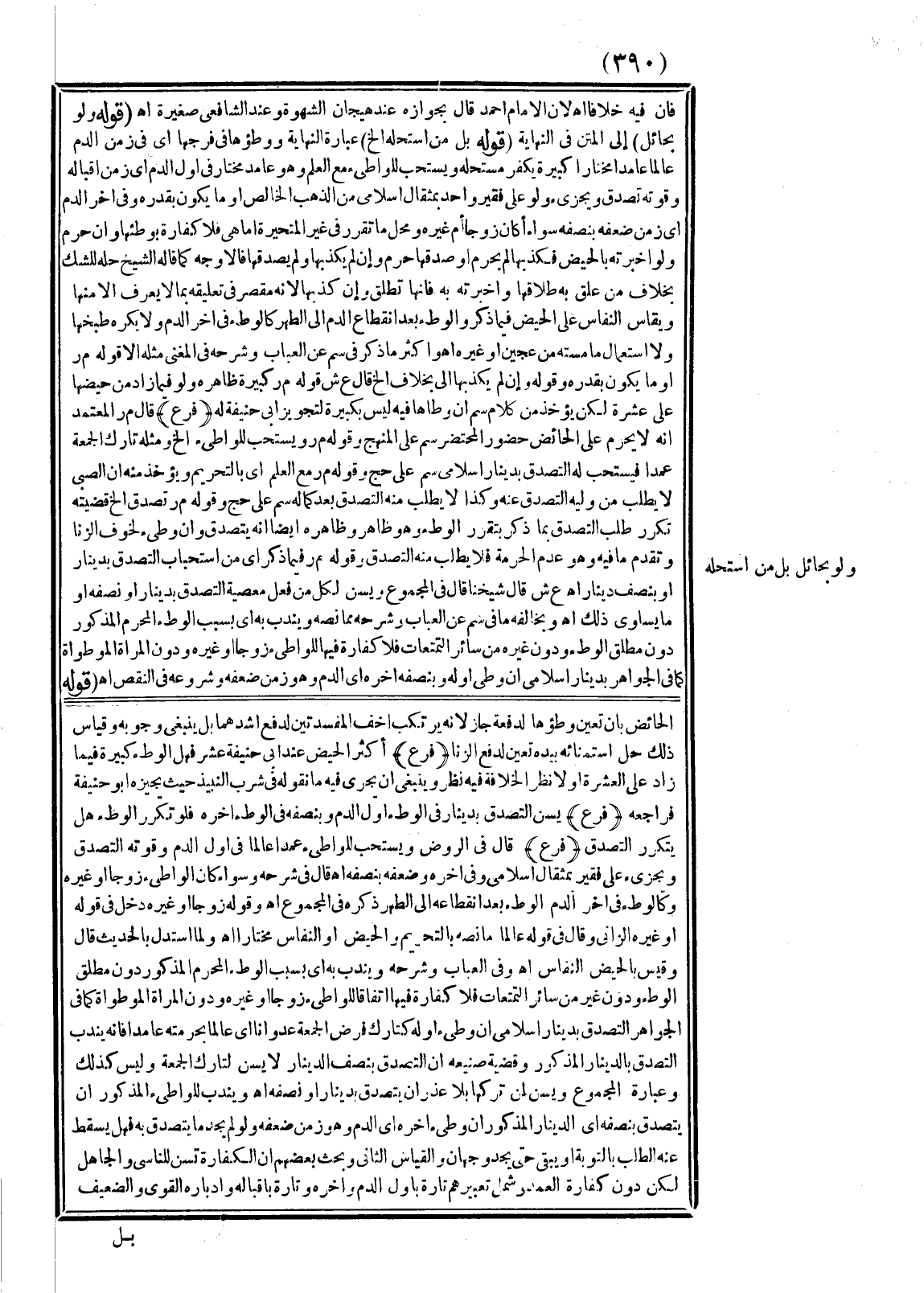 وَجْهَانِ وَالْقِيَاسُ الثَّانِي وَبَحَثَ بَعْضُهُمْ أَنَّ الْكَفَّارَةَ تُسَنُّ أَيْضًا لِلنَّاسِي وَالْجَاهِلِ لَكِنْ دُونَ كَفَّارَةِ الْعَمْدِ وَشَمِلَ تَعْبِيرُهُمْ تَارَةً بِأَوَّلِ الدَّمِ وَآخِرِهِ وَتَارَةً بِإِقْبَالِهِ وَإِدْبَارِهِ الْقَوِيِّ وَالضَّعِيفِ