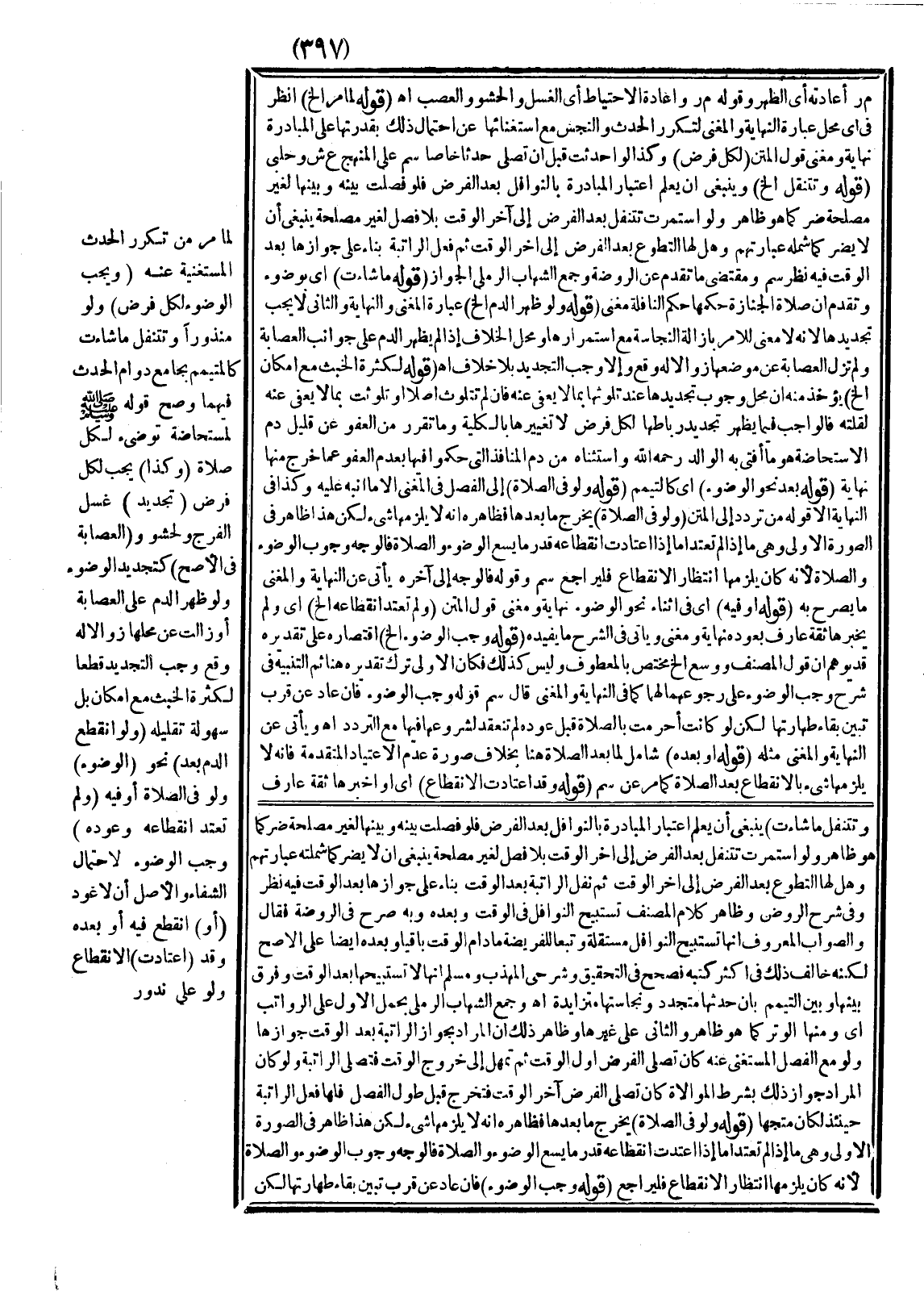 (وَلَوْ انْقَطَعَ الدَّمُ بَعْدَ) نَحْوِ (الْوُضُوءِ) ، وَلَوْ فِي الصَّلَاةِ أَوْ فِيهِ (وَلَمْ تَعْتَدَّ انْقِطَاعُهُ وَعَوْدُهُ) وَجَبَ الْوُضُوءُ لِاحْتِمَالِ الشِّفَاءِ وَالْأَصْلُ أَنْ لَا عَوْدَ (أَوْ) انْقَطَعَ فِيهِ أَوْ بَعْدَهُ، وَقَدْ (اعْتَادَتْ) الِانْقِطَاعَ، وَلَوْ عَلَى نُدُورٍ