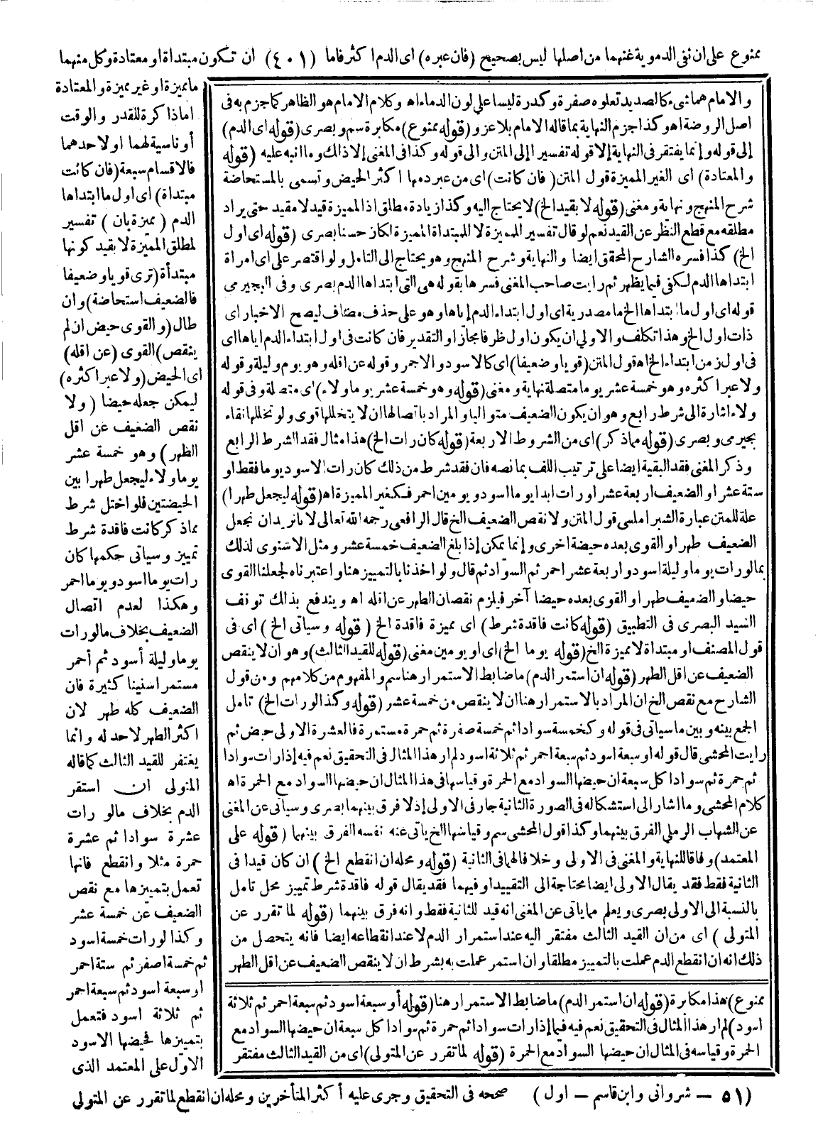 (فَإِنْ عَبَرَهُ) أَيْ الدَّمُ أَكْثَرَهُ فَإِمَّا أَنْ تَكُونَ مُبْتَدَأَةً أَوْ مُعْتَادَةً، وَكُلٌّ مِنْهُمَا مَا مُمَيِّزَةٌ أَوْ غَيْرُ مُمَيِّزَةٍ وَالْمُعْتَادَةُ إمَّا ذَاكِرَةً لِلْقَدْرِ وَالْوَقْتِ أَوْ نَاسِيَةً لَهُمَا أَوْ لِأَحَدِهِمَا فَالْأَقْسَامُ سَبْعَةٌ (فَإِنْ كَانَتْ مُبْتَدَأَةً) أَيْ أَوَّلُ مَا ابْتَدَأَهَا الدَّمُ (مُمَيِّزَةٌ بِأَنْ) تَفْسِيرٌ لِمُطْلَقِ الْمُمَيِّزَةِ لَا بِقَيْدِ كَوْنِهَا مُبْتَدَأَةً (تَرَى قَوِيًّا وَضَعِيفًا فَالضَّعِيفُ اسْتِحَاضَةٌ) ، وَإِنْ طَالَ (وَالْقَوِيُّ حَيْضٌ إنْ لَمْ يَنْقُصْ) الْقَوِيُّ (عَنْ أَقَلِّهِ) أَيْ الْحَيْضِ (وَلَا عَبَرَ أَكْثَرُهُ) لِيُمْكِنَ جَعْلُهُ حَيْضًا (وَلَا نَقَصَ الضَّعِيفُ عَنْ أَقَلِّ الطُّهْرِ) وَهُوَ خَمْسَةَ عَشَرَ يَوْمًا وِلَاءً لِيُجْعَلَ طُهْرًا بَيْنَ الْحَيْضَتَيْنِ فَلَوْ اخْتَلَّ شَرْطٌ مِمَّا ذُكِرَ كَانَتْ فَاقِدَةَ شَرْطِ تَمْيِيزٍ وَسَيَأْتِي حُكْمُهَا كَأَنْ رَأَتْ يَوْمًا أَسْوَدَ وَيَوْمًا أَحْمَرَ وَهَكَذَا لِعَدَمِ اتِّصَالِ الضَّعِيفِ بِخِلَافِ مَا لَوْ رَأَتْ يَوْمًا وَلَيْلَةً أَسْوَدَ، ثُمَّ أَحْمَرَ مُسْتَمِرًّا سِنِينَا كَثِيرَةً فَإِنَّ الضَّعِيفَ كُلَّهُ طُهْرٌ؛ لِأَنَّ أَكْثَرَ الطُّهْرِ لَا حَدَّ لَهُ
