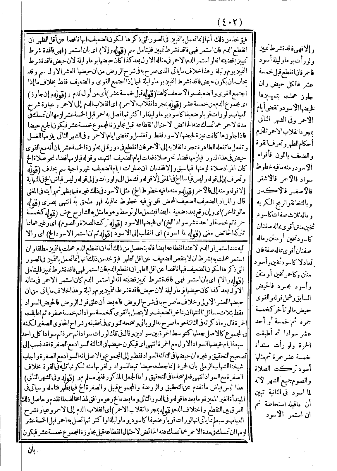 وَإِلَّا فَهِيَ فَاقِدَةُ شَرْطِ تَمْيِيزٍ، وَلَوْ رَأَتْ يَوْمًا وَلَيْلَةً أَسْوَدَ فَأَحْمَرَ فَإِنْ انْقَطَعَ قَبْلَ خَمْسَةَ عَشَرَ فَالْكُلُّ حَيْضٌ، وَإِنْ جَاوَزَ عَمِلَتْ بِتَمْيِيزِهَا فَحَيْضُهَا الْأَسْوَدُ وَتَقْضِي أَيَّامَ الْأَحْمَرِ وَفِي الشَّهْرِ الثَّانِي بِمُجَرَّدِ انْقِلَابِ الْأَحْمَرِ تَلْتَزِمُ أَحْكَامَ الطُّهْرِ وَتَعْرِفُ الْقُوَّةَ وَالضَّعْفَ بِاللَّوْنِ فَأَقْوَاهُ الْأَسْوَدُ وَمِنْهُ مَا فِيهِ خُطُوطُ سَوَادٍ فَالْأَحْمَرُ فَالْأَشْقَرُ فَالْأَصْفَرُ فَالْأَكْدَرُ وَبِالثَّخَانَةِ وَالرِّيحِ الْكَرِيهِ وَمَا لَهُ ثَلَاثُ صِفَاتٍ كَأَسْوَدَ ثَخِينٍ مُنْتِنٍ أَقْوَى مِمَّا لَهُ صِفَتَانِ كَأَسْوَدَ ثَخِينٍ أَوْ مُنْتِنٍ وَمَا لَهُ صِفَتَانِ أَقْوَى مِمَّا لَهُ صِفَةٌ