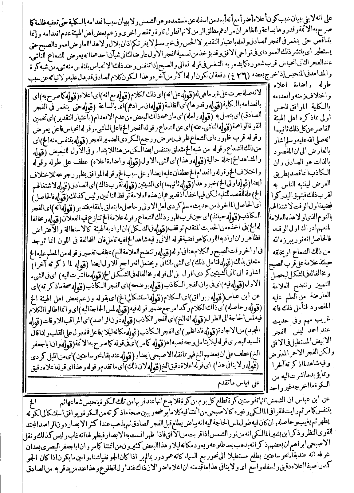 عَلَى أَنَّهُ لَا يَفِي بِبَيَانِ سَبَبِ كَوْنِ أَعْلَاهُ أَضْوَأَ مَعَ أَنَّهُ أَبْعَدُ مِنْ أَسْفَلِهِ مِنْ مُسْتَمَدِّهِ وَهُوَ الشَّمْسُ وَلَا بِبَيَانِ سَبَبِ انْعِدَامِهِ بِالْكُلِّيَّةِ حَتَّى تَعْقُبَهُ ظُلْمَةٌ كَمَا صَرَّحَ بِهِ الْأَئِمَّةُ وَقَدَّرُوهَا بِسَاعَةٍ، وَالظَّاهِرُ أَنَّ مُرَادَهُمْ مُطْلَقُ الزَّمَنِ؛ لِأَنَّهَا تَطُولُ تَارَةً وَتَقْصُرُ أُخْرَى وَزَعَمَ بَعْضُ أَهْلِ الْهَيْئَةِ عَدَمَ انْعِدَامِهِ وَإِنَّمَا يَتَنَاقَصُ حَتَّى يَنْغَمِرَ فِي الْفَجْرِ الصَّادِقِ وَلَعَلَّهُ بِاعْتِبَارِ التَّقْدِيرِ لَا الْحِسِّ وَفِي خَبَرِ مُسْلِمٍ «لَا يَغُرَّنَّكُمْ أَذَانُ بِلَالٍ وَلَا هَذَا الْعَارِضُ لِعَمُودِ الصُّبْحِ حَتَّى يَسْتَطِيرَ» أَيْ يَنْتَشِرَ ذَلِكَ الْعَمُودُ أَيْ فِي نَوَاحِي الْأُفُقِ وَقَدْ يُؤْخَذُ مِنْ تَسْمِيَةِ الْفَجْرِ الْأَوَّلِ عَارِضًا لِلثَّانِي شَيْئَانِ أَحَدُهُمَا أَنَّهُ يَعْرِضُ لِلشُّعَاعِ النَّاشِئِ عِنْدَ الْفَجْرِ الثَّانِي انْحِبَاسُ قُرْبِ ظُهُورِهِ كَمَا يُشْعِرُ بِهِ التَّنَفُّسُ فِي قَوْله تَعَالَى {وَالصُّبْحِ إِذَا تَنَفَّسَ} [التكوير: 18] وَعِنْدَ ذَلِكَ الِانْحِبَاسِ يَتَنَفَّسُ مِنْهُ شَيْءٌ مِنْ شِبْهِ كُوَّةٍ، وَالْمُشَاهَدُ فِي الْمُنْحَبِسِ إذَا خَرَجَ بَعْضُهُ دَفْعَةً أَنْ يَكُونَ أَوَّلُهُ أَكْثَرَ مِنْ آخِرِهِ وَهَذَا لِكَوْنِ كَلَامِ الصَّادِقِ قَدْ يَدُلُّ عَلَيْهِ وَلِإِنْبَائِهِ عَنْ سَبَبِ طُولِهِ وَإِضَاءَةِ أَعْلَاهُ وَاخْتِلَافِ زَمَنِهِ وَانْعِدَامِهِ بِالْكُلِّيَّةِ الْمُوَافِقِ لِلْحِسِّ أَوْلَى مِمَّا ذَكَرَهُ أَهْلُ الْهَيْئَةِ الْقَاصِرِ عَنْ كُلِّ ذَلِكَ، ثَانِيهِمَا أَنَّهُ - صَلَّى اللَّهُ عَلَيْهِ وَسَلَّمَ - أَشَارَ بِالْعَارِضِ إلَى أَنَّ الْمَقْصُودَ بِالذَّاتِ هُوَ الصَّادِقُ وَأَنَّ الْكَاذِبَ إنَّمَا قُصِدَ بِطَرِيقِ الْعَرْضِ لِيَتَنَبَّهَ النَّاسُ بِهِ لِقُرْبِ ذَلِكَ فَيَتَهَيَّئُوا لِيُدْرِكُوا فَضِيلَةَ أَوَّلِ الْوَقْتِ لِاشْتِغَالِهِمْ بِالنَّوْمِ الَّذِي لَوْلَا هَذِهِ الْعَلَامَةُ لَمَنَعَهُمْ إدْرَاكَ أَوَّلِ الْوَقْتِ فَالْحَاصِلُ أَنَّهُ نُورٌ يُبْرِزُهُ اللَّهُ مِنْ ذَلِكَ الشُّعَاعِ، أَوْ يَخْلُقُهُ حِينَئِذٍ عَلَامَةً عَلَى قُرْبِ الصُّبْحِ وَمُخَالِفًا لَهُ فِي الشَّكْلِ لِيَحْصُلَ التَّمْيِيزُ وَتَتَّضِحَ الْعَلَامَةُ الْعَارِضَةُ مِنْ الْمُعَلِّمِ عَلَيْهِ الْمَقْصُودِ فَتَأَمَّلْ ذَلِكَ فَإِنَّهُ غَرِيبٌ مُهِمٌّ